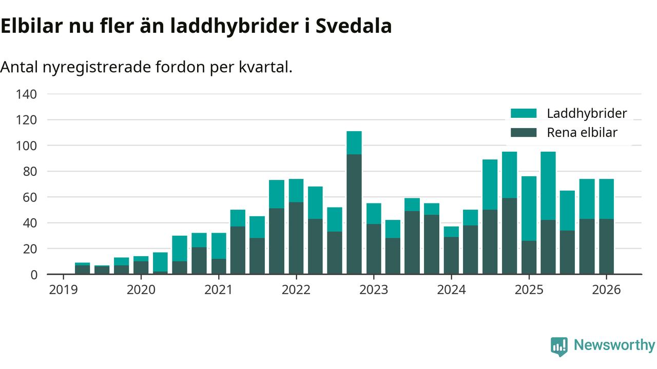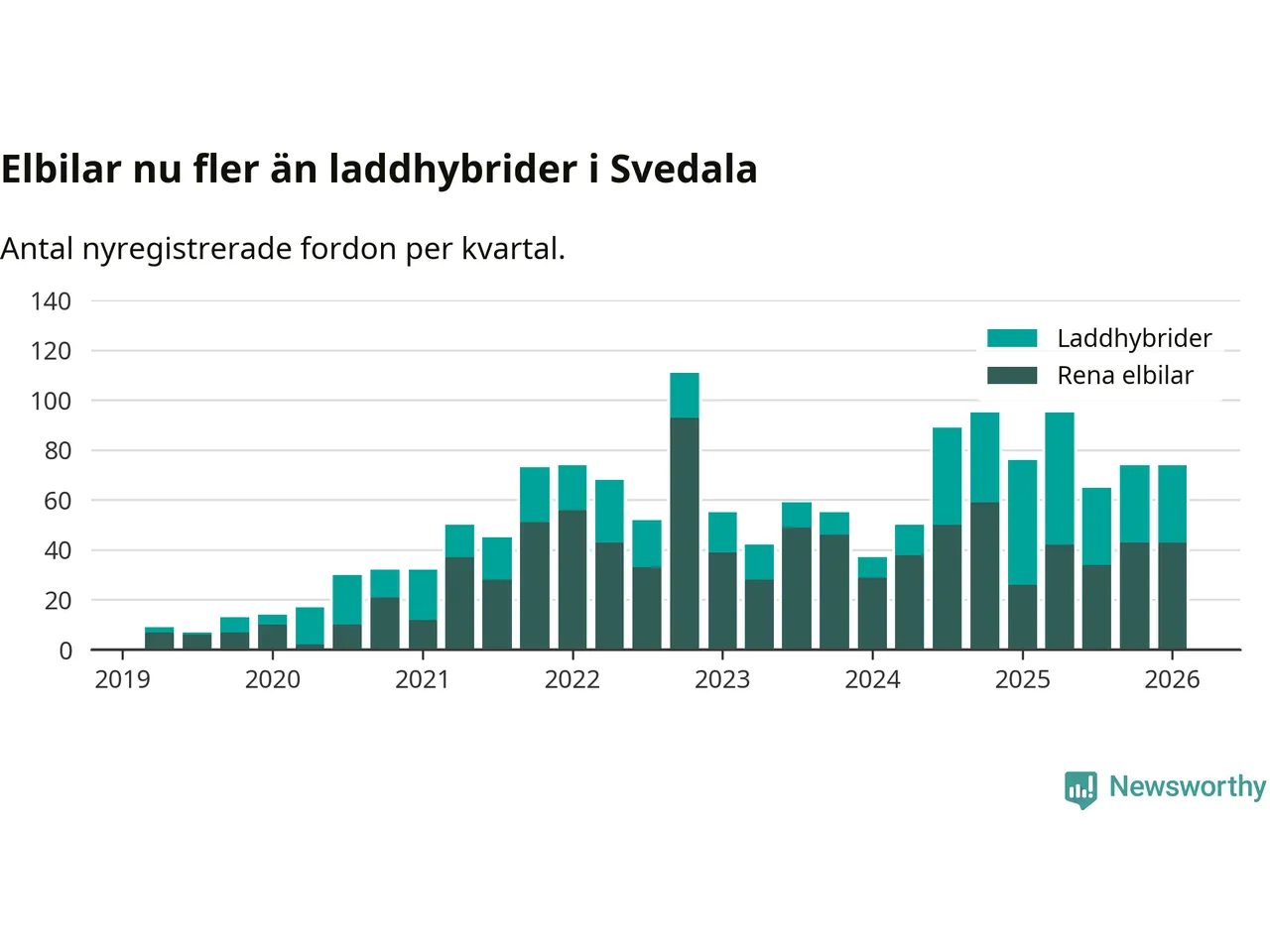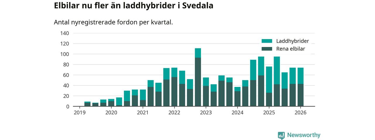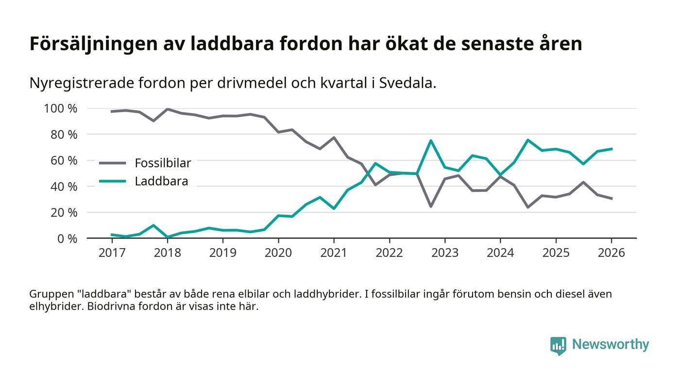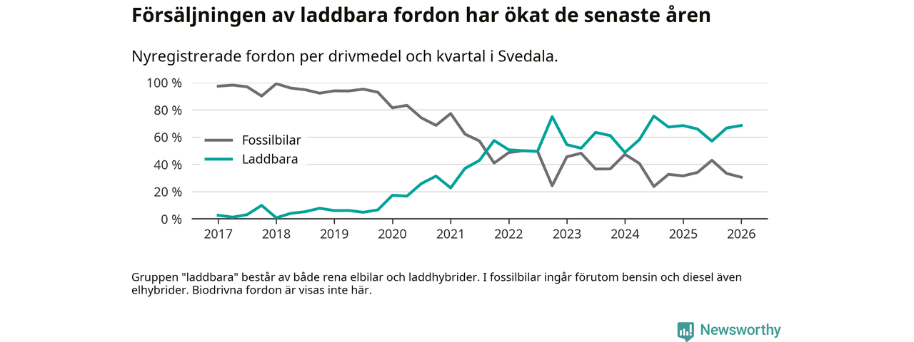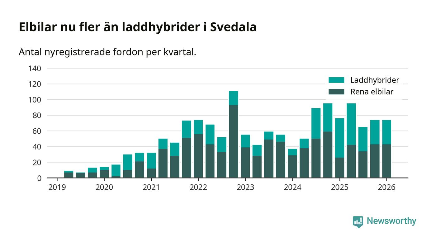 Under första kvartalet 2026 var 69 procent av alla nyregistrerade personbilar i Svedala laddbara (sammanlagt registrerades 108 nya bilar). Merparten av de laddbara bilarna var rena elbilar (40 procent av alla).