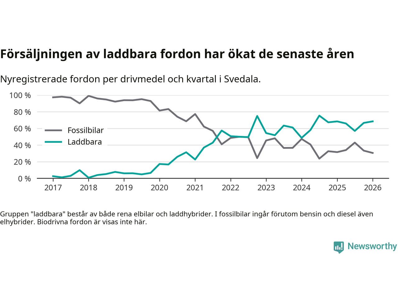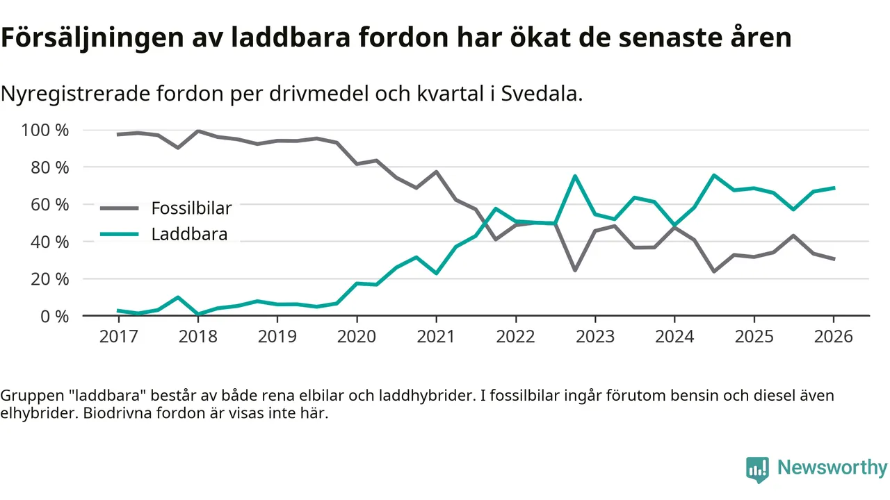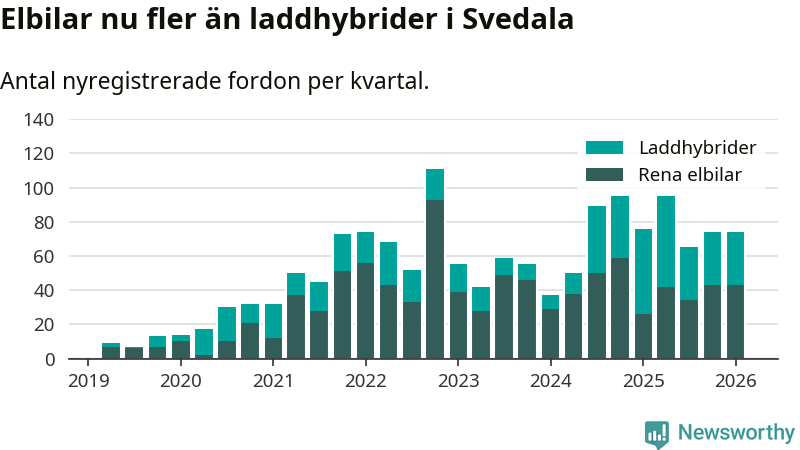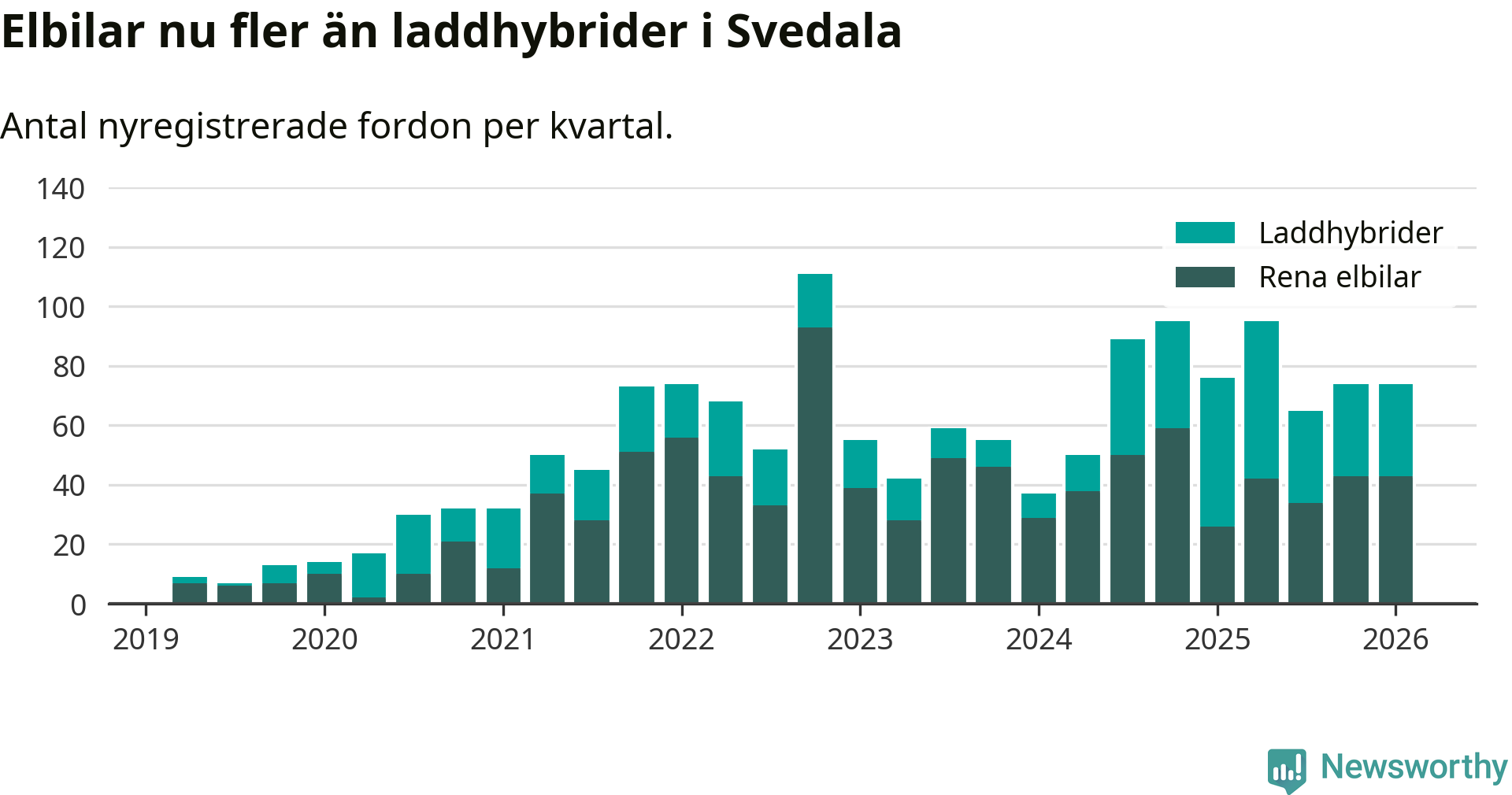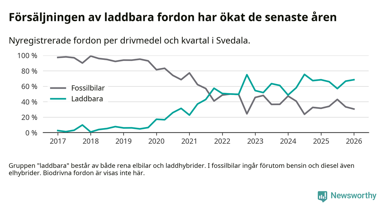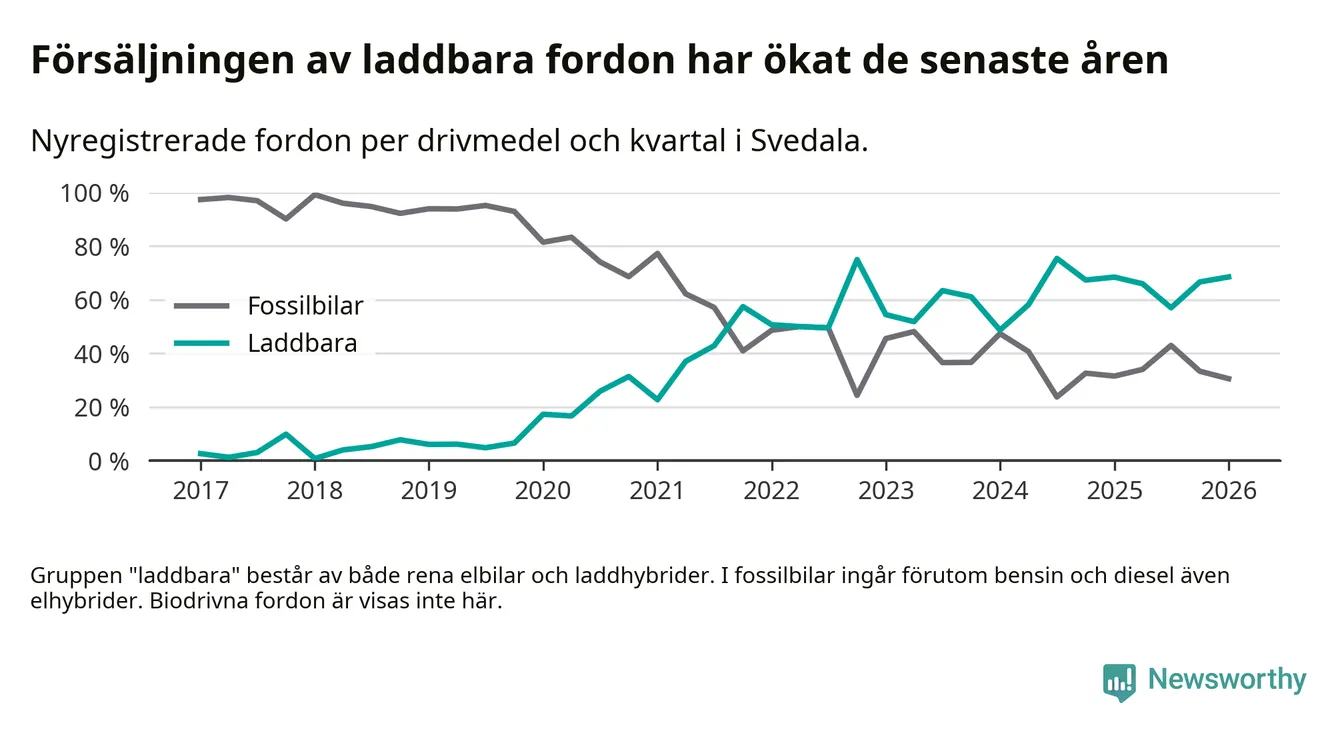 Under första kvartalet 2026 var 69 procent av alla nyregistrerade personbilar i Svedala laddbara (sammanlagt registrerades 108 nya bilar). Merparten av de laddbara bilarna var rena elbilar (40 procent av alla).