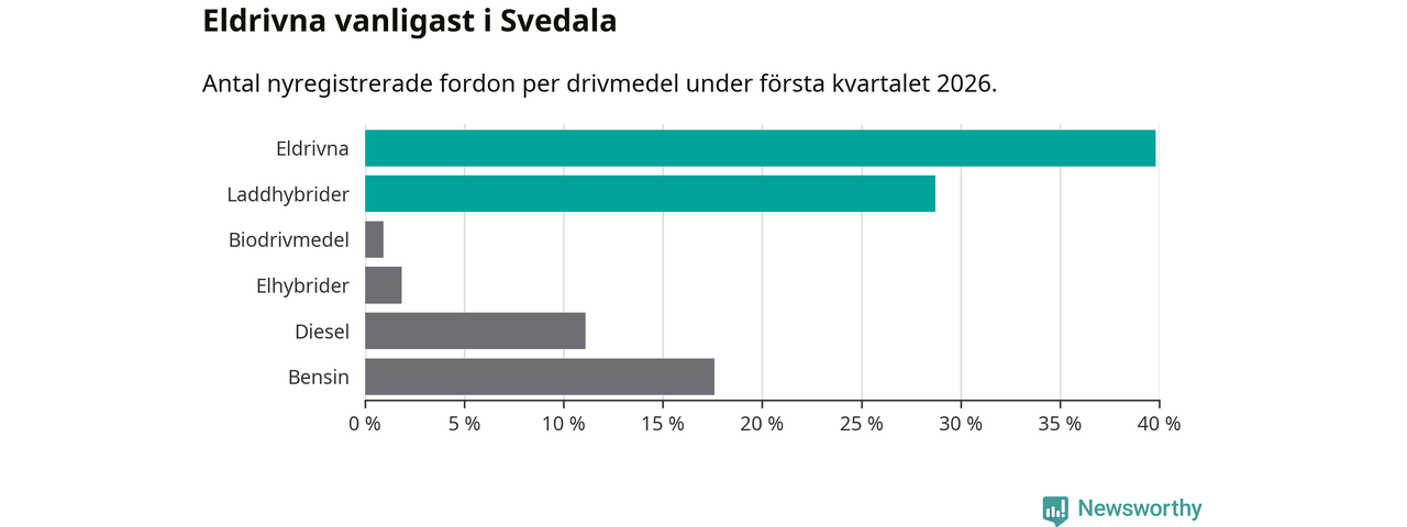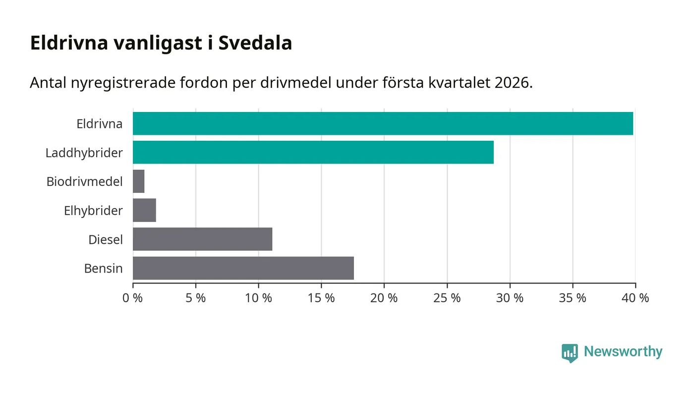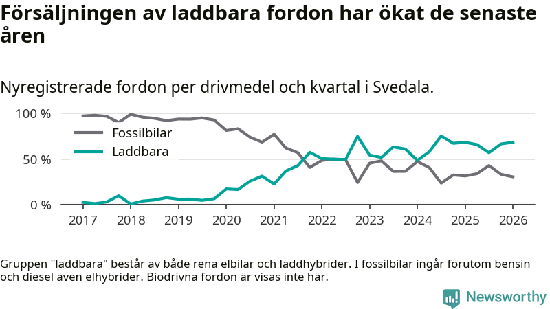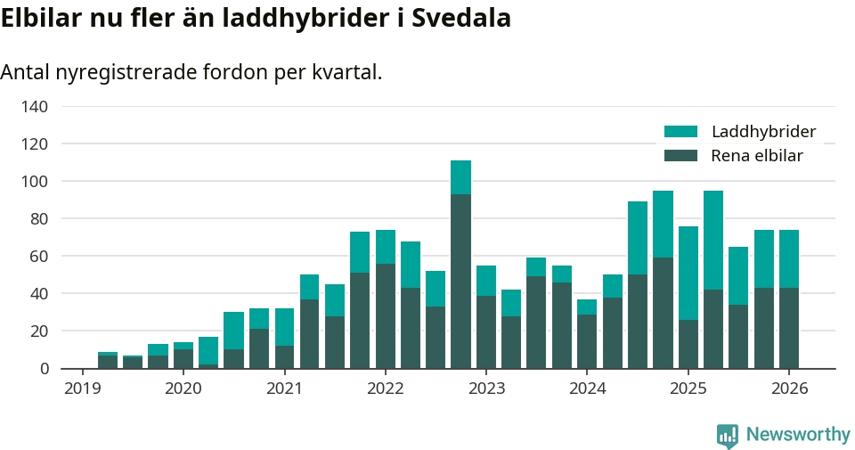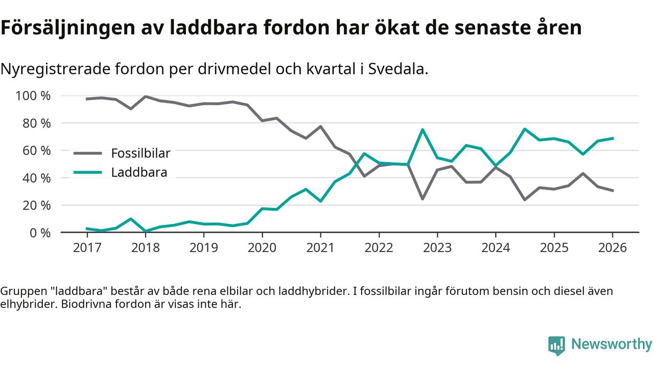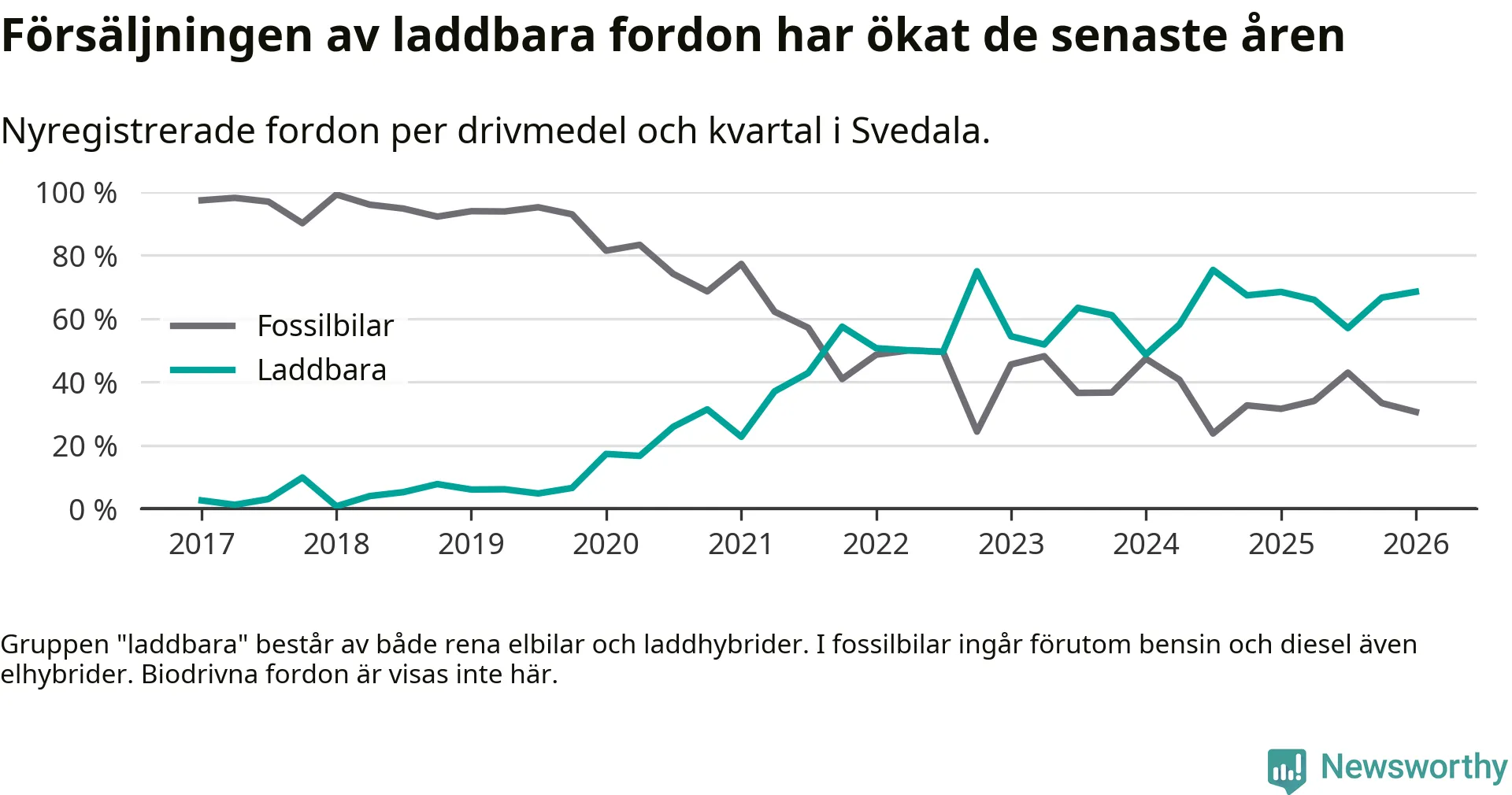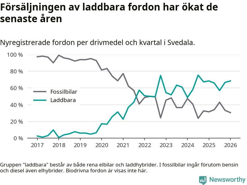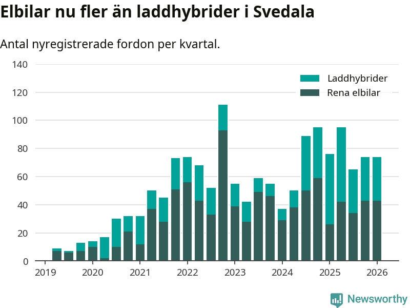 Under första kvartalet 2026 var 69 procent av alla nyregistrerade personbilar i Svedala laddbara (sammanlagt registrerades 108 nya bilar). Merparten av de laddbara bilarna var rena elbilar (40 procent av alla).