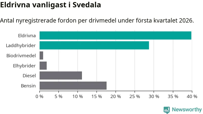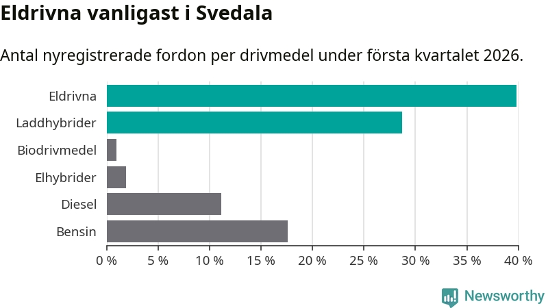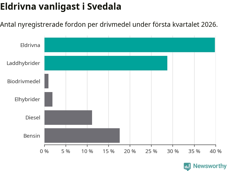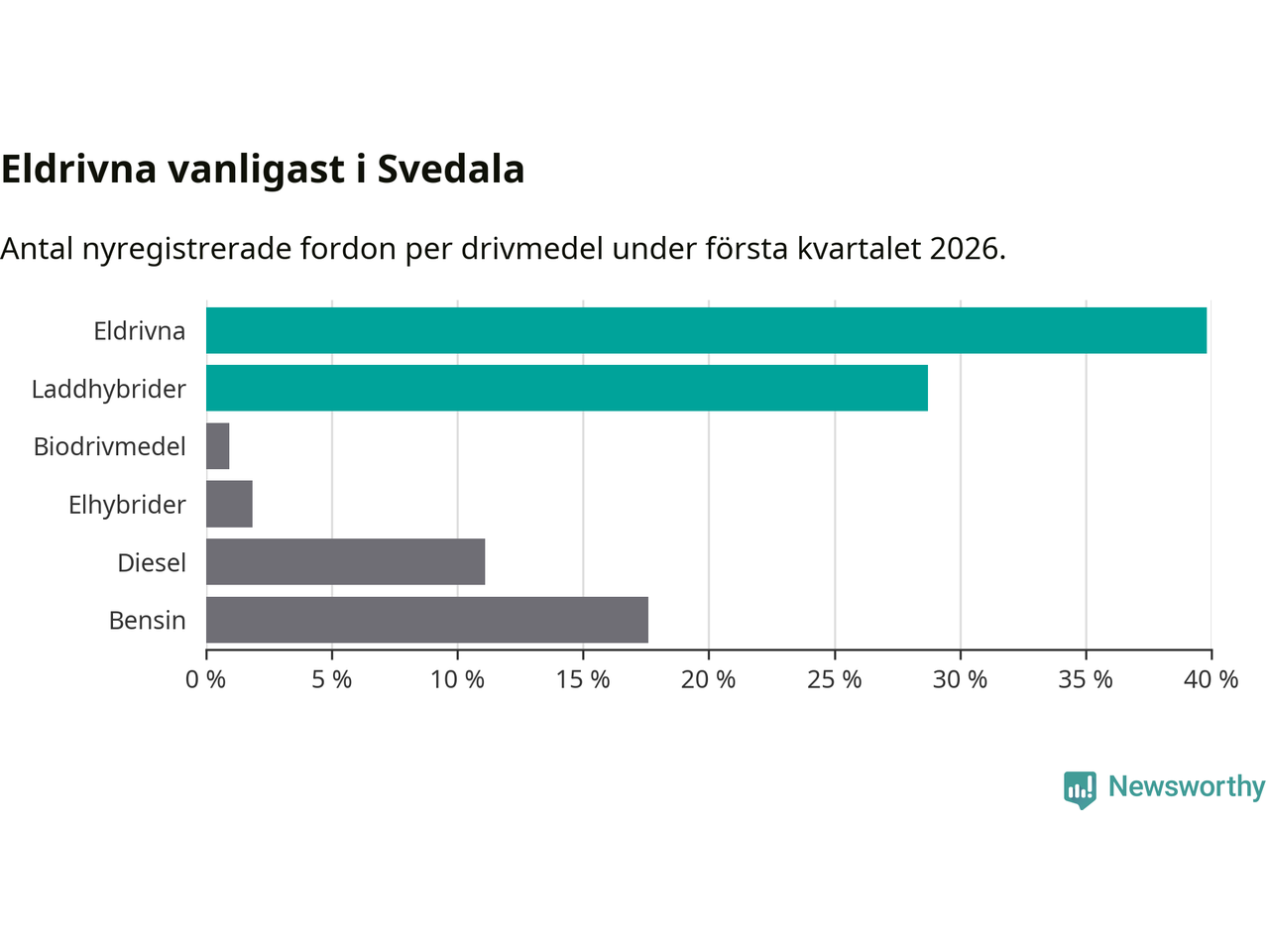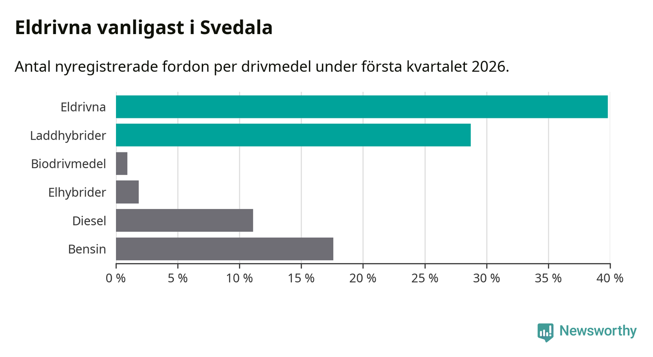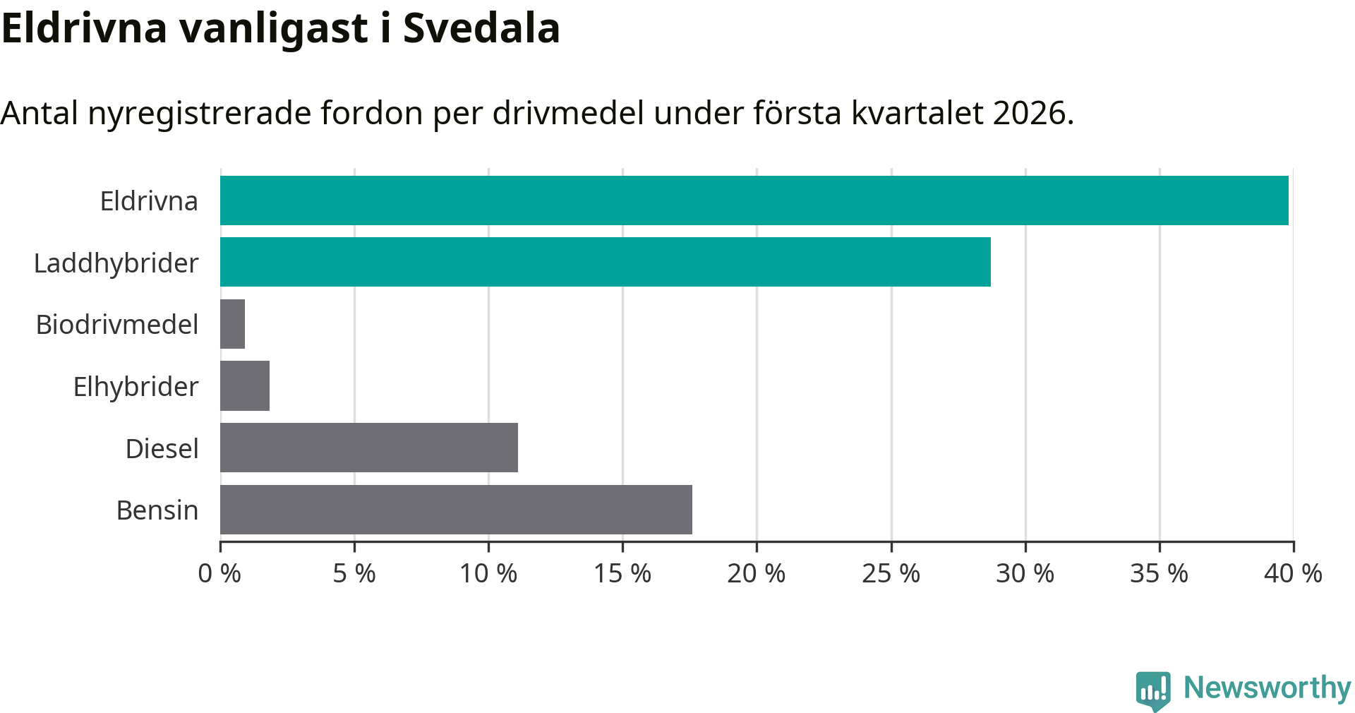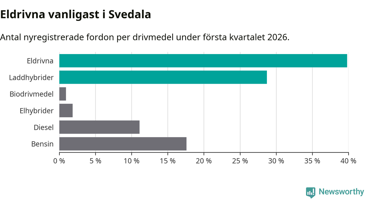 Under första kvartalet 2026 var 69 procent av alla nyregistrerade personbilar i Svedala laddbara (sammanlagt registrerades 108 nya bilar). Merparten av de laddbara bilarna var rena elbilar (40 procent av alla).