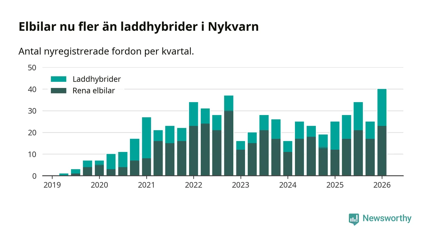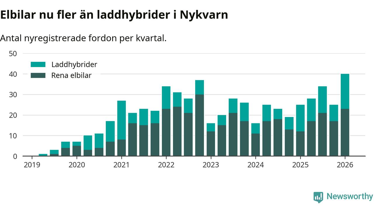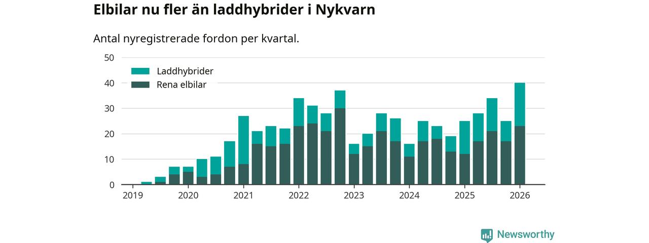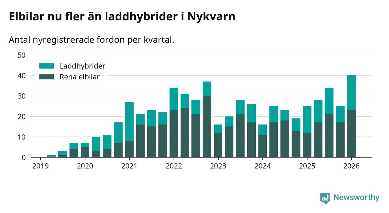 I Nykvarn noterades ett nytt rekord under första kvartalet. Aldrig tidigare har laddbara bilar utgjort en så stor del av alla nya bilar.