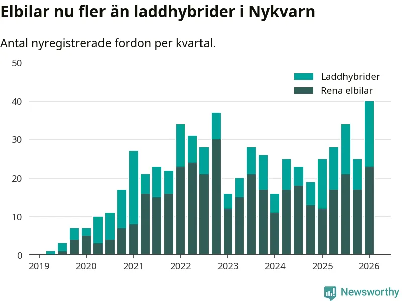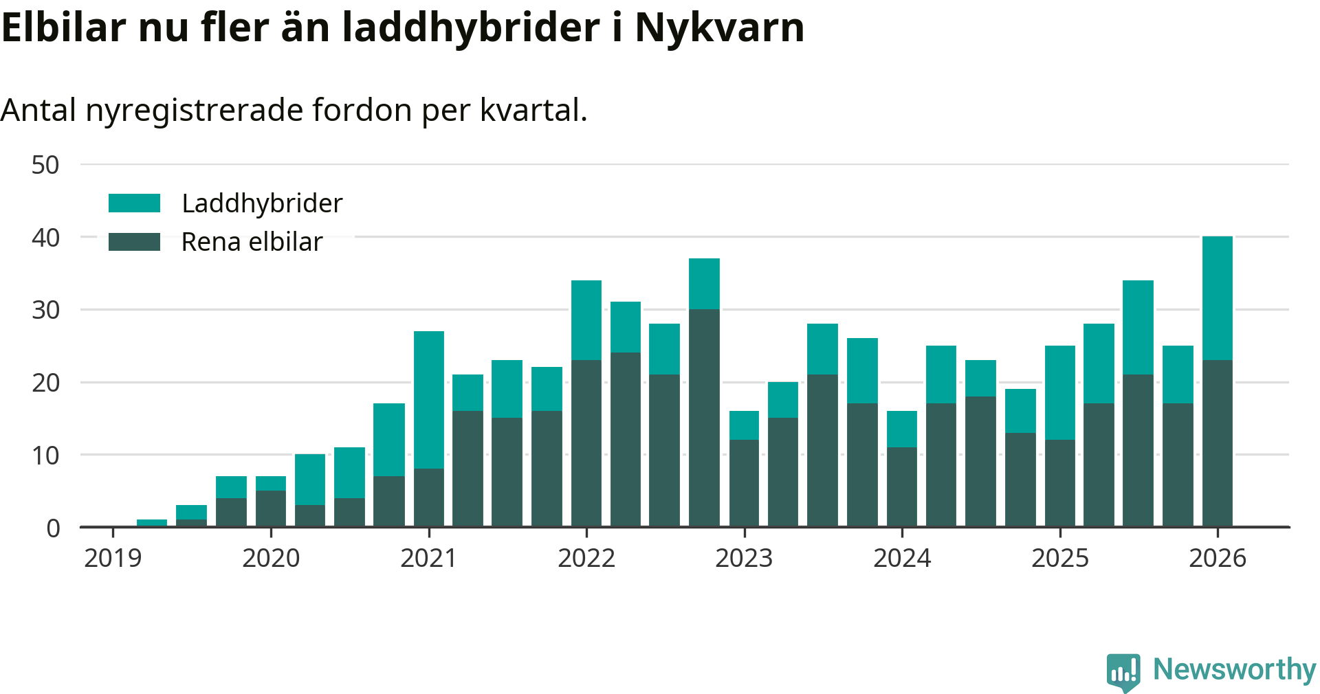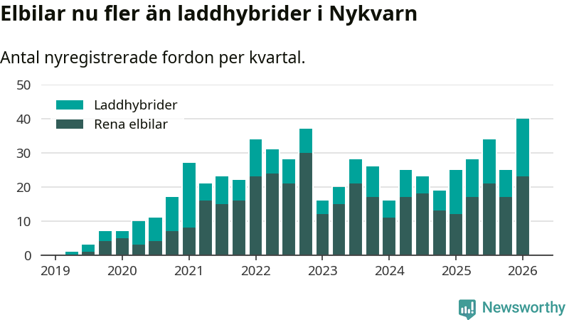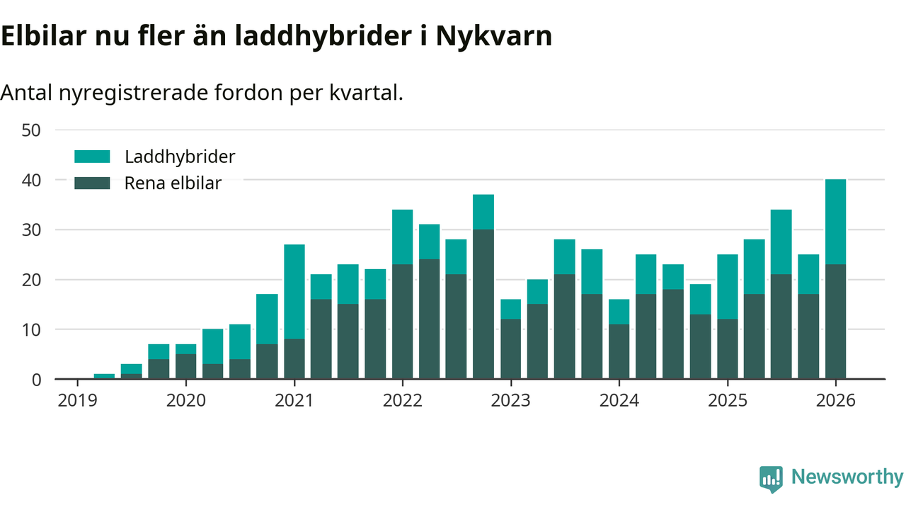 I Nykvarn noterades ett nytt rekord under första kvartalet. Aldrig tidigare har laddbara bilar utgjort en så stor del av alla nya bilar.