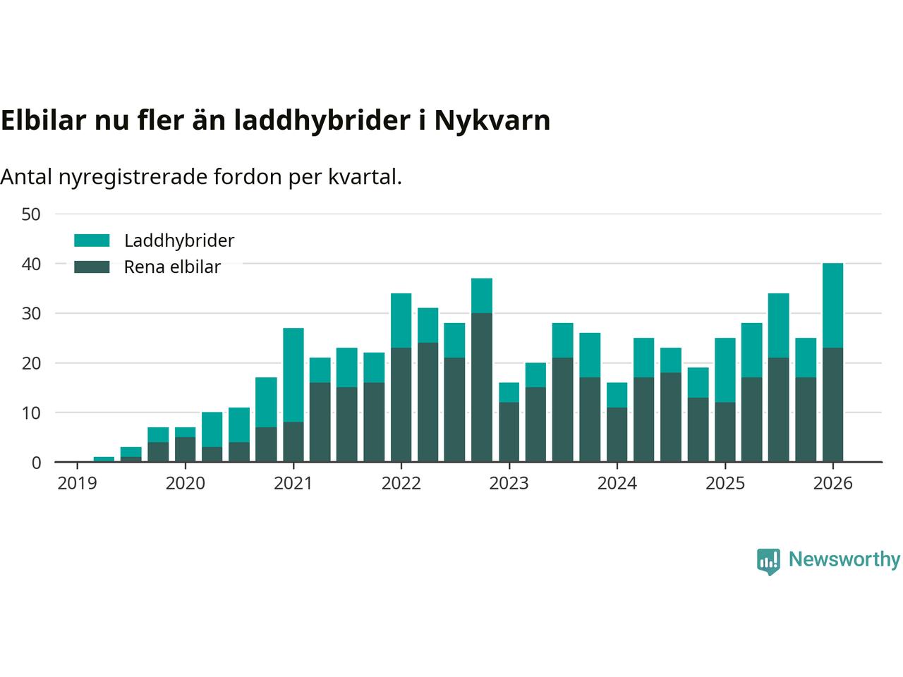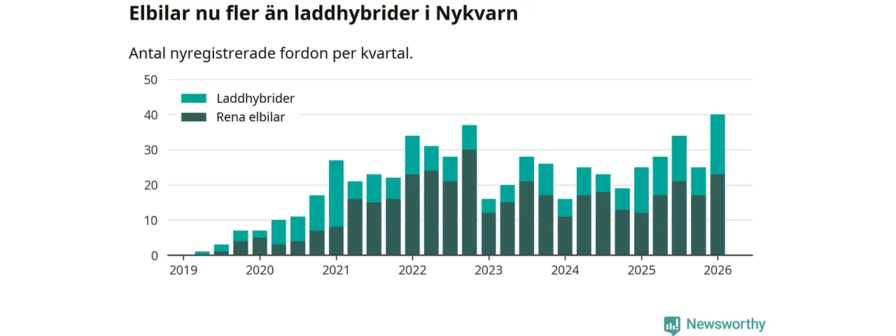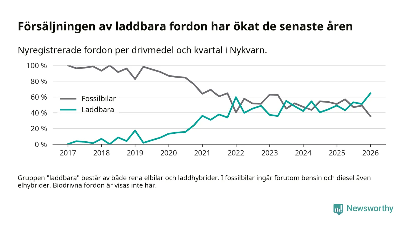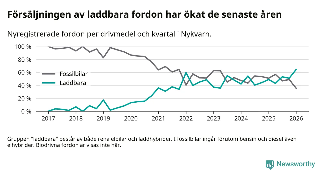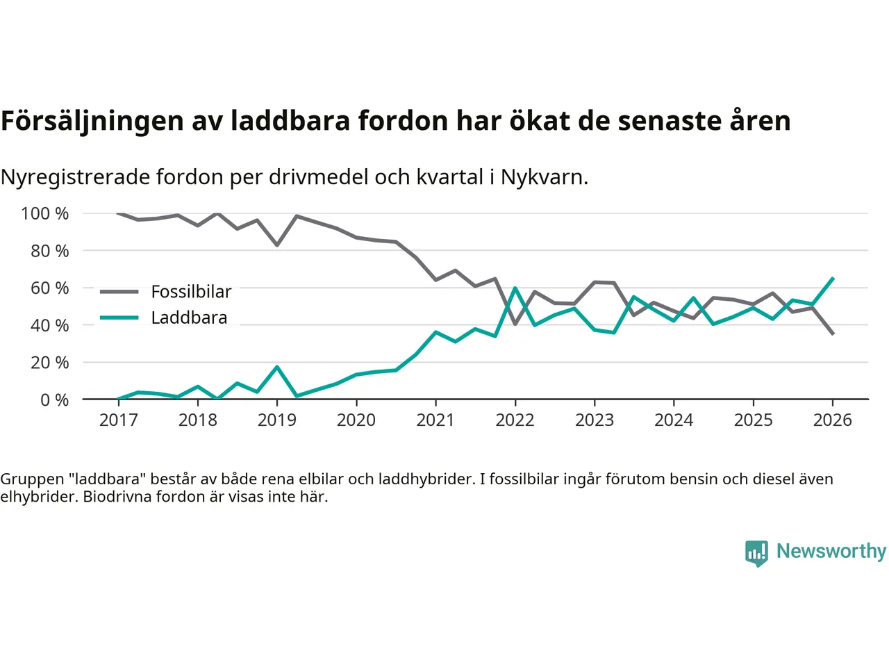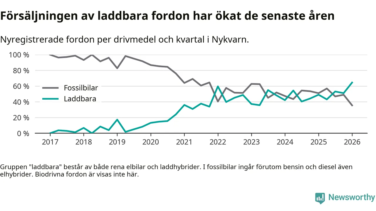 Under första kvartalet 2026 var 65 procent av alla nyregistrerade personbilar i Nykvarn laddbara (sammanlagt registrerades 62 nya bilar). Merparten av de laddbara bilarna var rena elbilar (37 procent av alla).