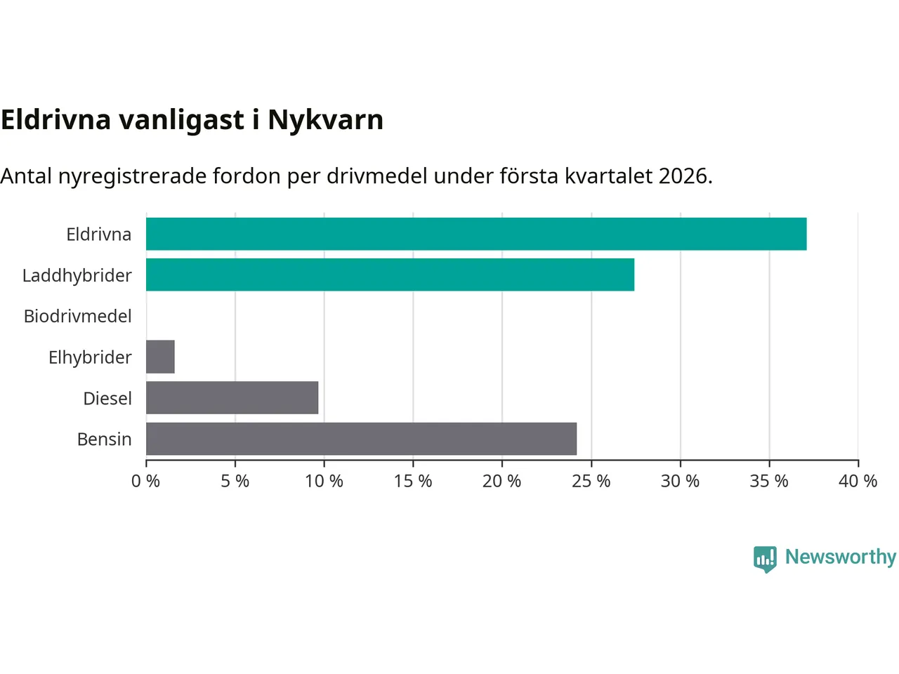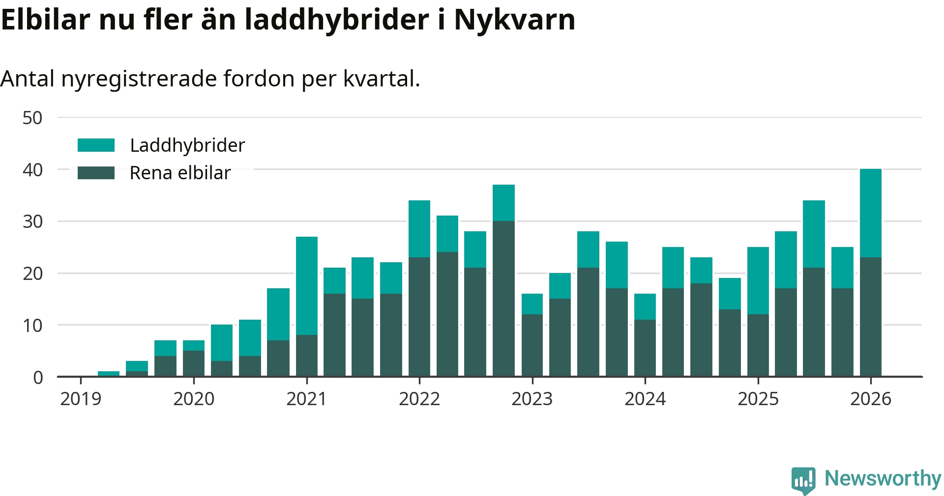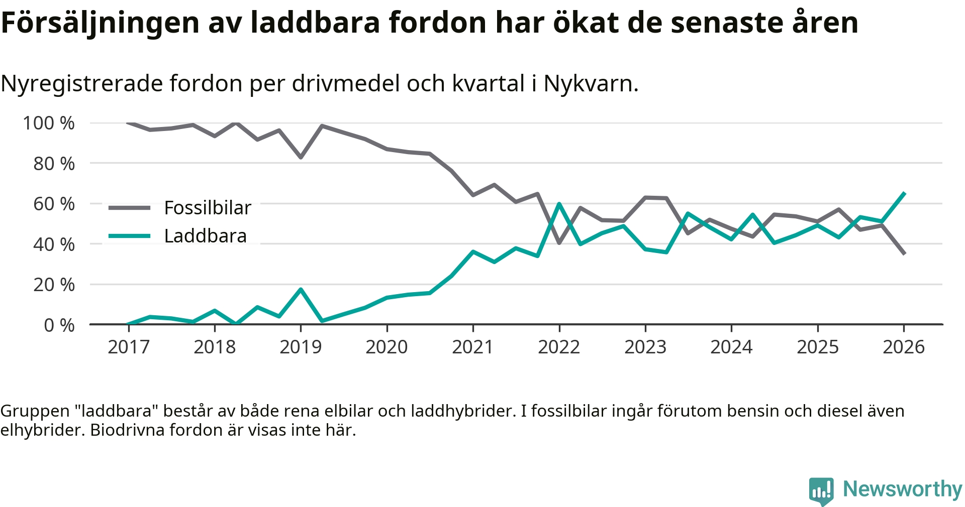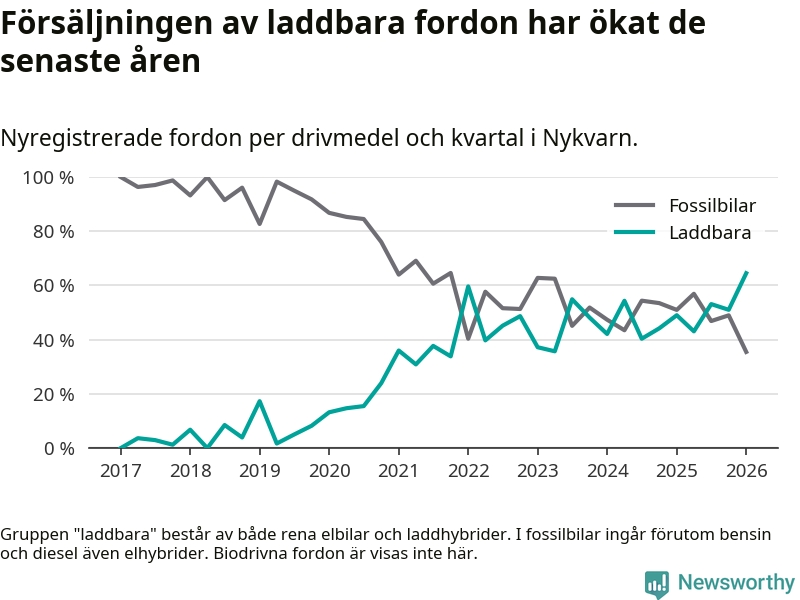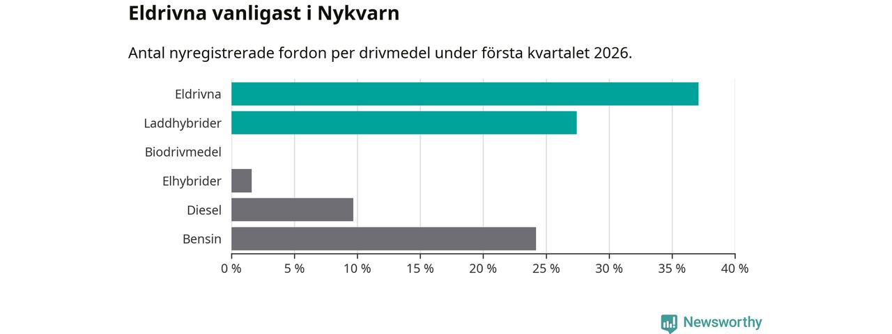 Under första kvartalet 2026 var 65 procent av alla nyregistrerade personbilar i Nykvarn laddbara (sammanlagt registrerades 62 nya bilar). Merparten av de laddbara bilarna var rena elbilar (37 procent av alla).