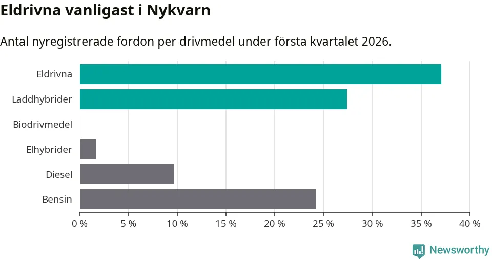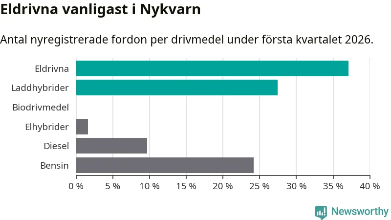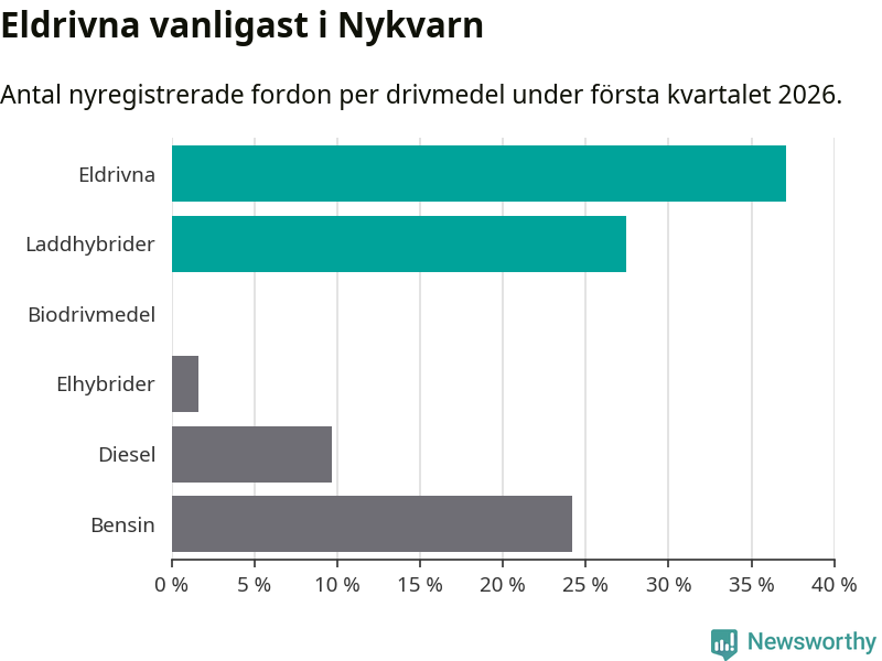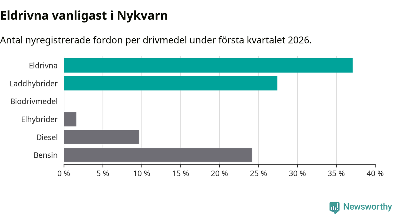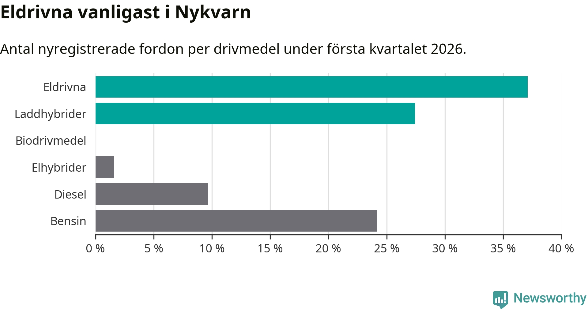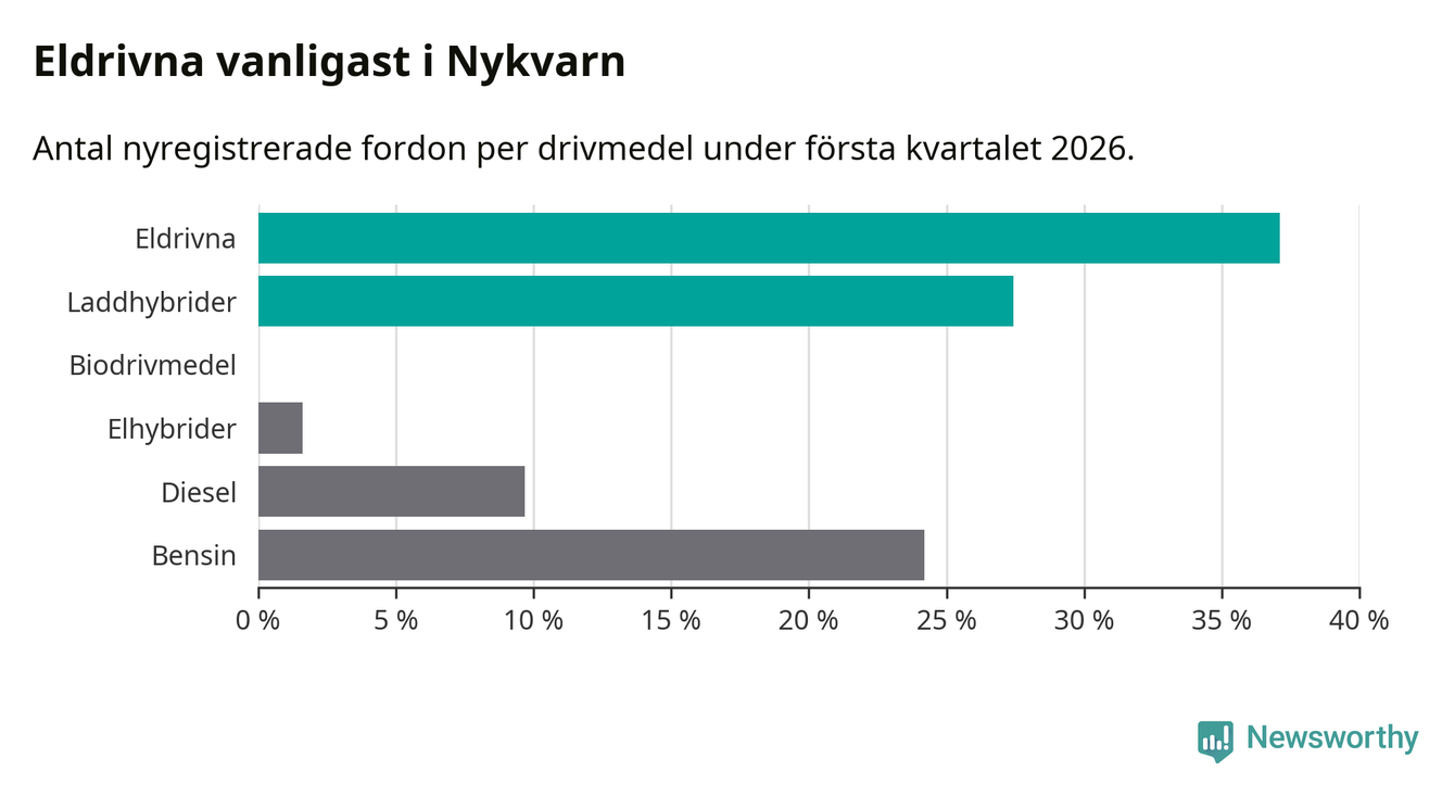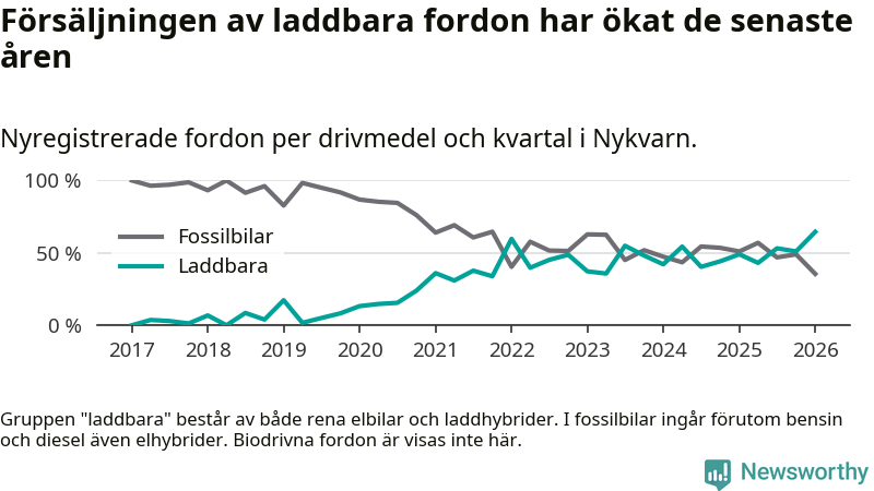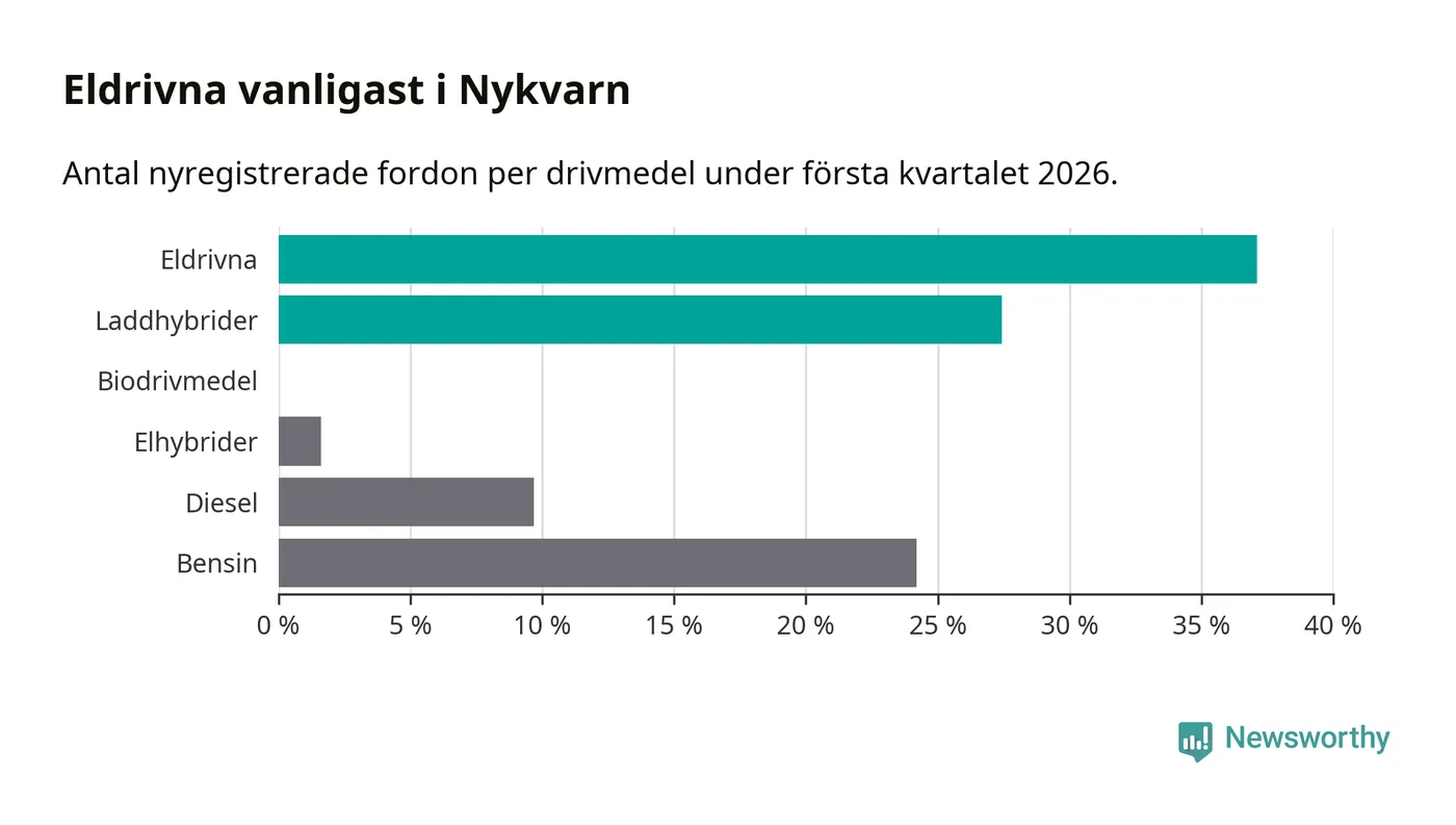 Under första kvartalet 2026 var 65 procent av alla nyregistrerade personbilar i Nykvarn laddbara (sammanlagt registrerades 62 nya bilar). Merparten av de laddbara bilarna var rena elbilar (37 procent av alla).