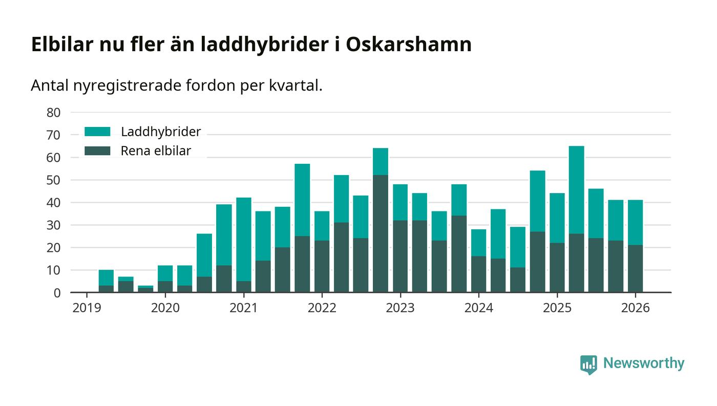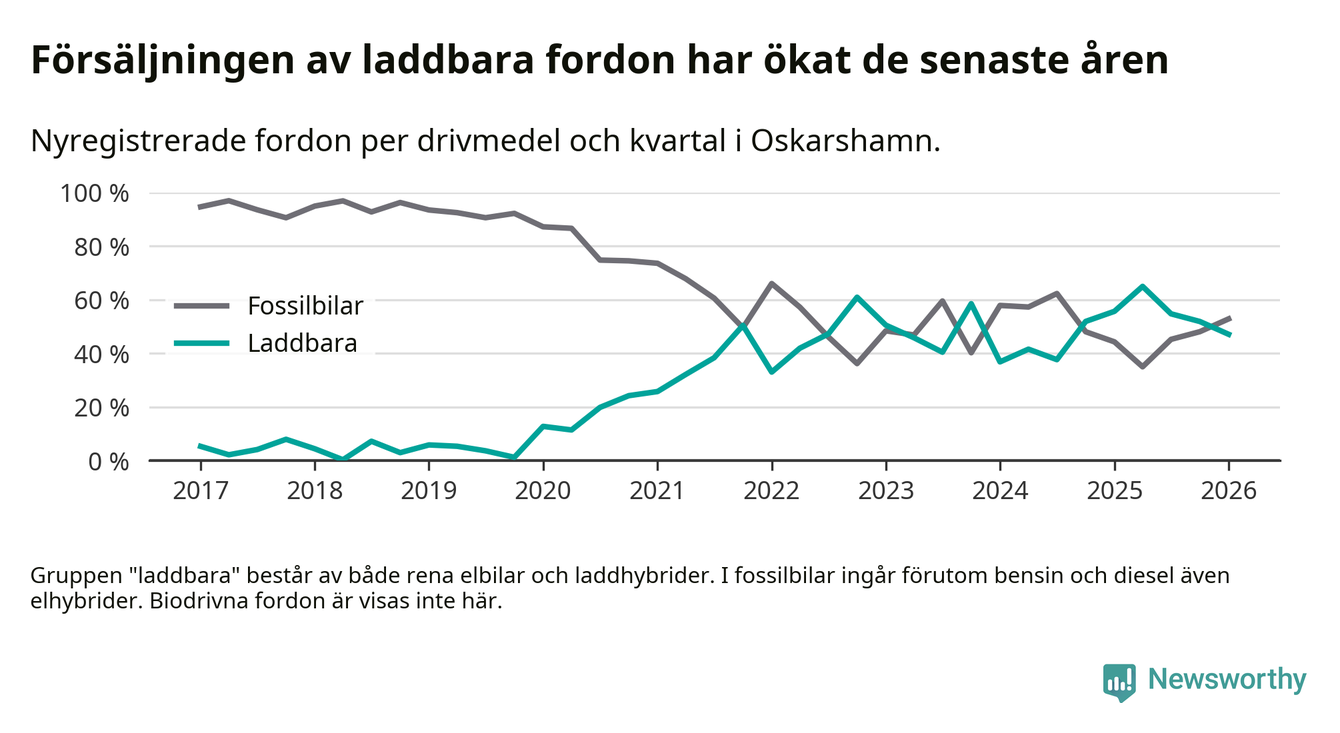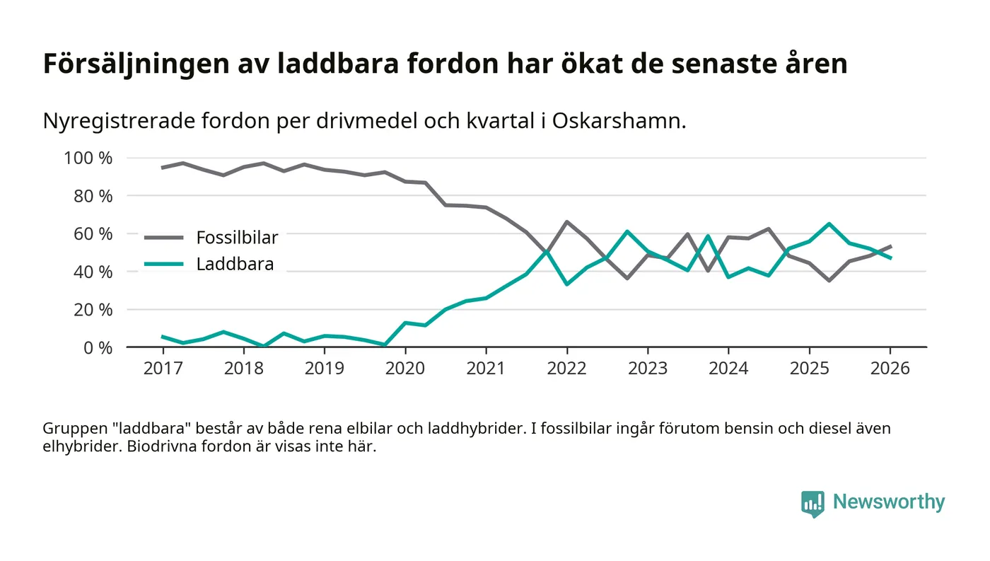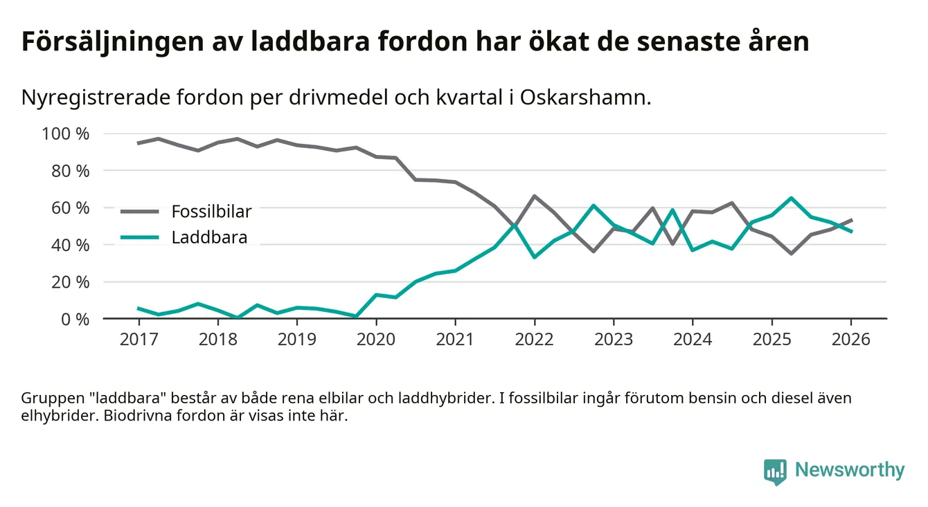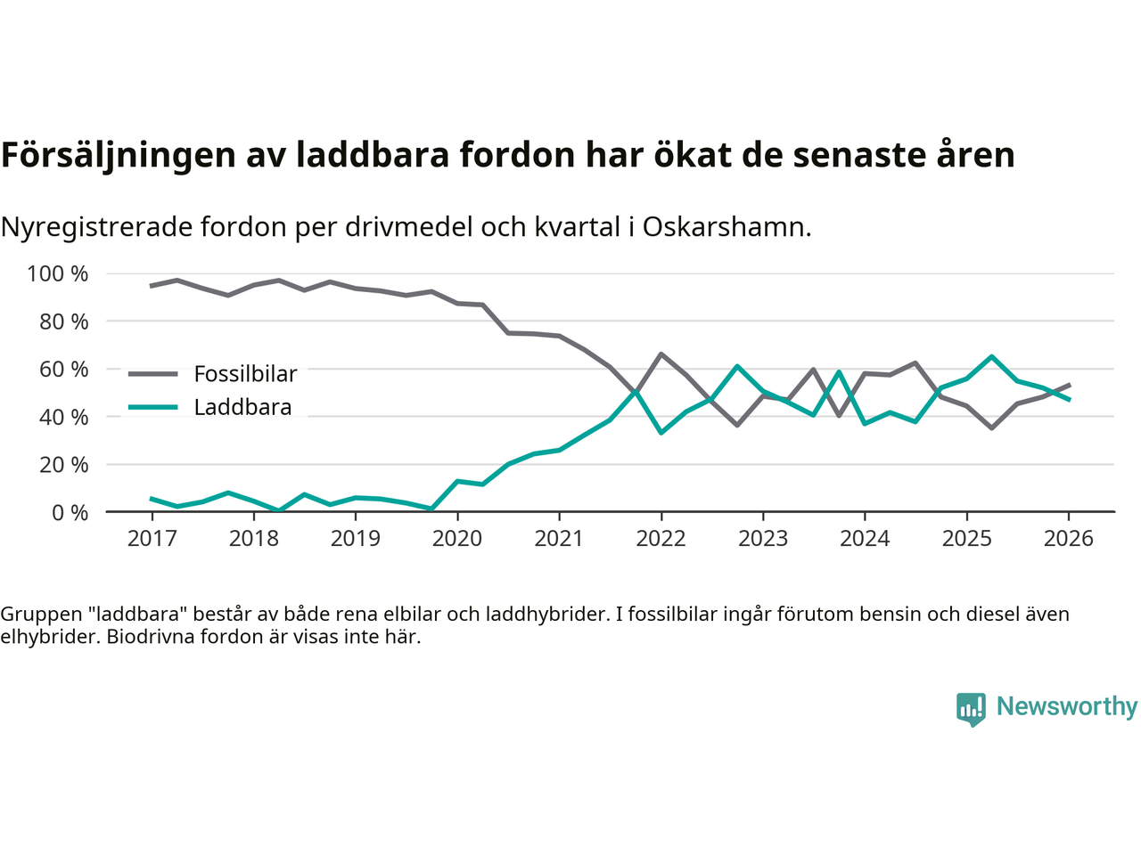 Under första kvartalet 2026 var 47 procent av alla nyregistrerade personbilar i Oskarshamn laddbara (sammanlagt registrerades 87 nya bilar). Merparten av de laddbara bilarna var rena elbilar (24 procent av alla).