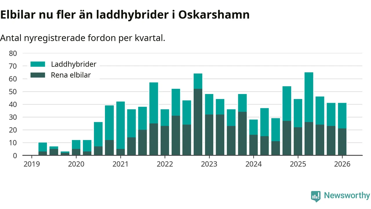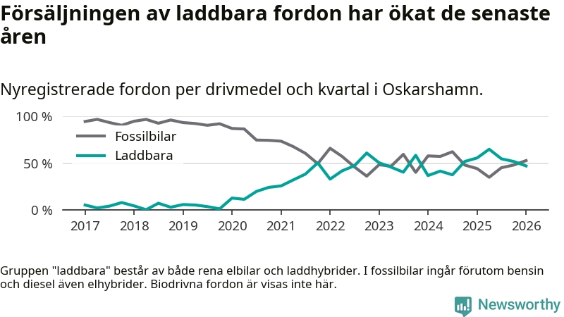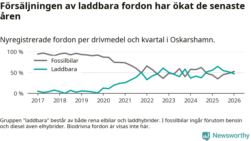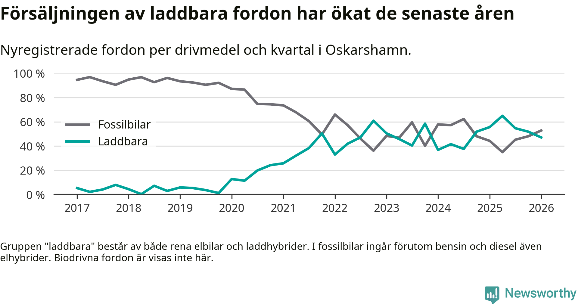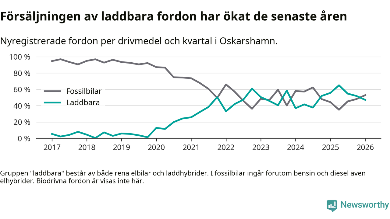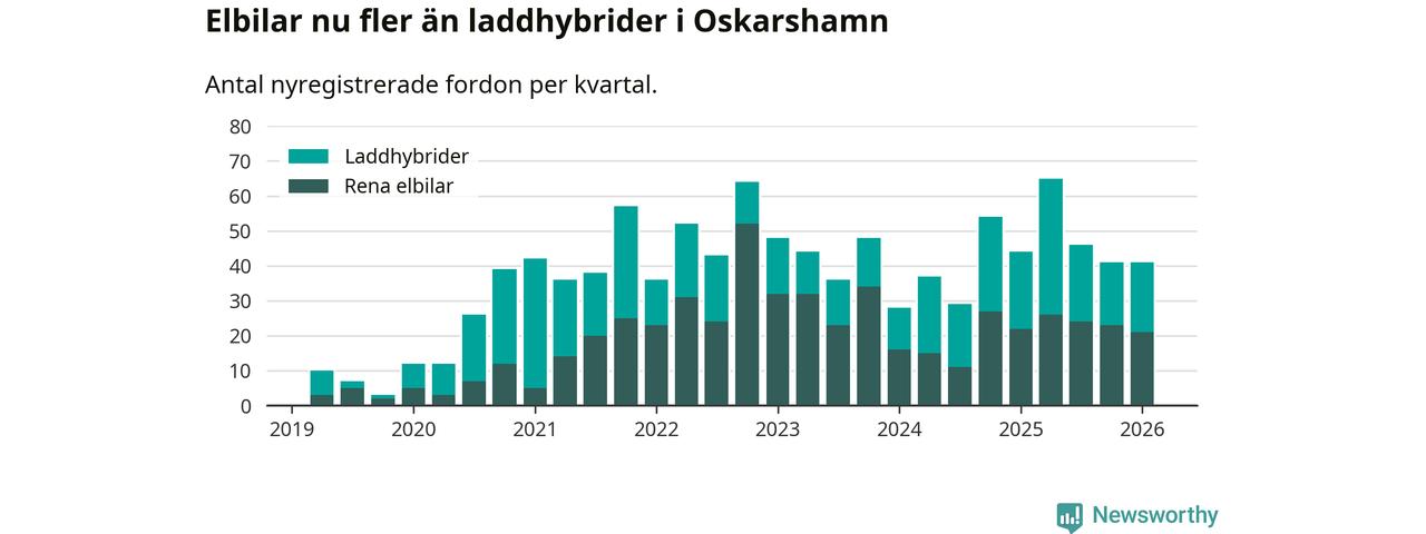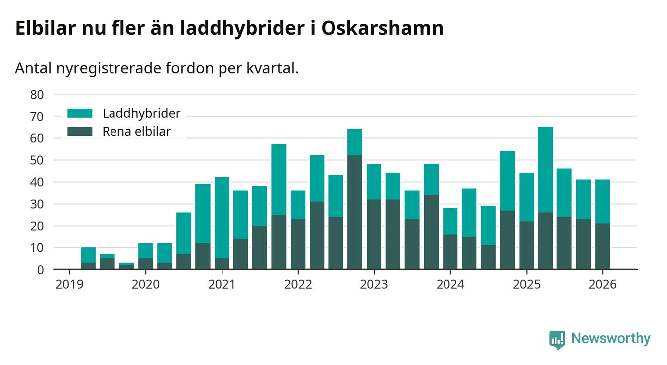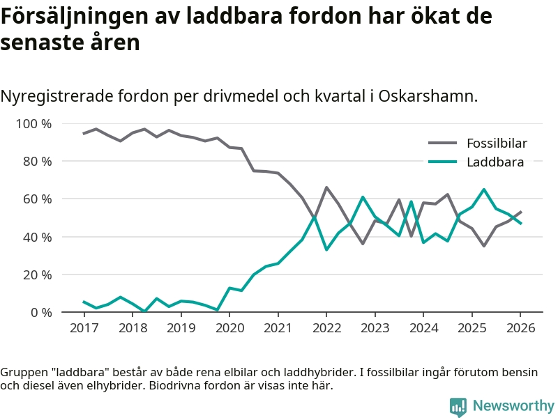 Under första kvartalet 2026 var 47 procent av alla nyregistrerade personbilar i Oskarshamn laddbara (sammanlagt registrerades 87 nya bilar). Merparten av de laddbara bilarna var rena elbilar (24 procent av alla).