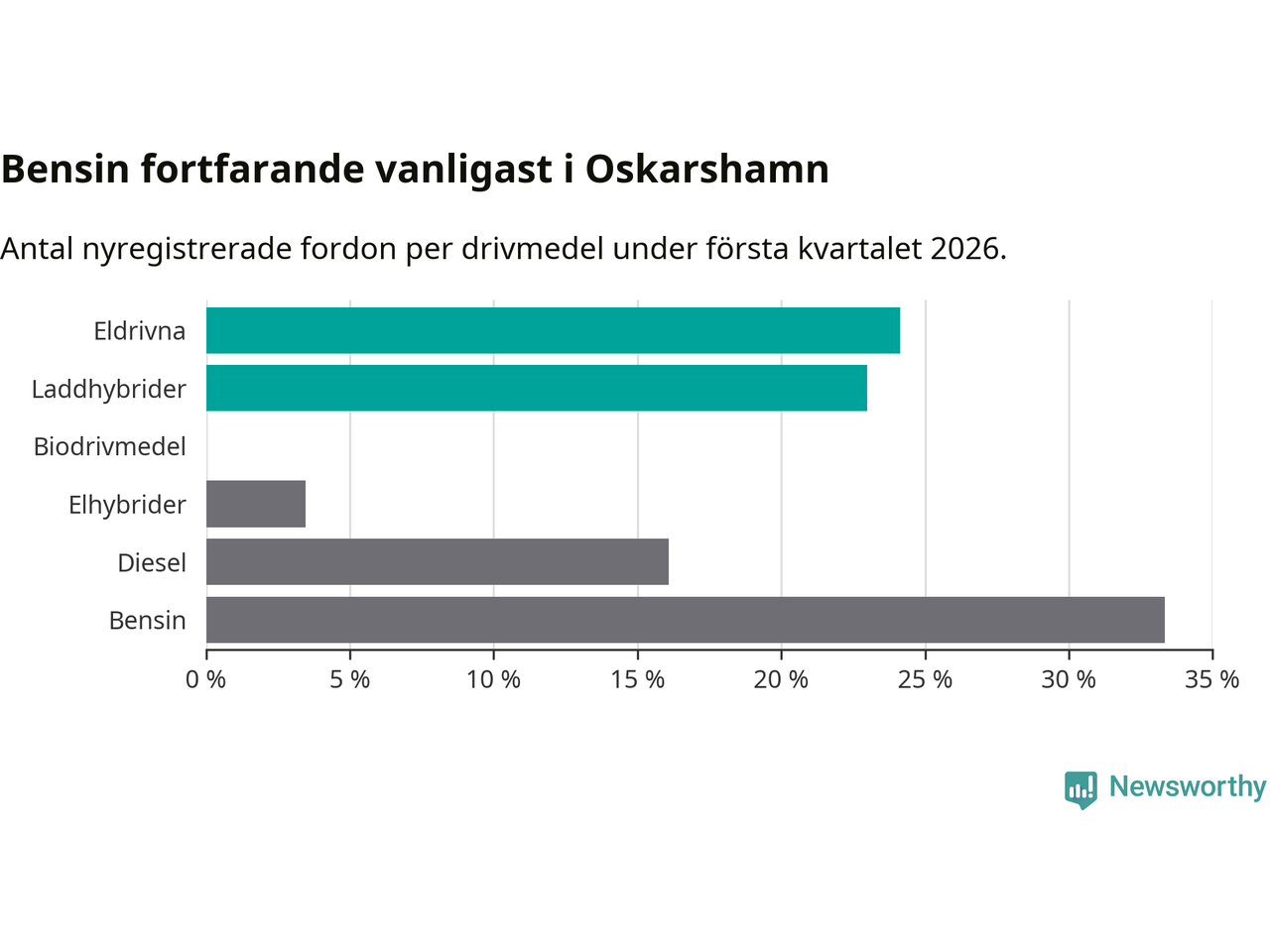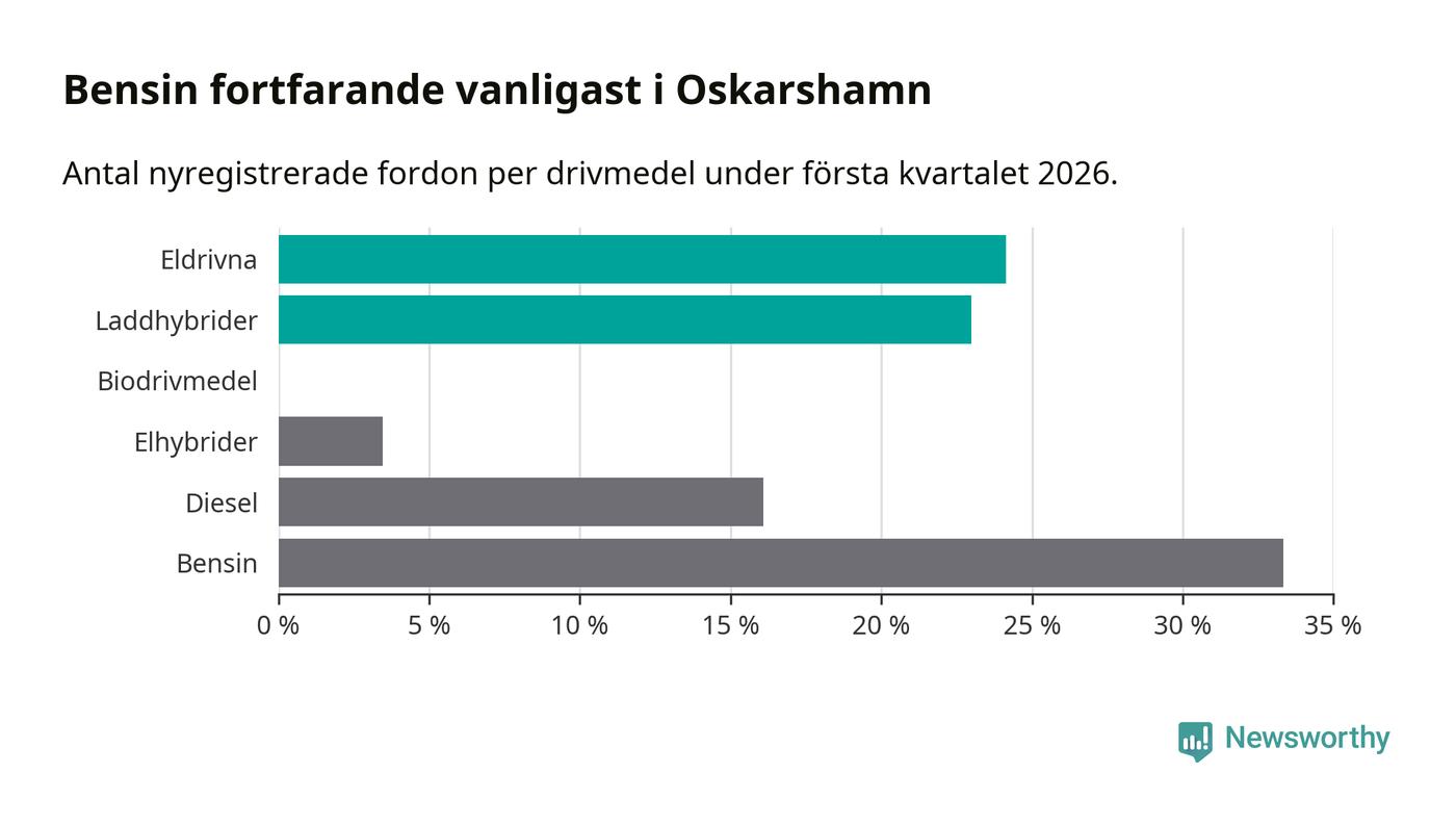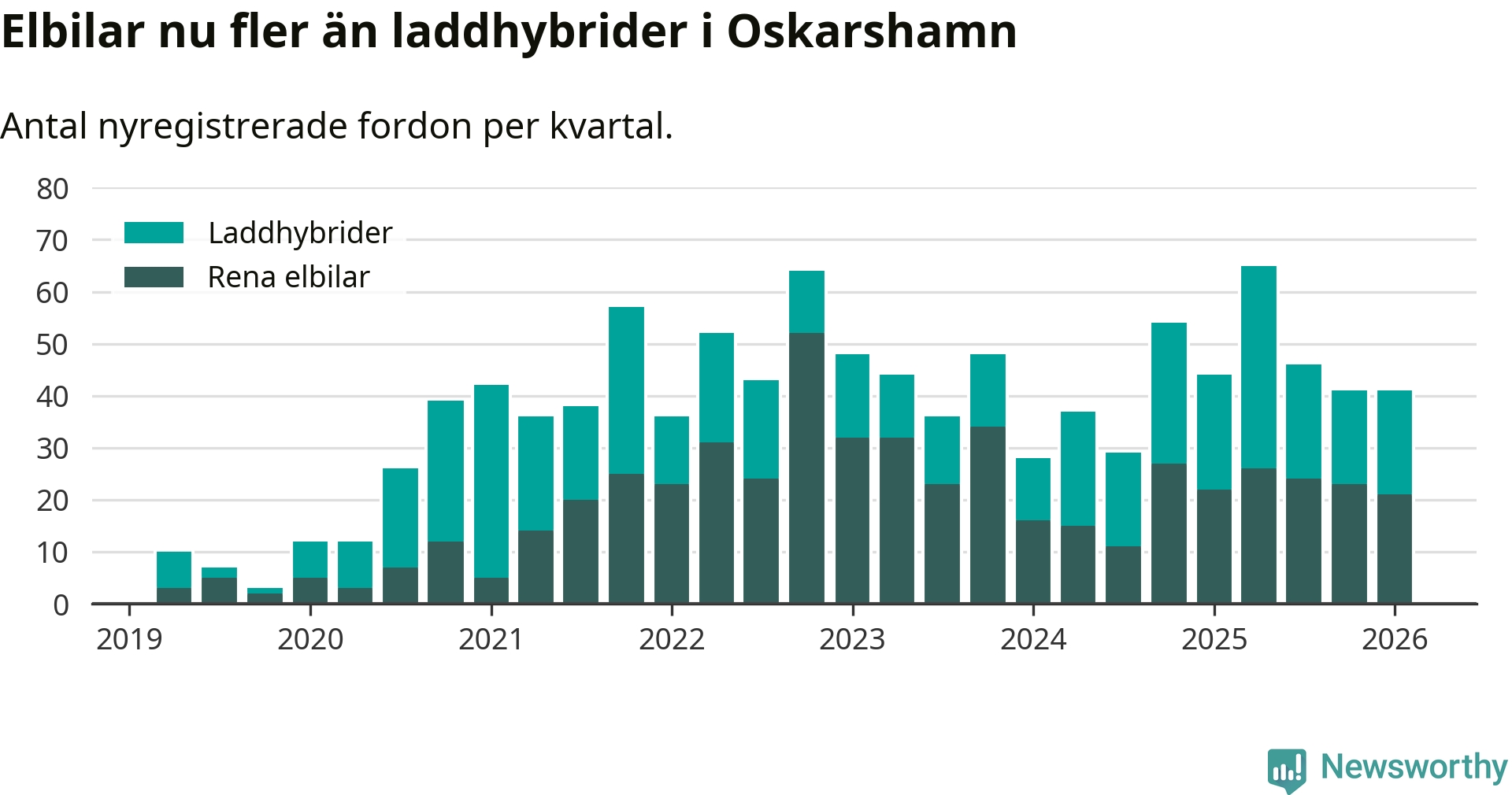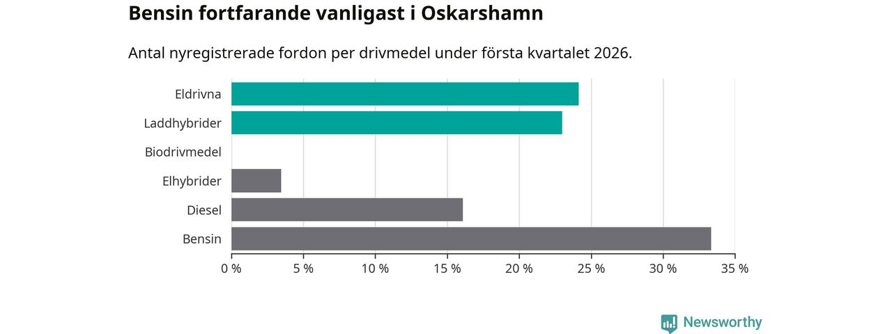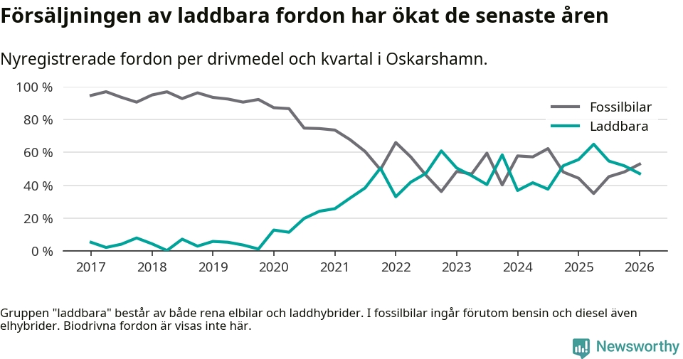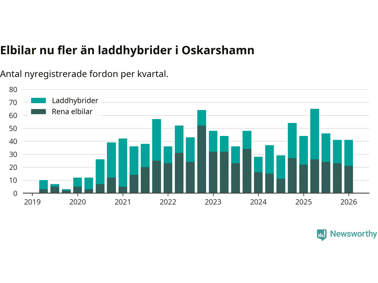 Under första kvartalet 2026 var 47 procent av alla nyregistrerade personbilar i Oskarshamn laddbara (sammanlagt registrerades 87 nya bilar). Merparten av de laddbara bilarna var rena elbilar (24 procent av alla).