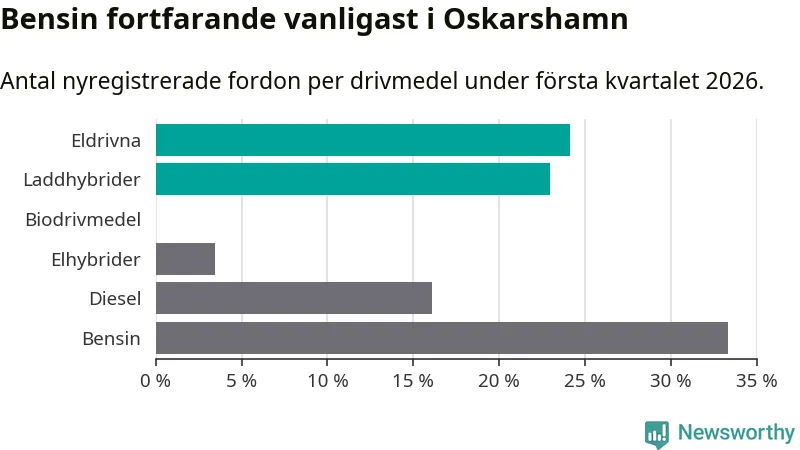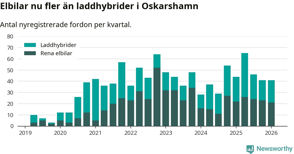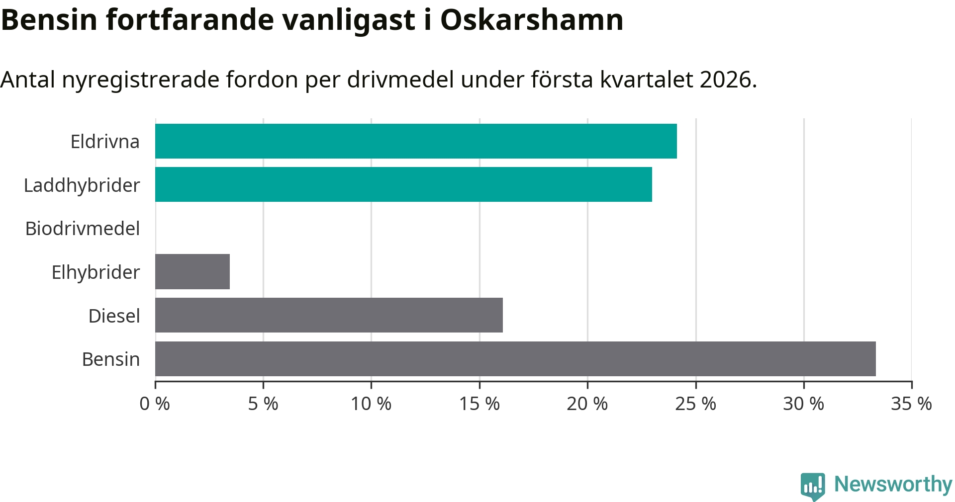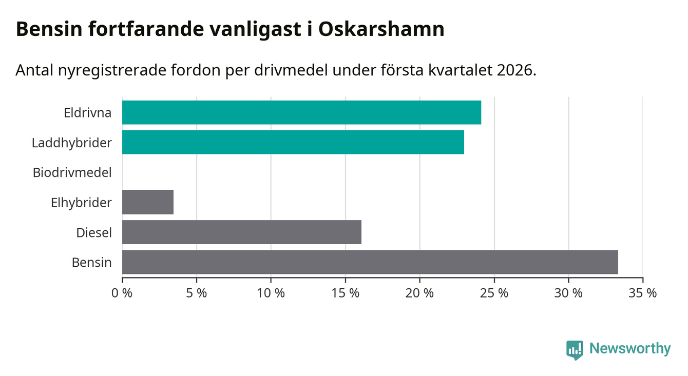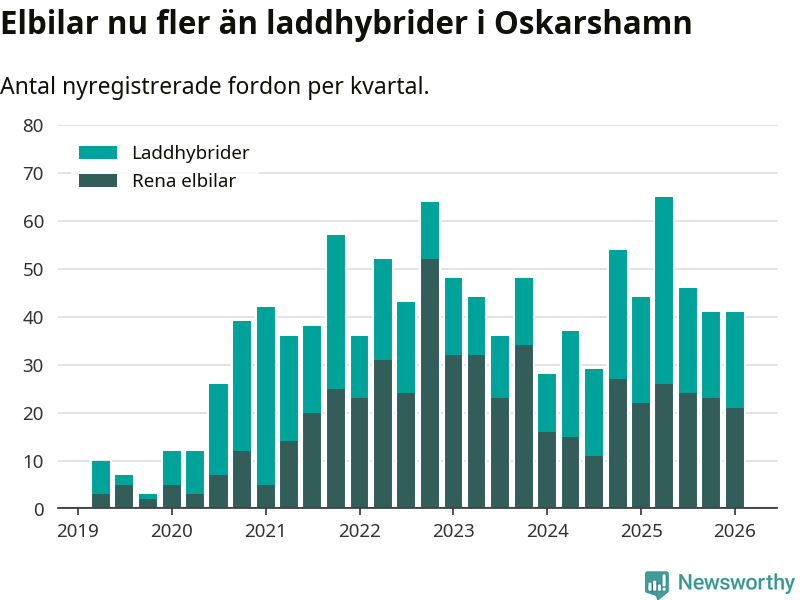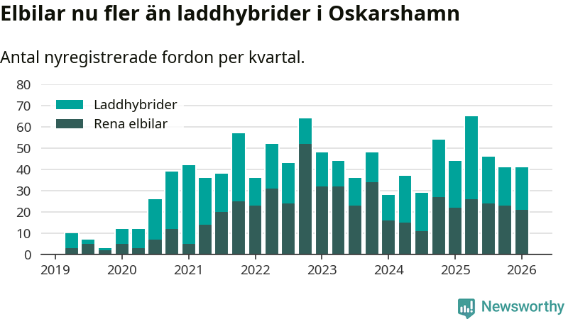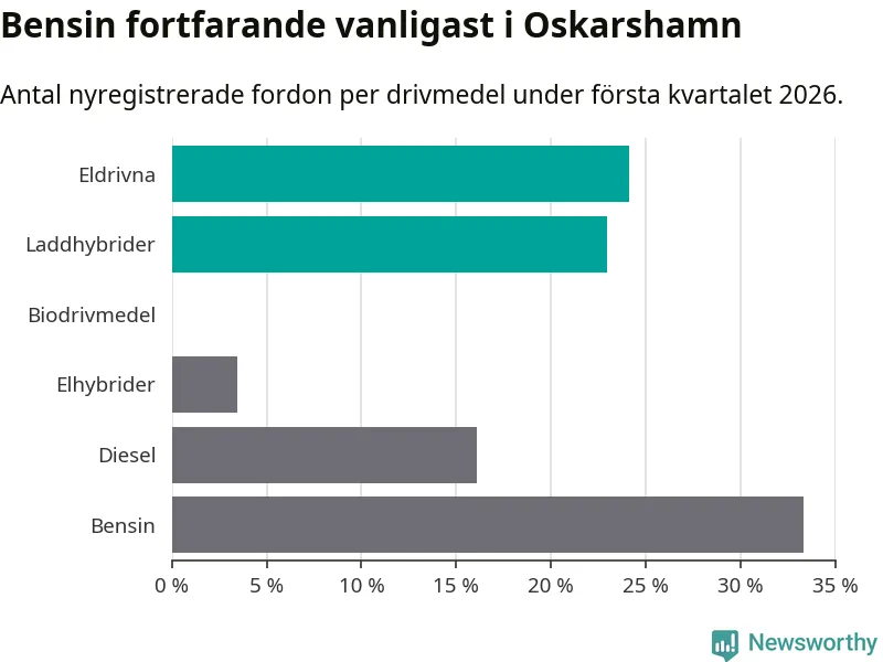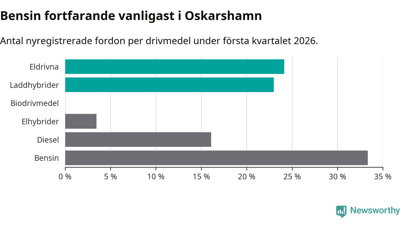 Under första kvartalet 2026 var 47 procent av alla nyregistrerade personbilar i Oskarshamn laddbara (sammanlagt registrerades 87 nya bilar). Merparten av de laddbara bilarna var rena elbilar (24 procent av alla).
