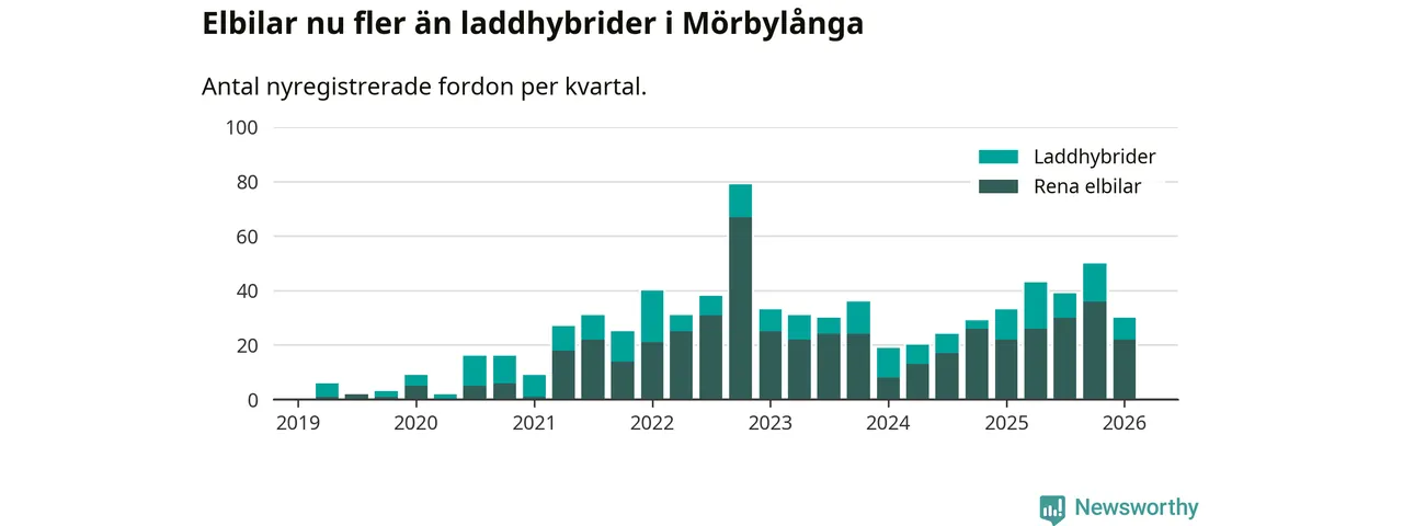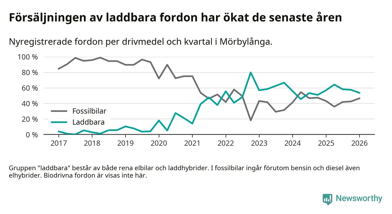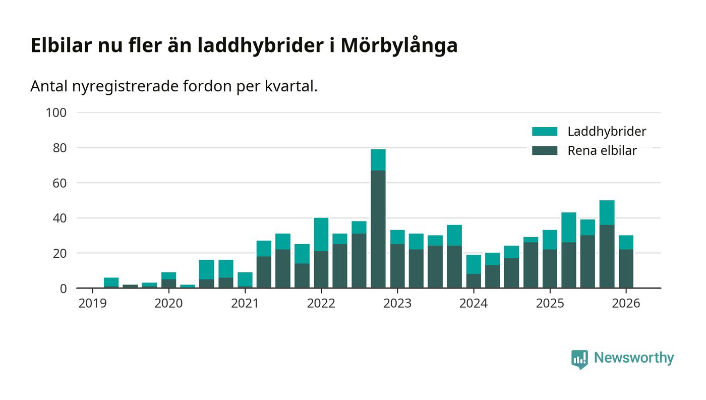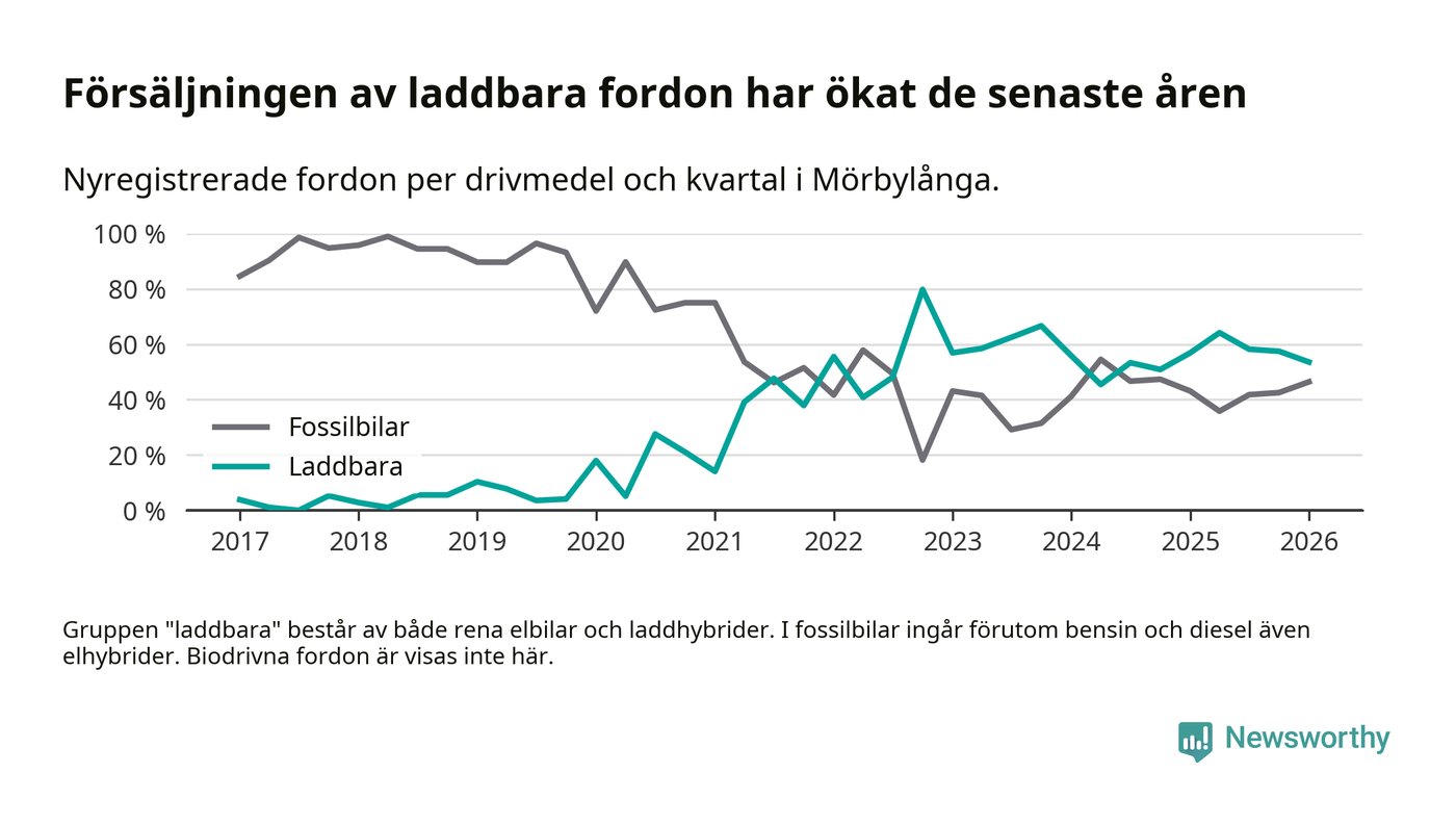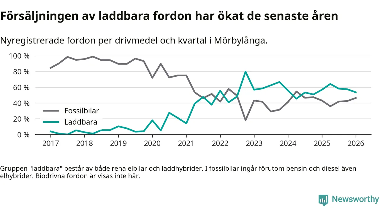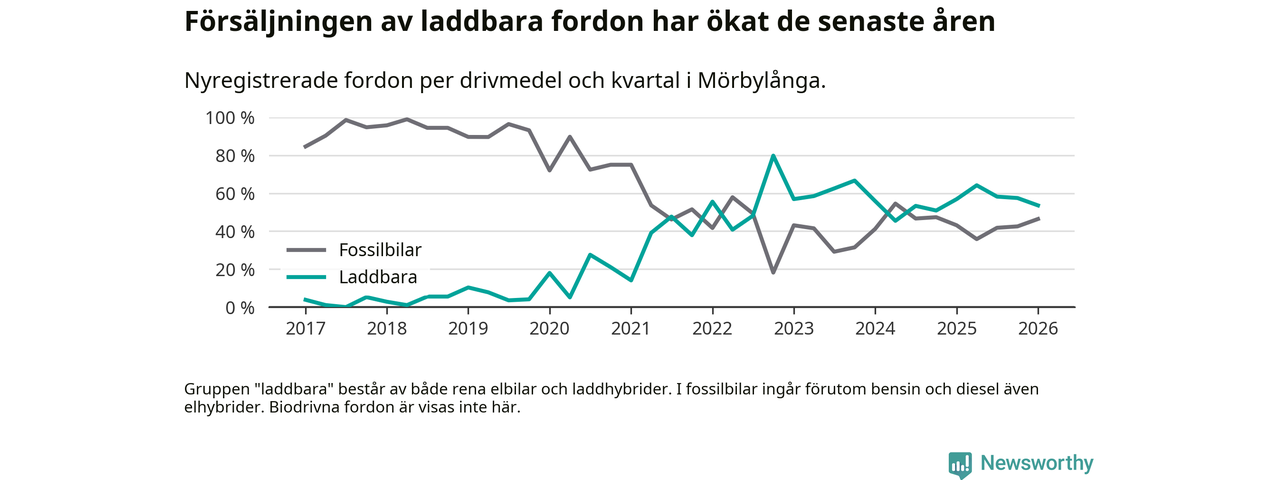 Under första kvartalet 2026 var 54 procent av alla nyregistrerade personbilar i Mörbylånga laddbara (sammanlagt registrerades 56 nya bilar). Merparten av de laddbara bilarna var rena elbilar (39 procent av alla).