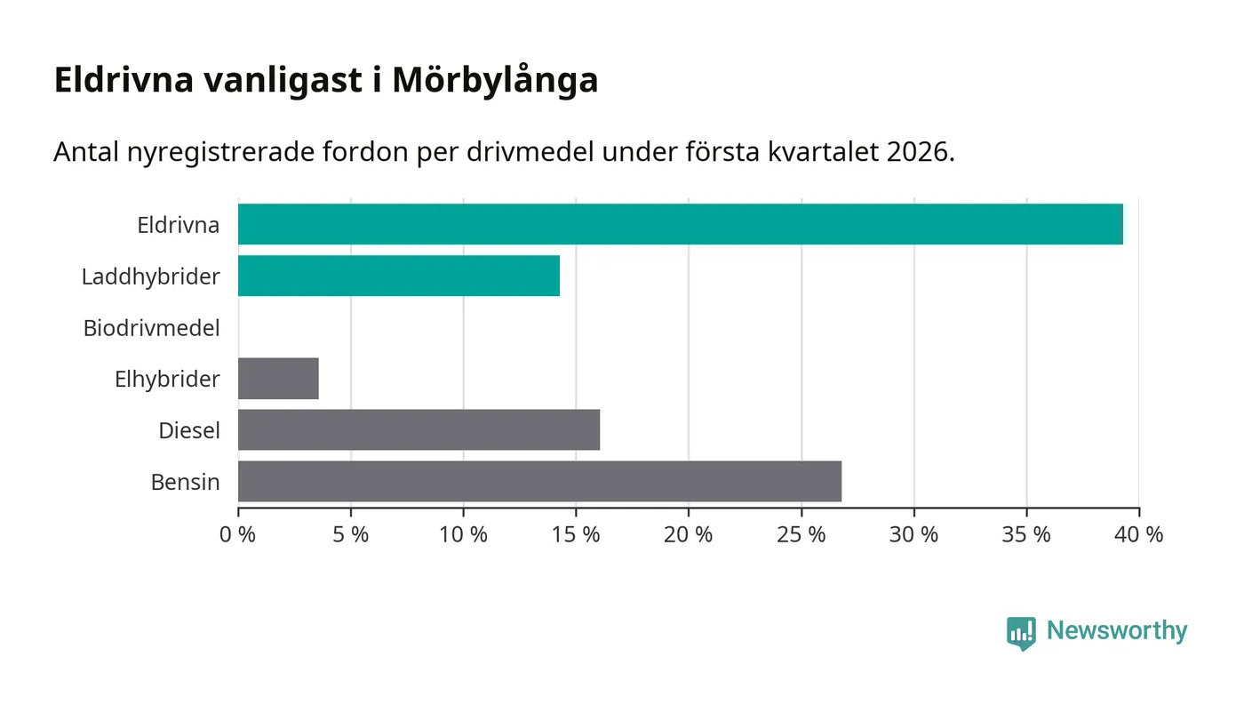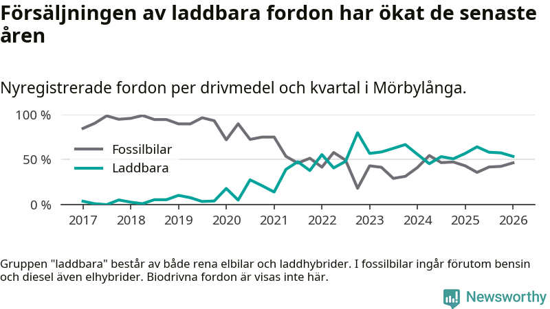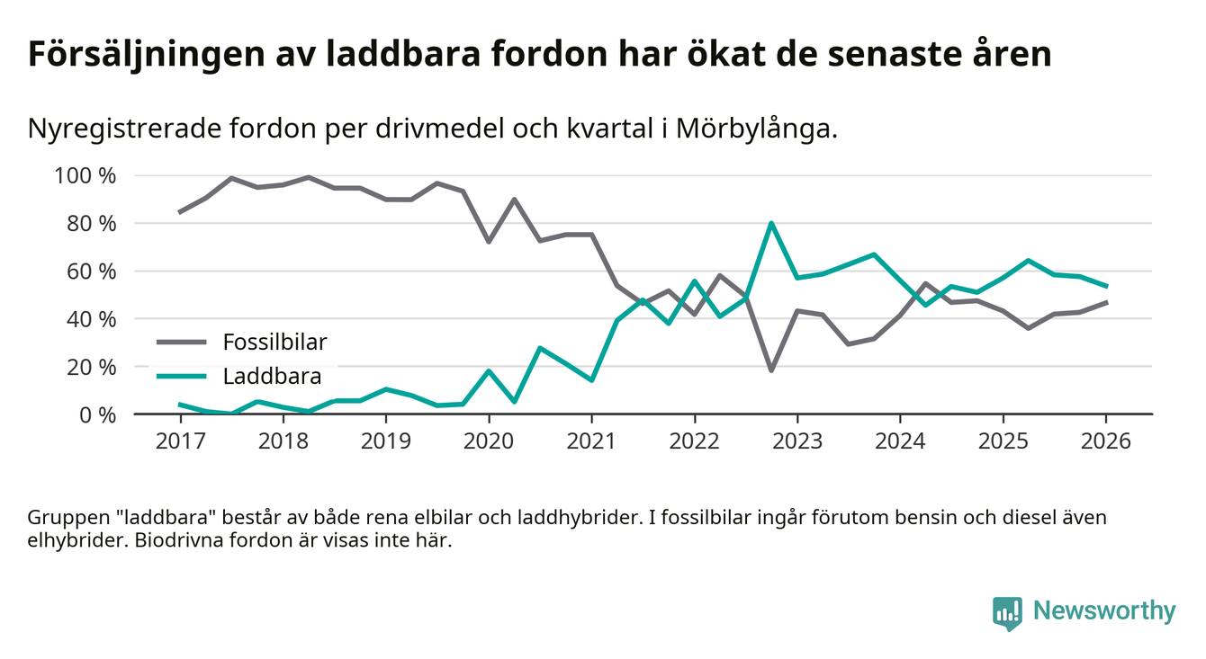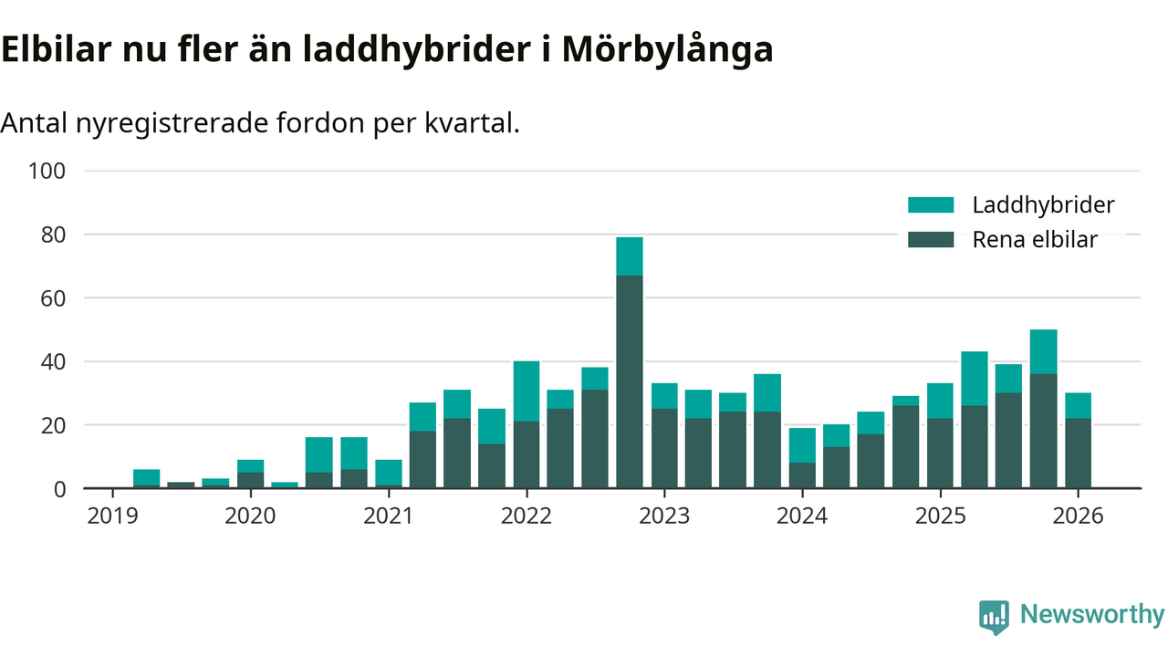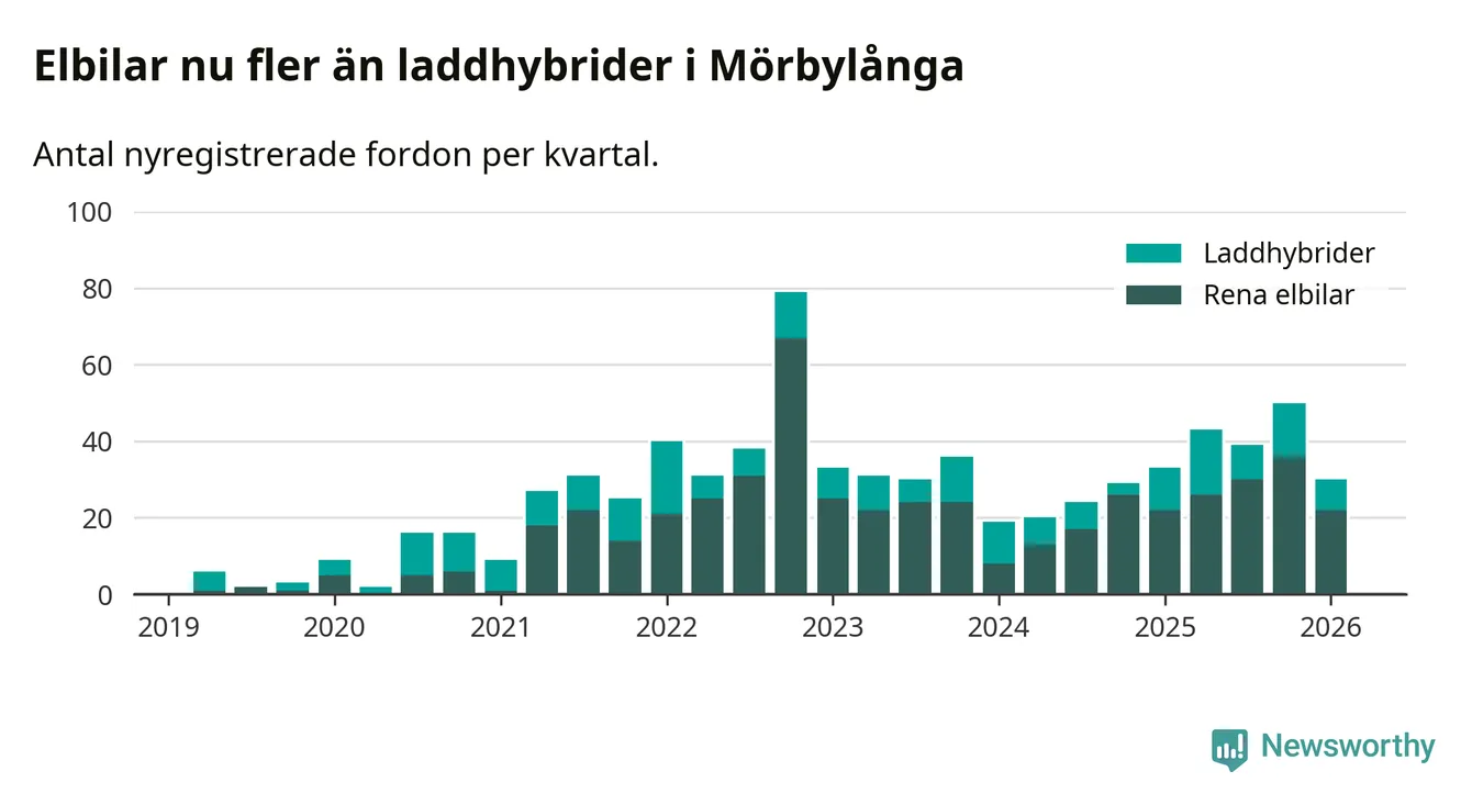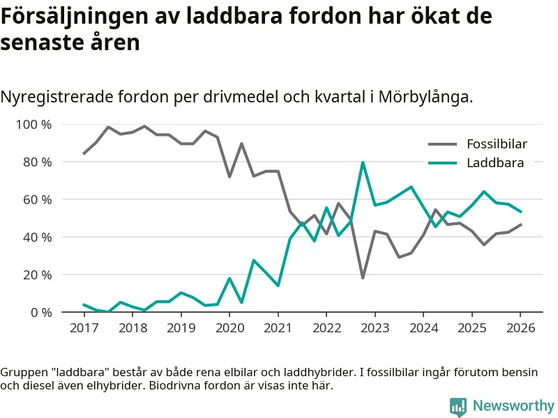 Under första kvartalet 2026 var 54 procent av alla nyregistrerade personbilar i Mörbylånga laddbara (sammanlagt registrerades 56 nya bilar). Merparten av de laddbara bilarna var rena elbilar (39 procent av alla).