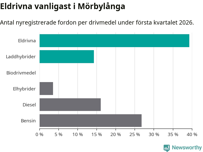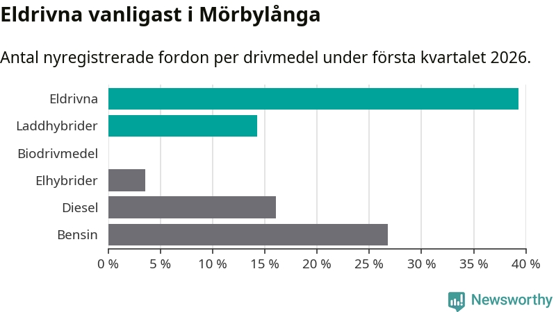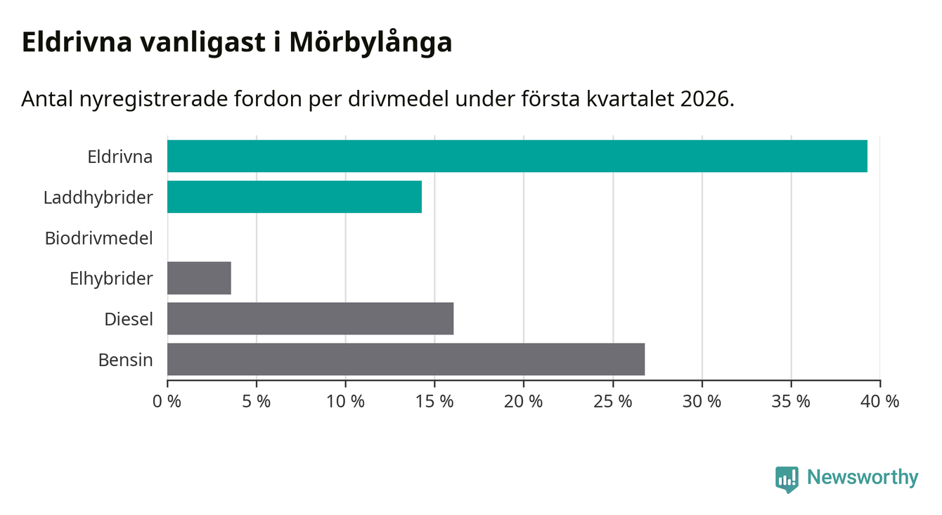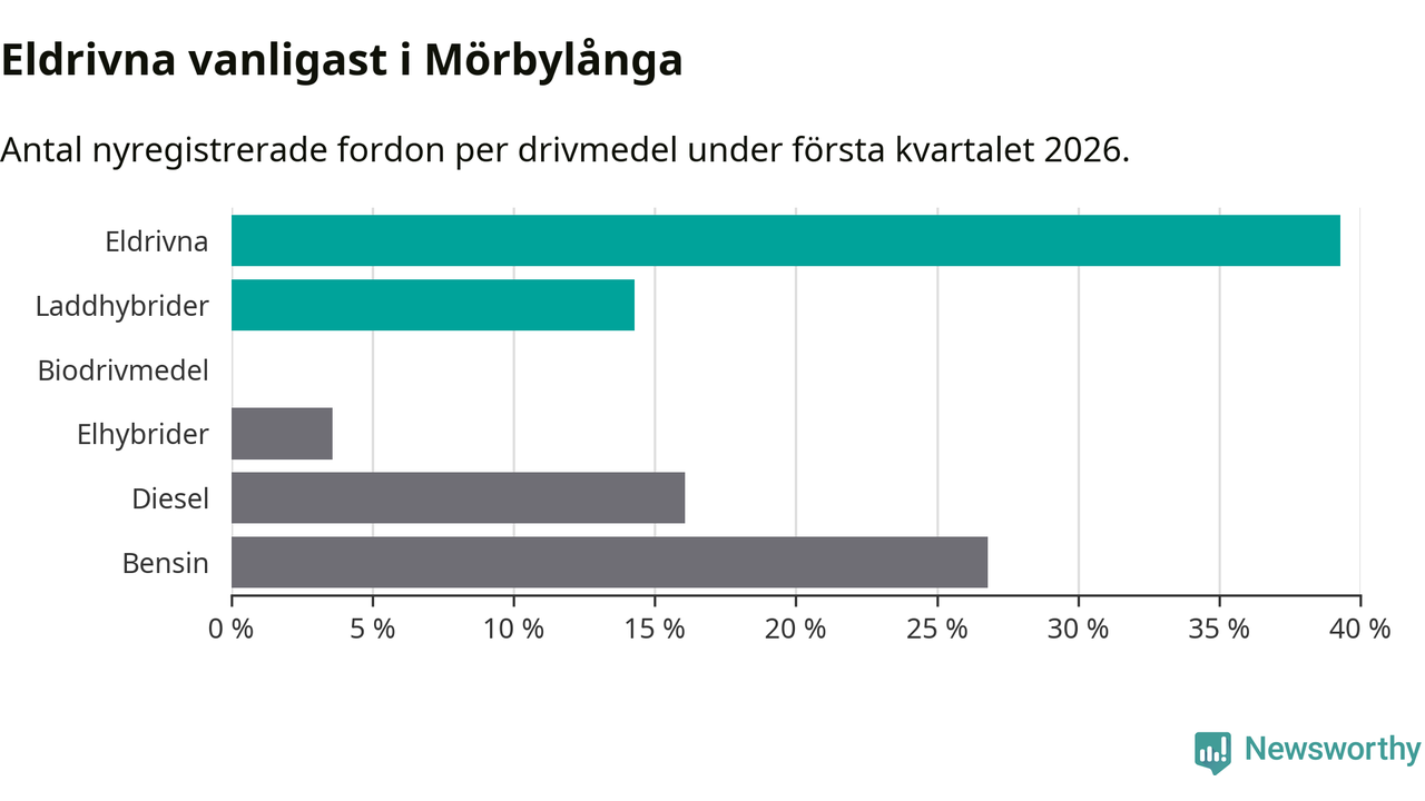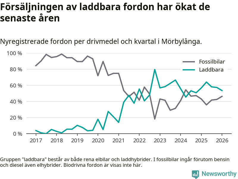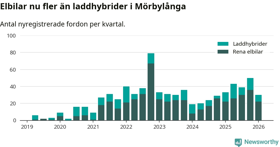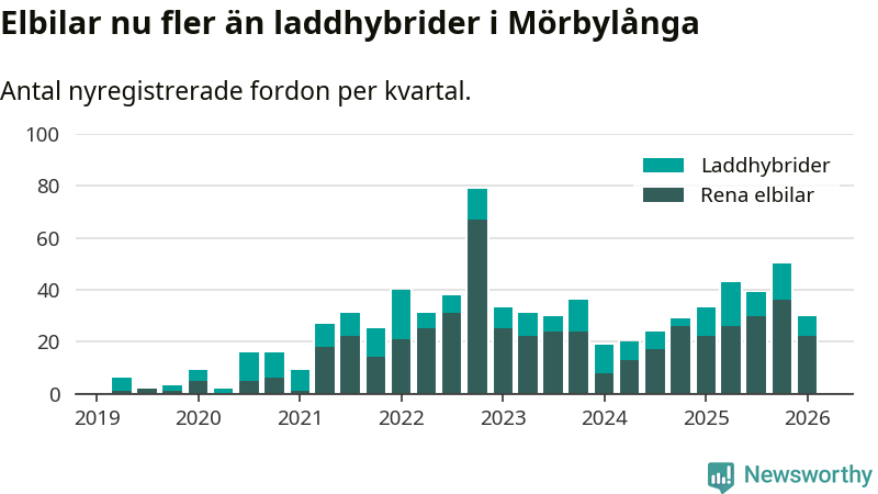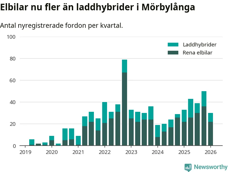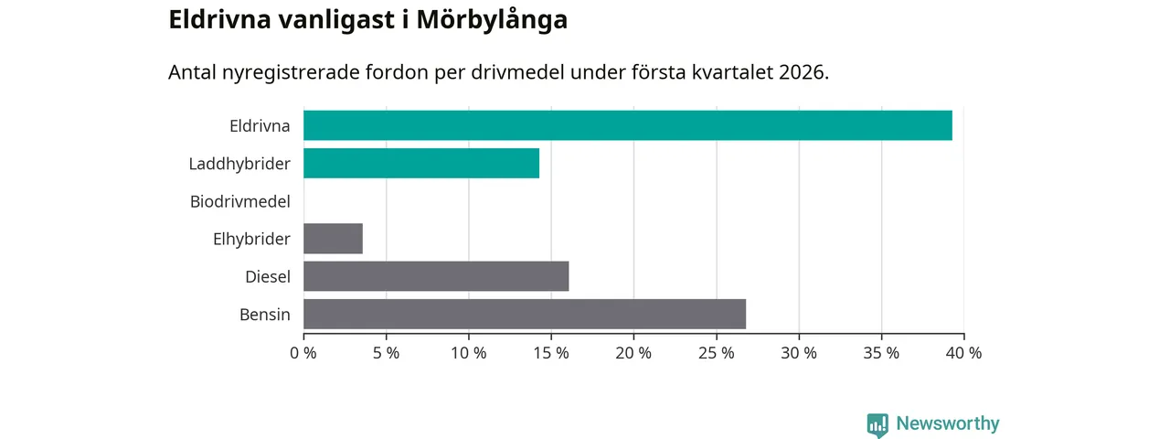 Under första kvartalet 2026 var 54 procent av alla nyregistrerade personbilar i Mörbylånga laddbara (sammanlagt registrerades 56 nya bilar). Merparten av de laddbara bilarna var rena elbilar (39 procent av alla).