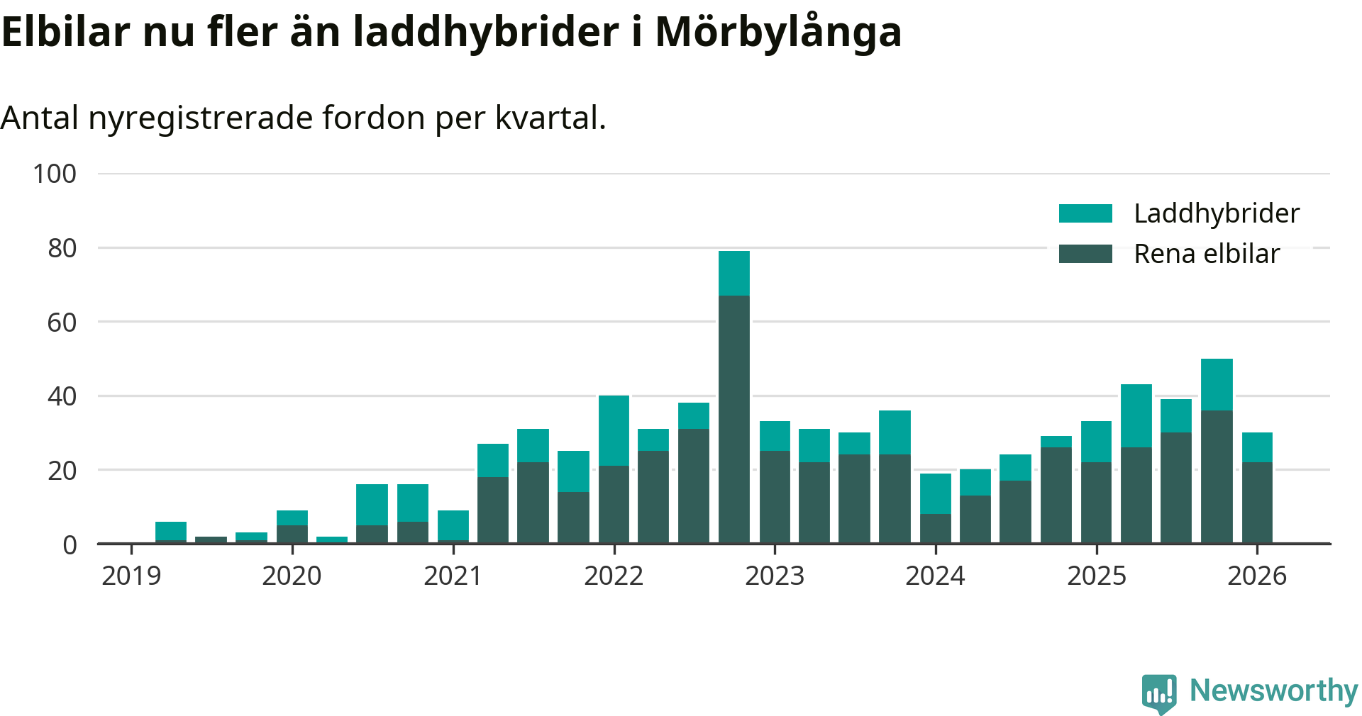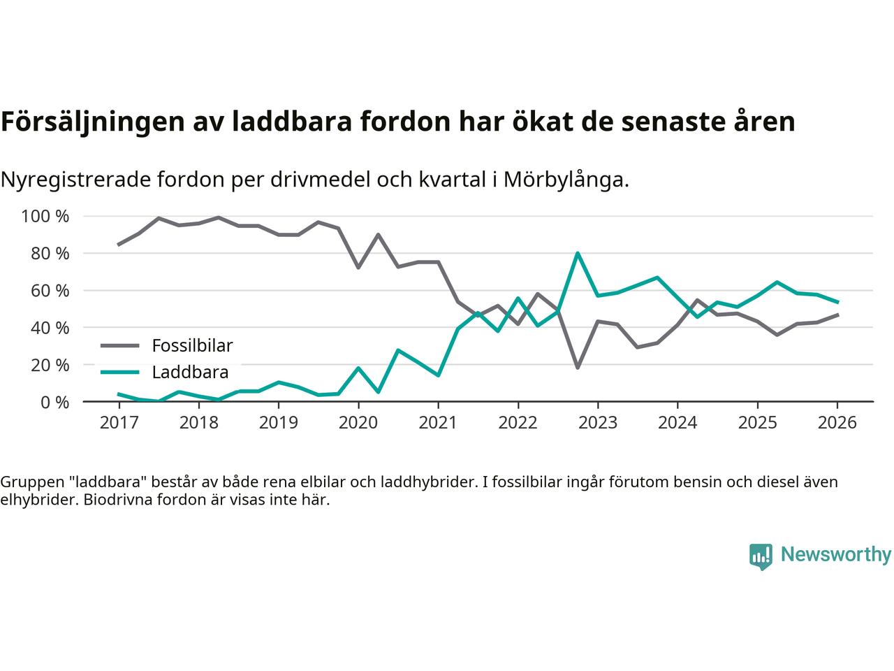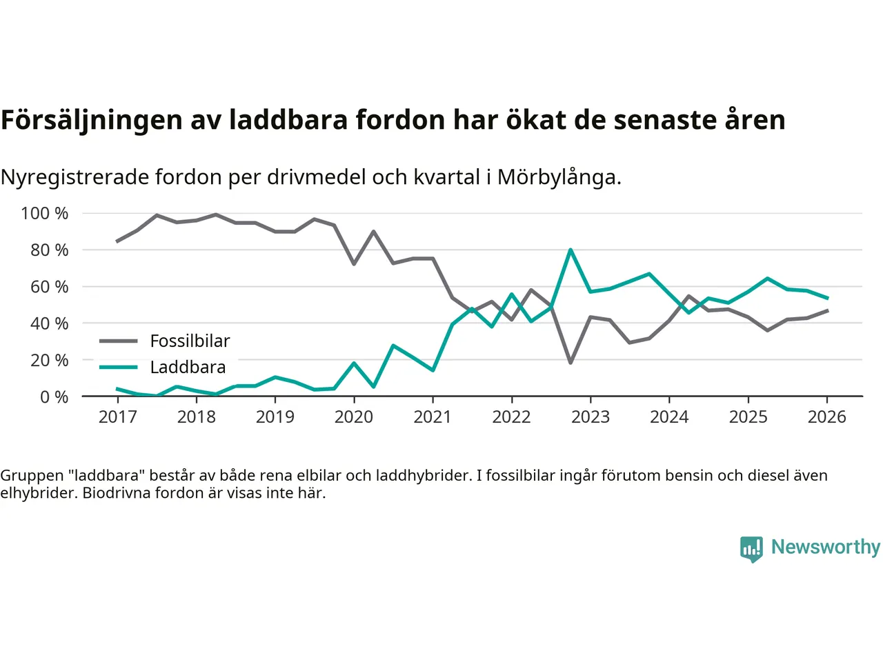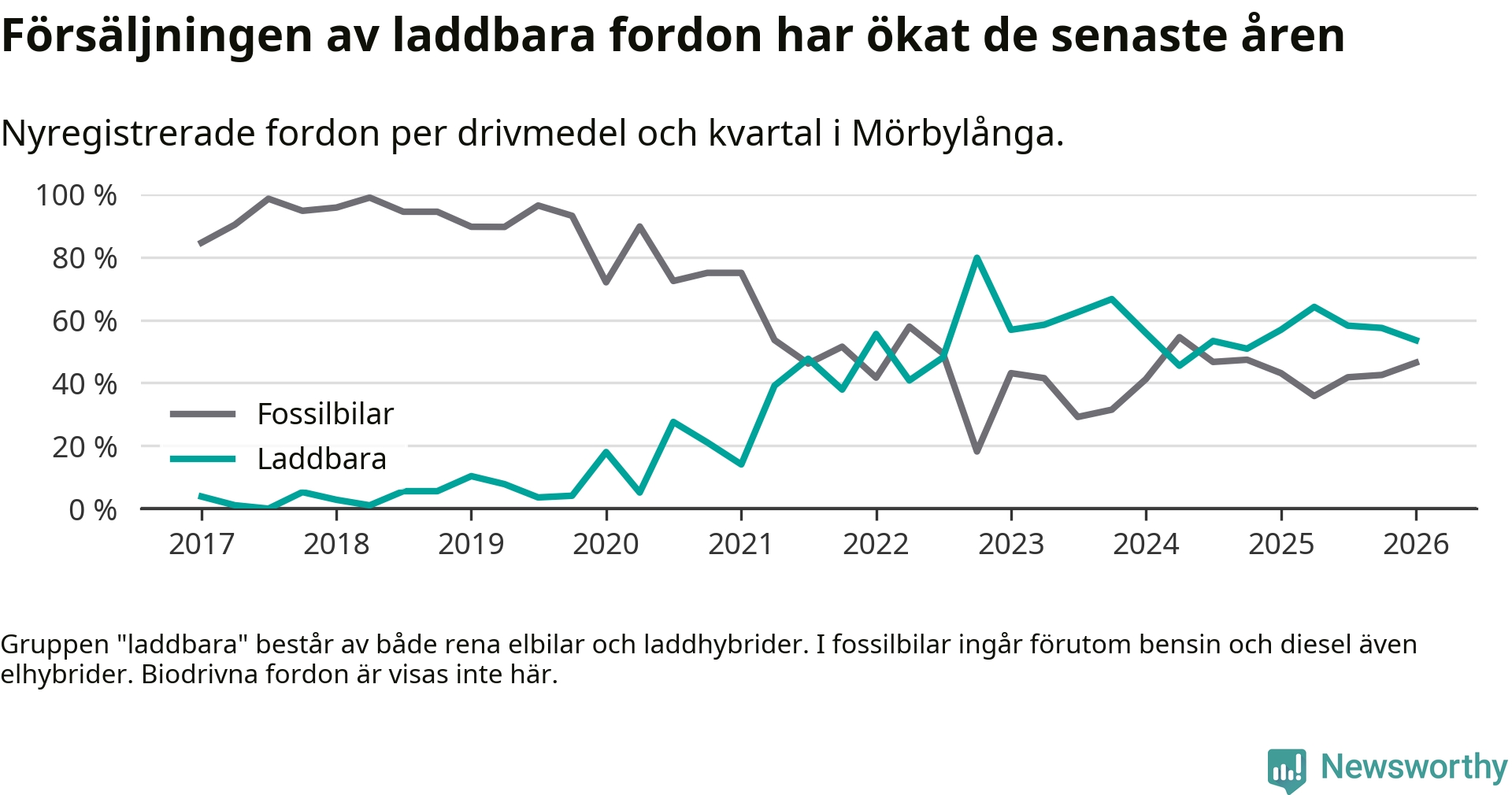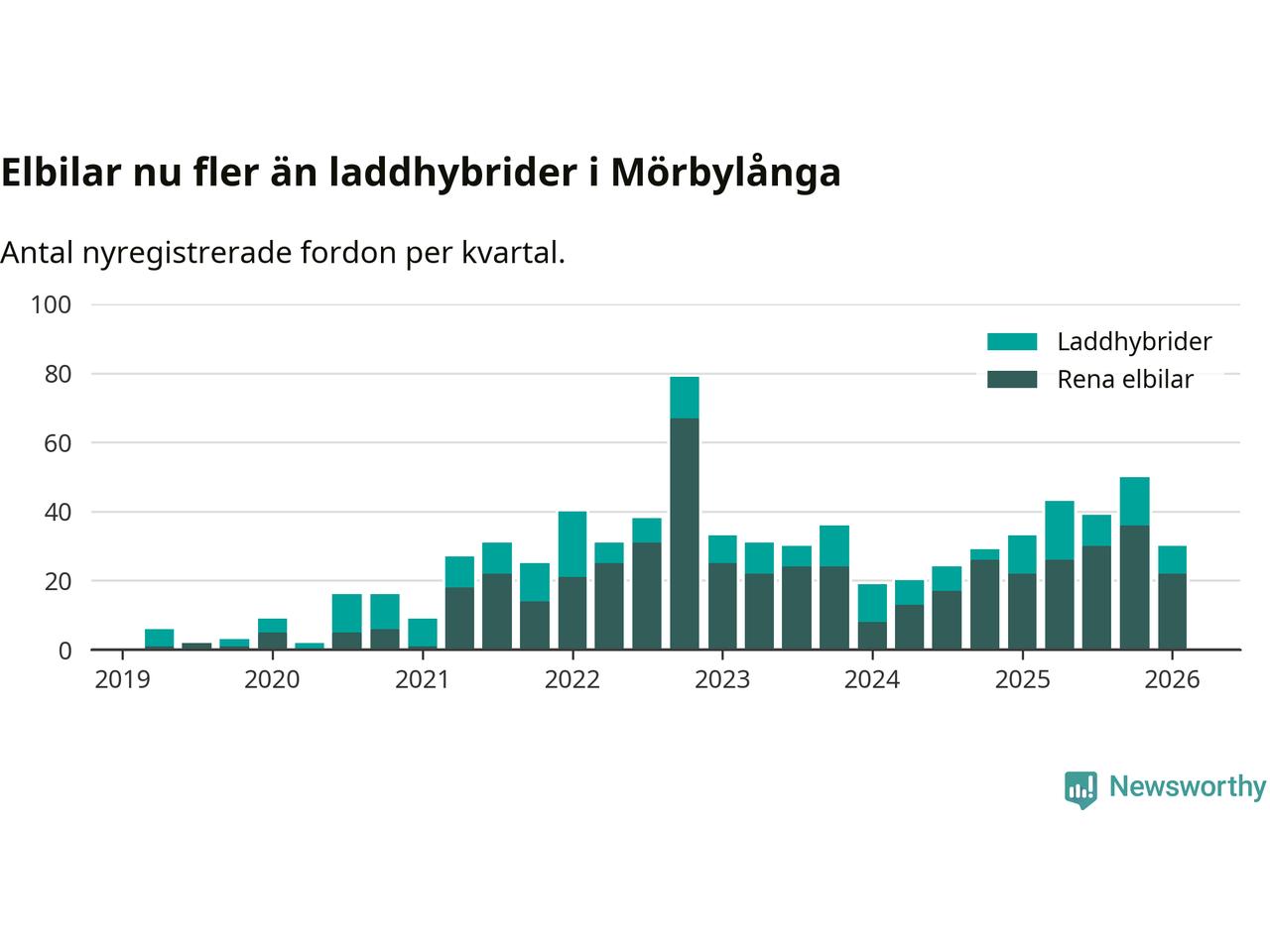 Under första kvartalet 2026 var 54 procent av alla nyregistrerade personbilar i Mörbylånga laddbara (sammanlagt registrerades 56 nya bilar). Merparten av de laddbara bilarna var rena elbilar (39 procent av alla).