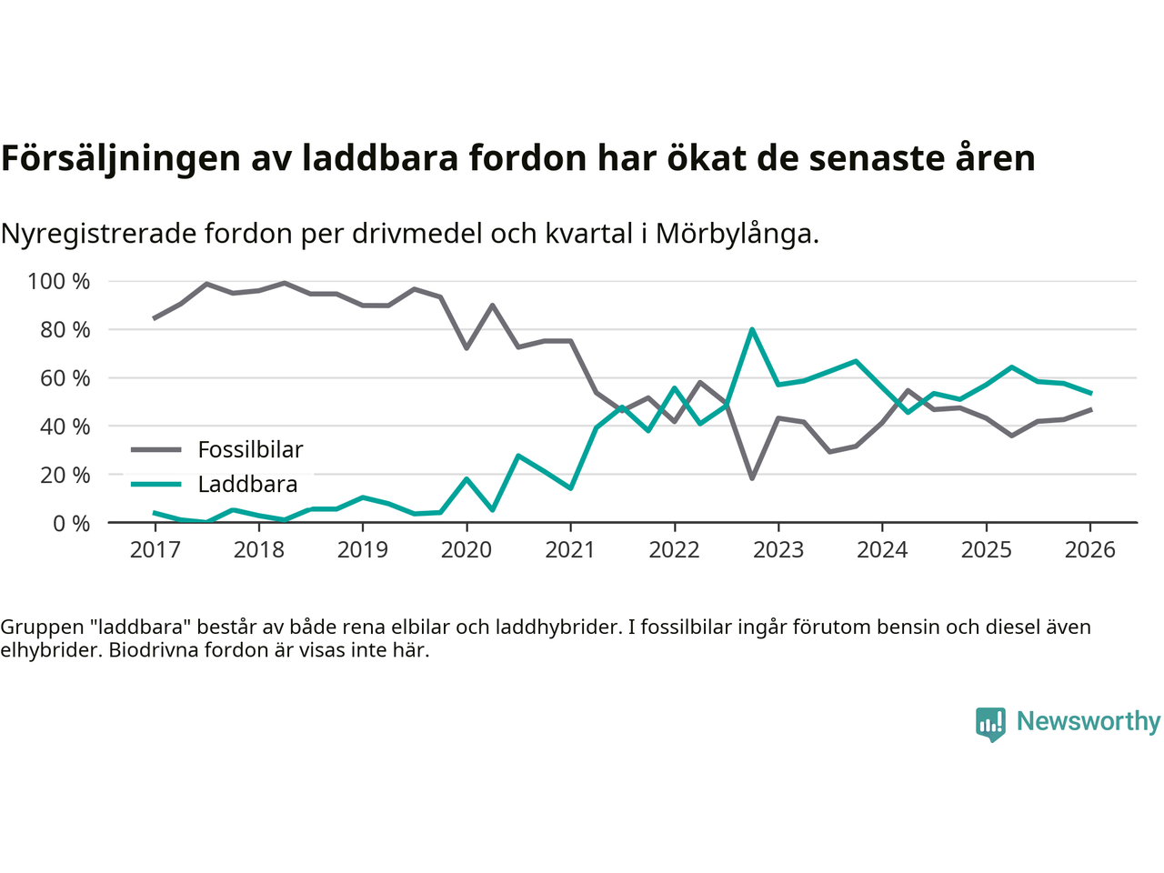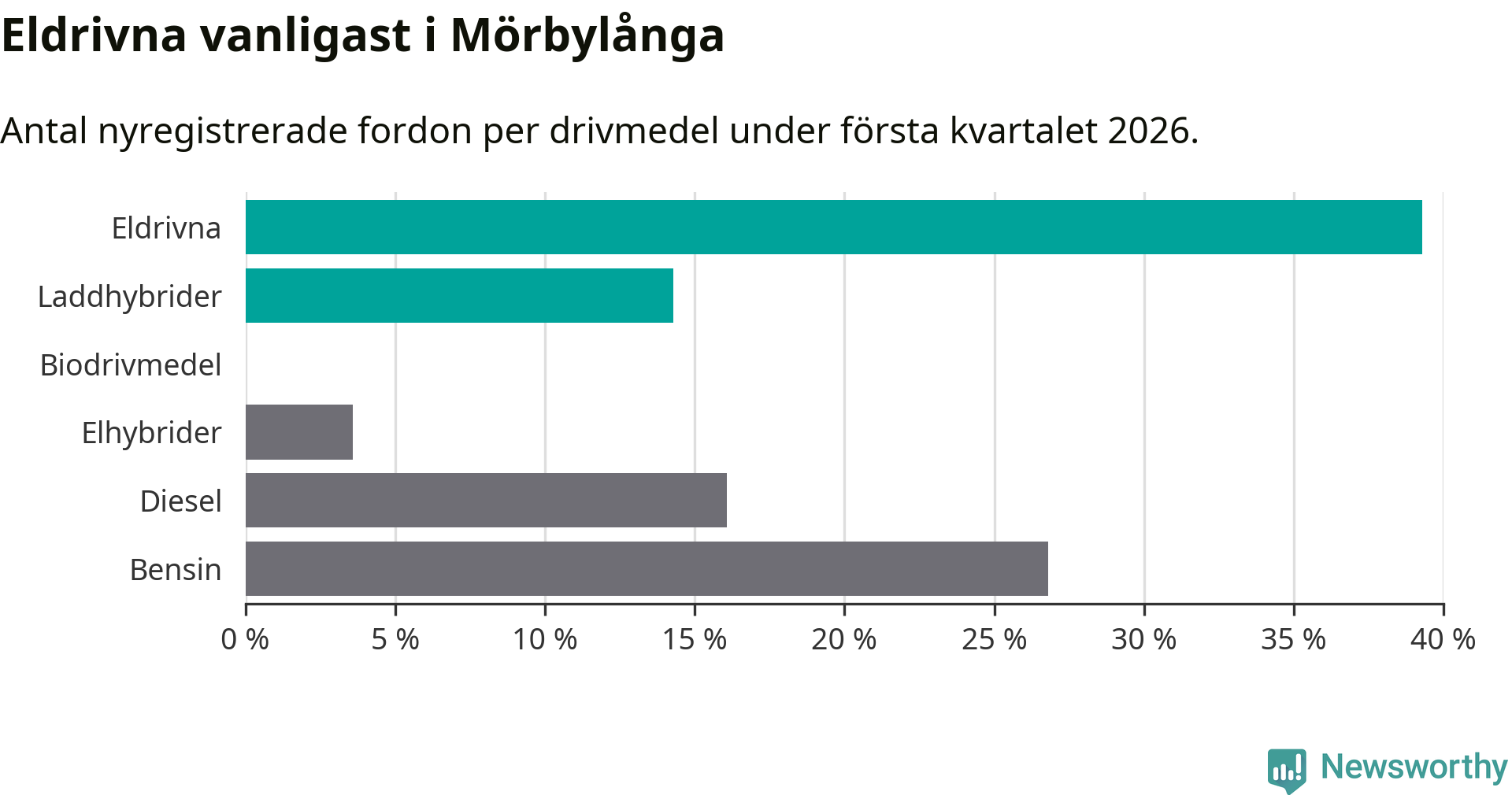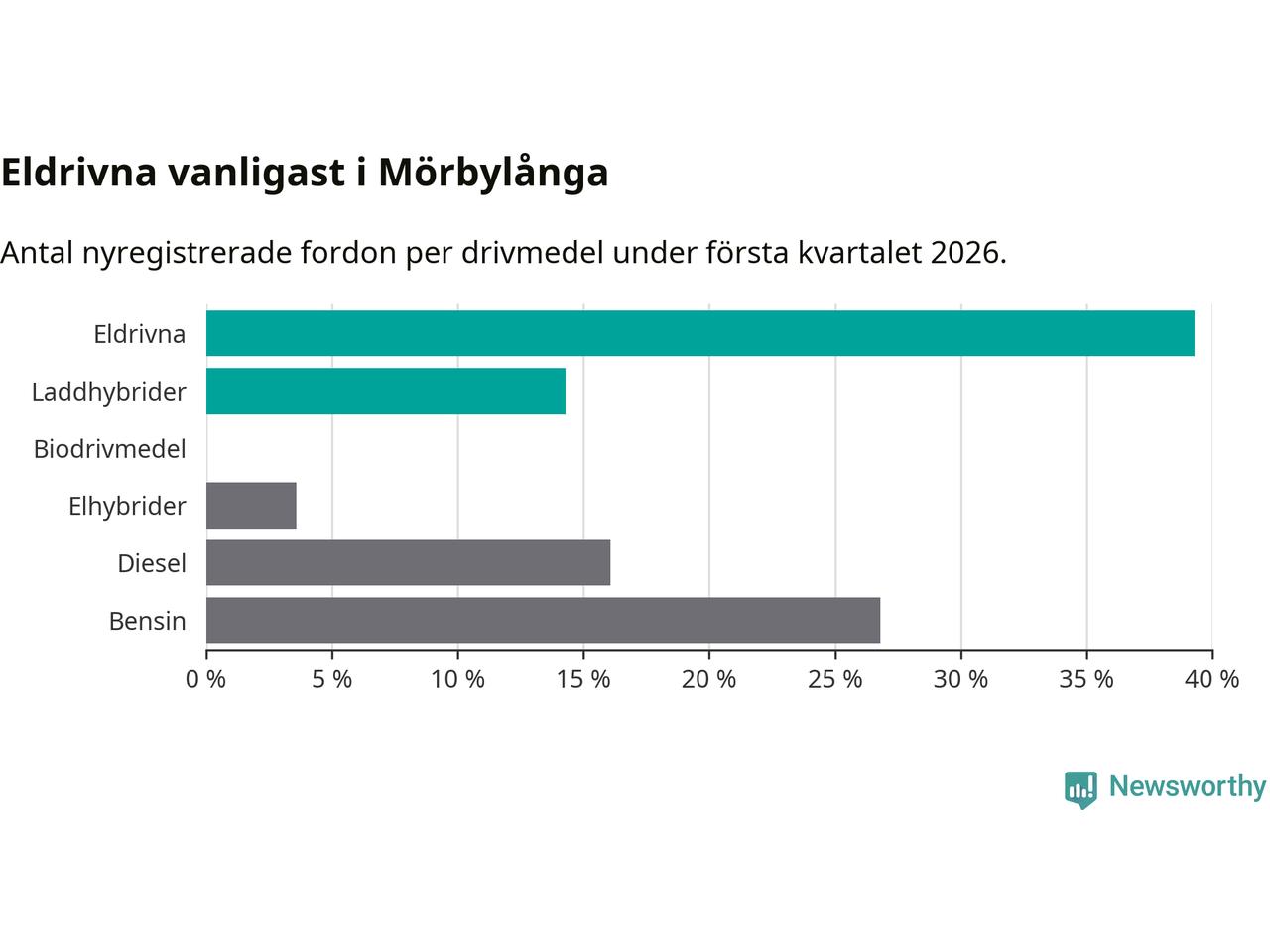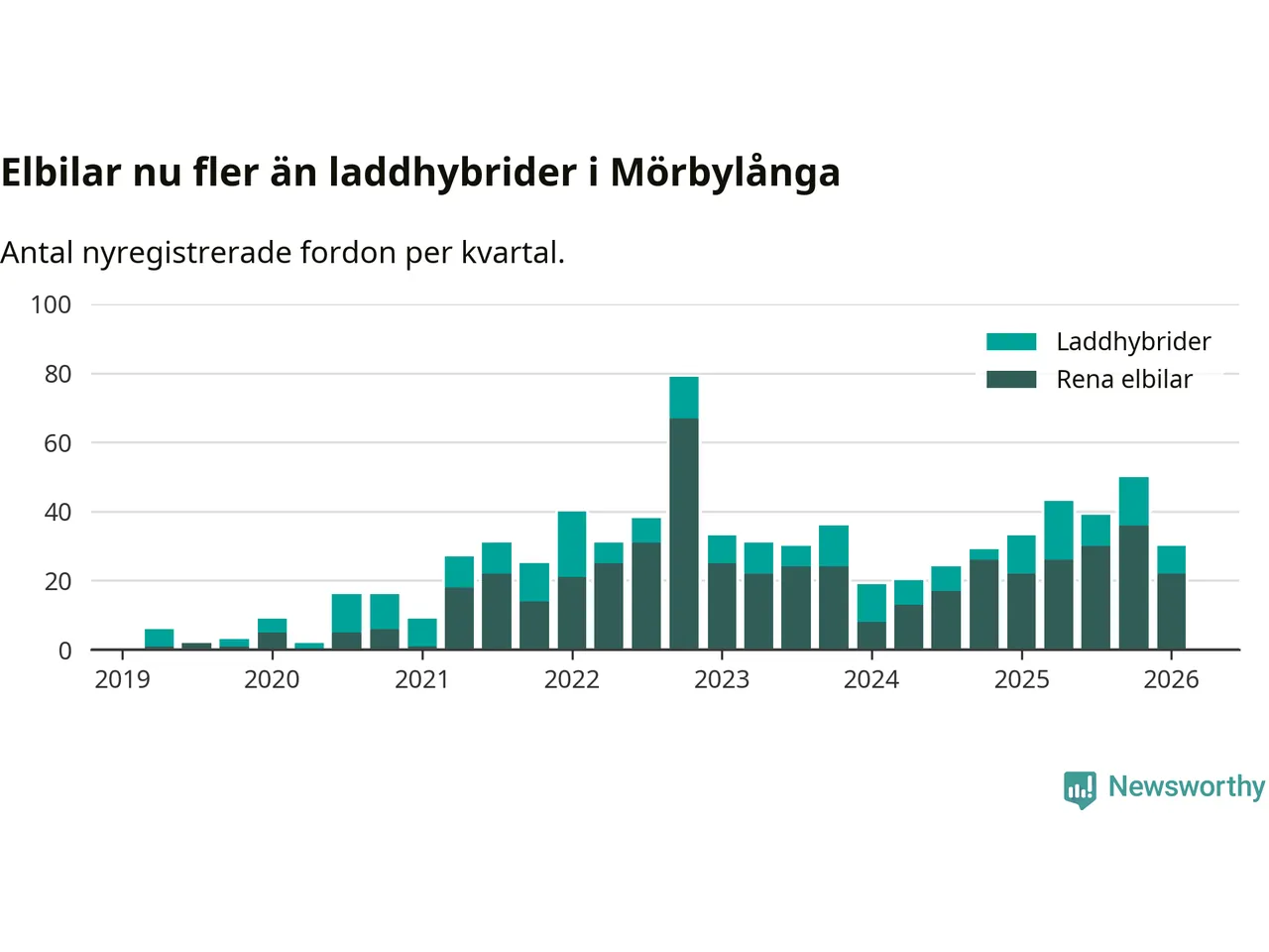 Under första kvartalet 2026 var 54 procent av alla nyregistrerade personbilar i Mörbylånga laddbara (sammanlagt registrerades 56 nya bilar). Merparten av de laddbara bilarna var rena elbilar (39 procent av alla).