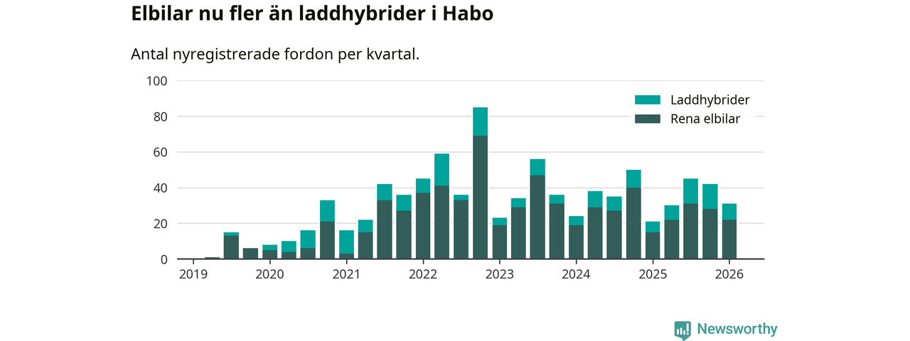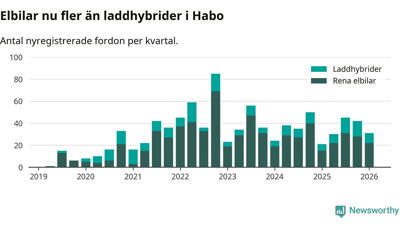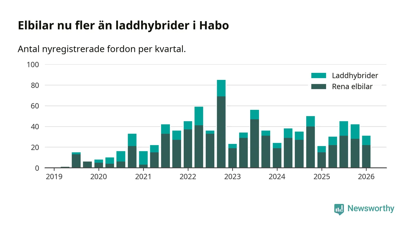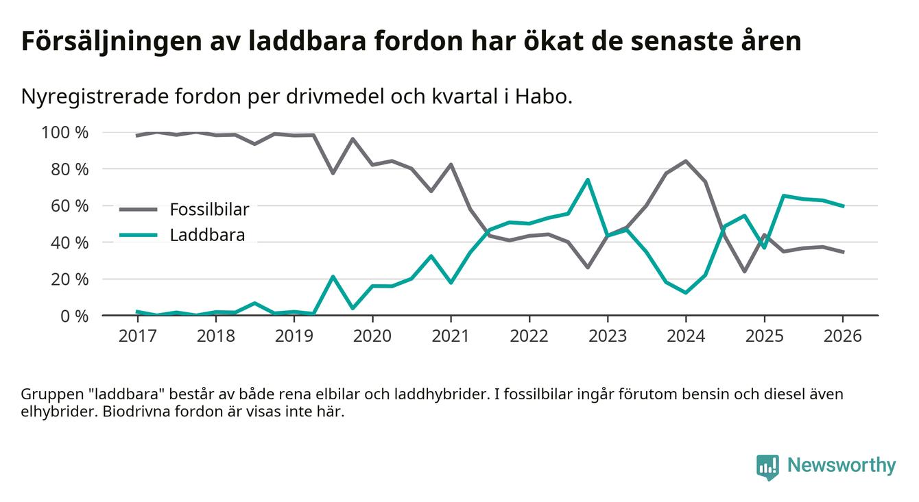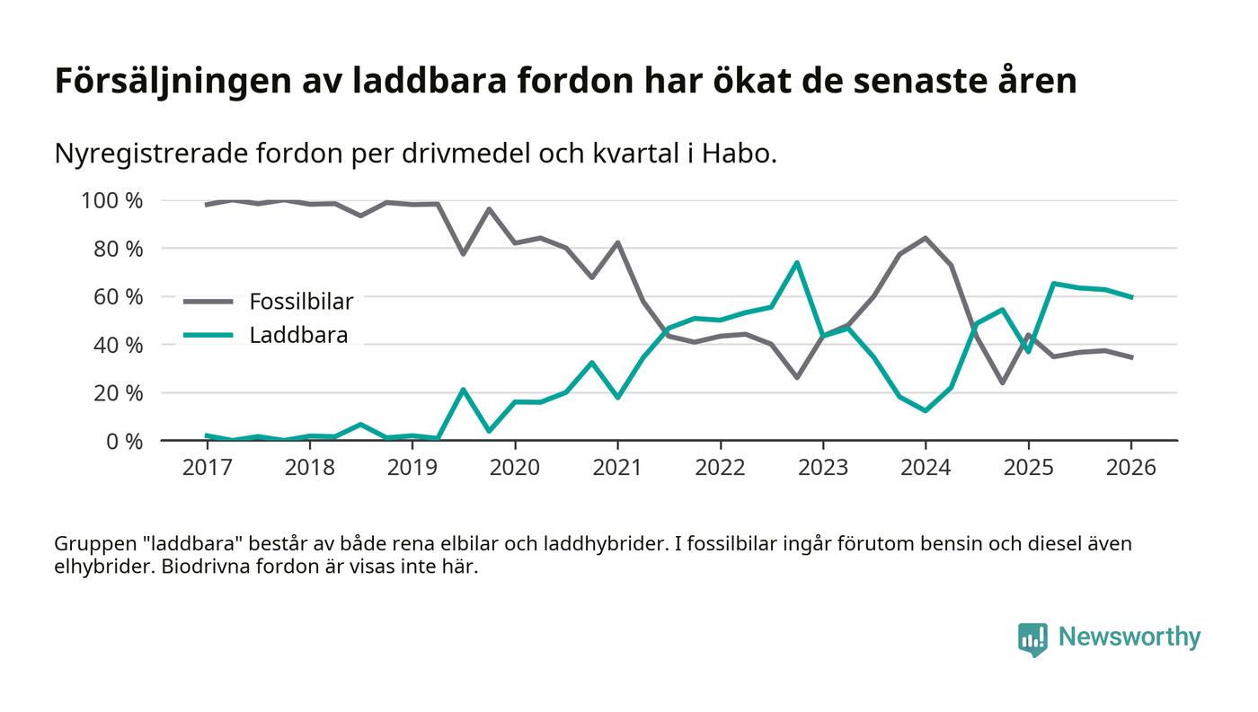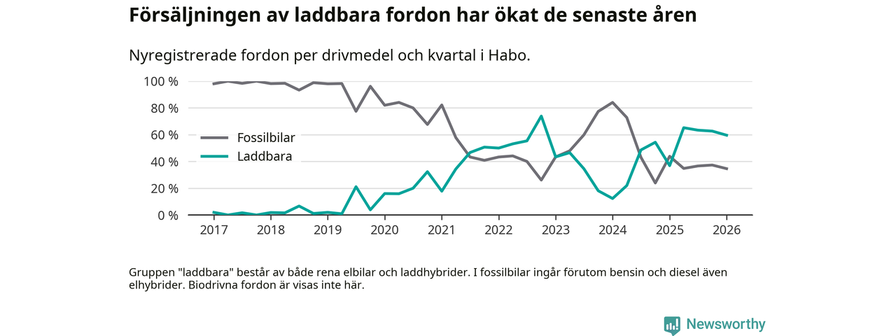 Under första kvartalet 2026 var 60 procent av alla nyregistrerade personbilar i Habo laddbara (sammanlagt registrerades 52 nya bilar). Merparten av de laddbara bilarna var rena elbilar (42 procent av alla).