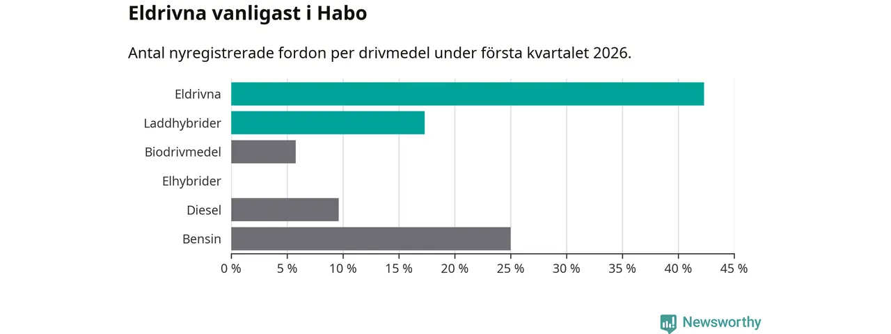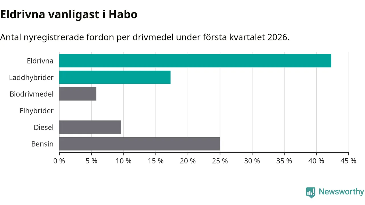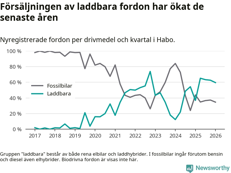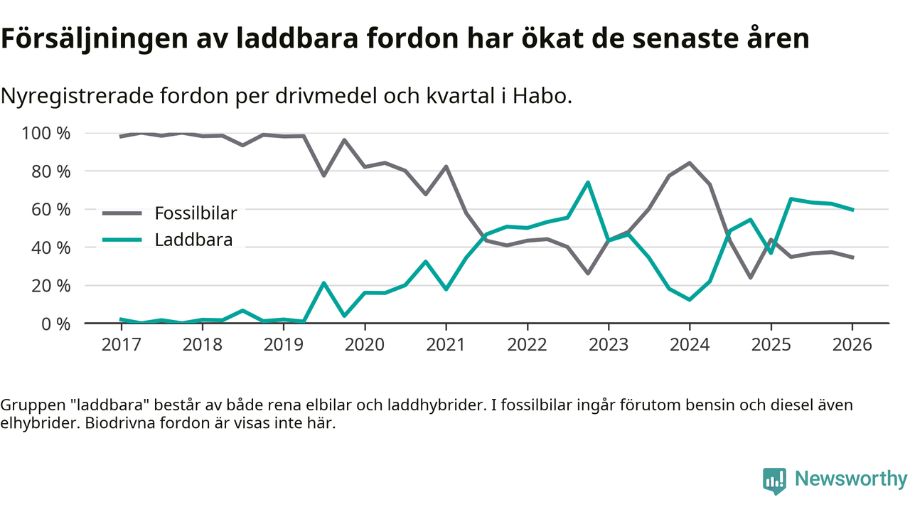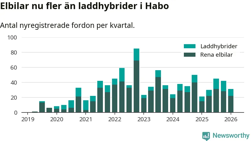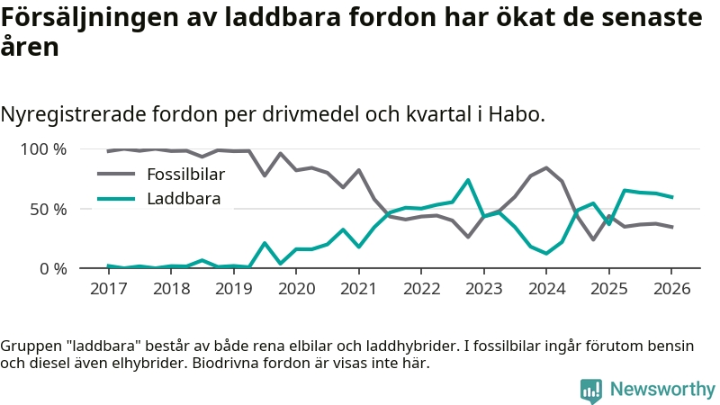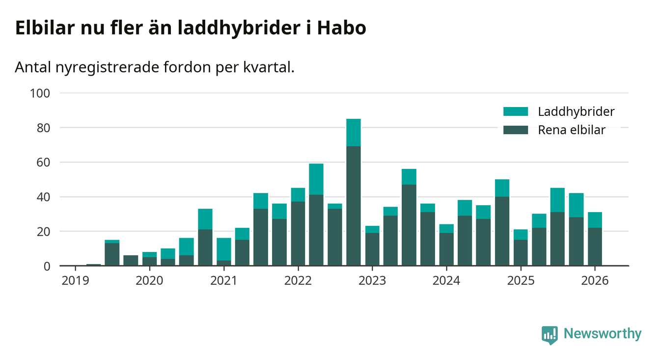 Under första kvartalet 2026 var 60 procent av alla nyregistrerade personbilar i Habo laddbara (sammanlagt registrerades 52 nya bilar). Merparten av de laddbara bilarna var rena elbilar (42 procent av alla).