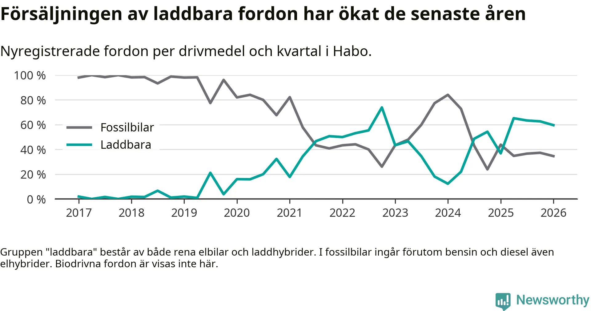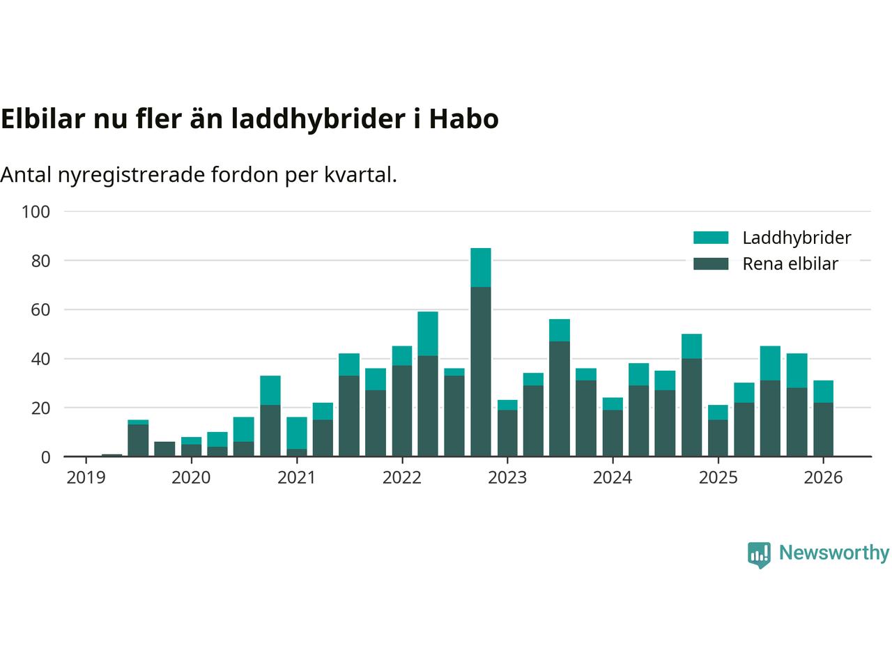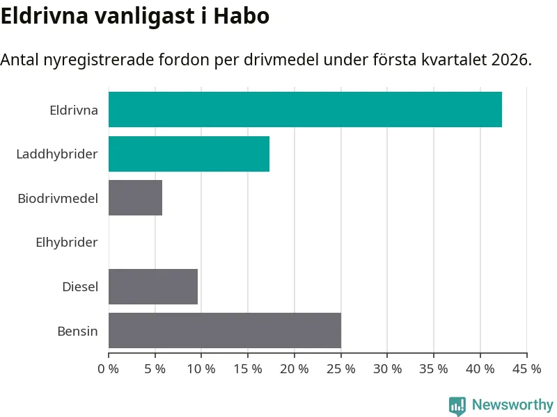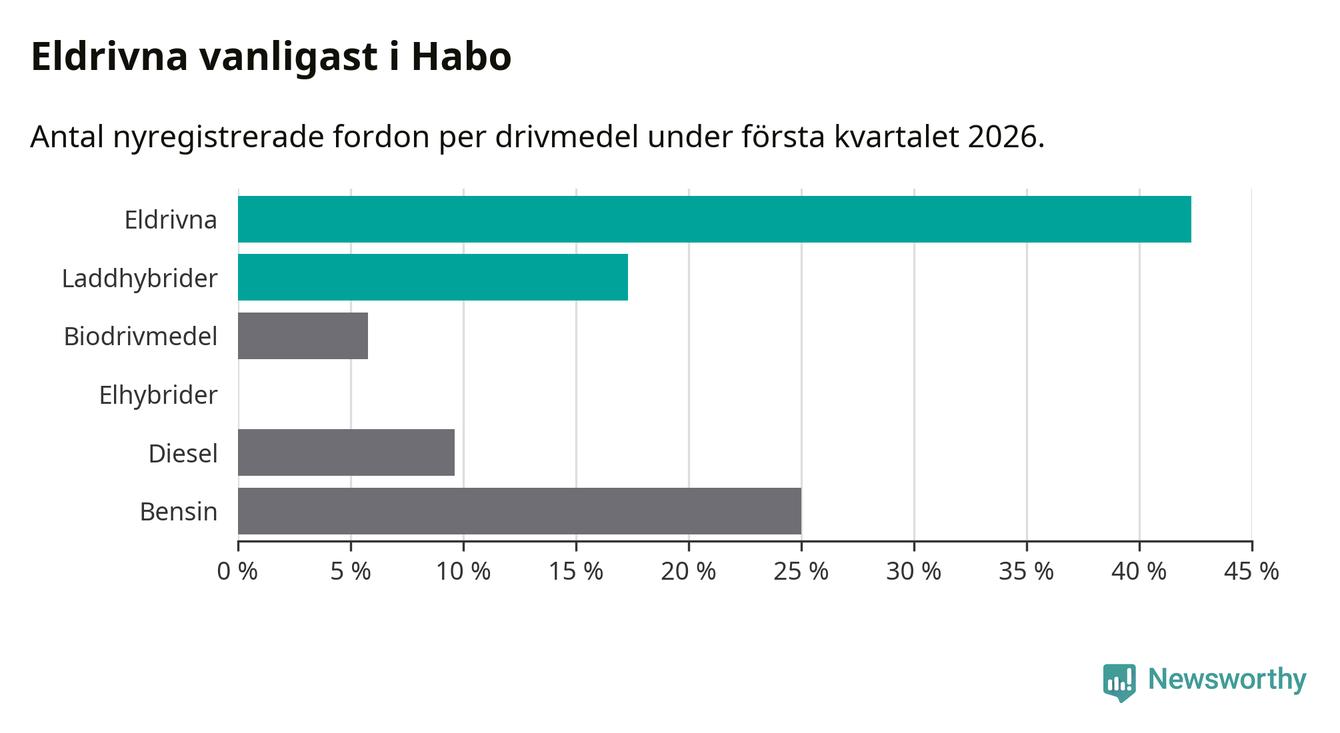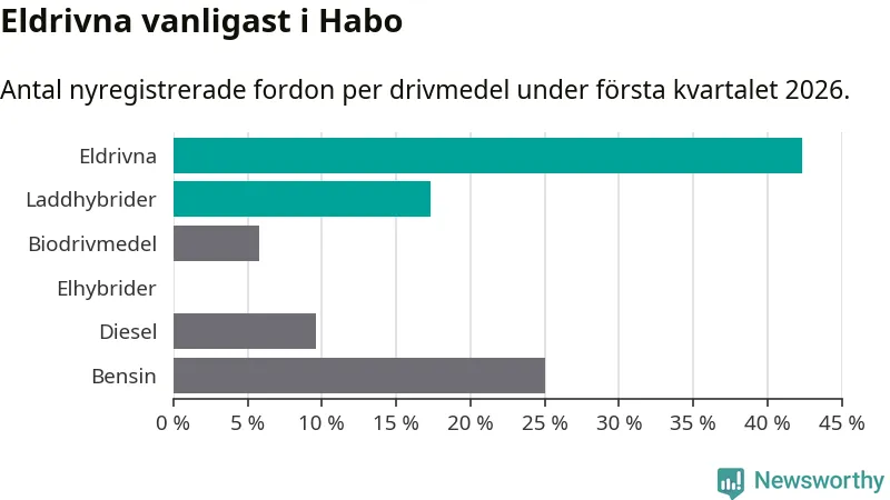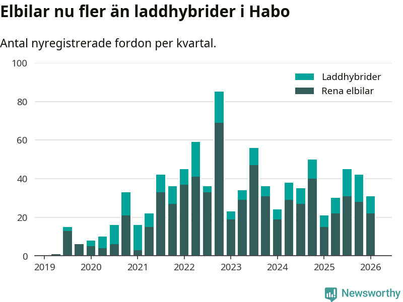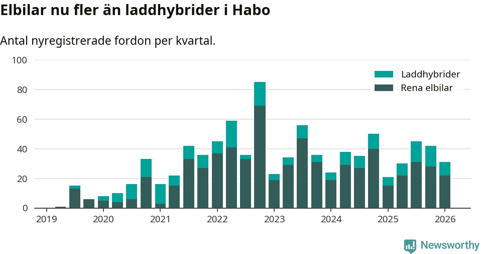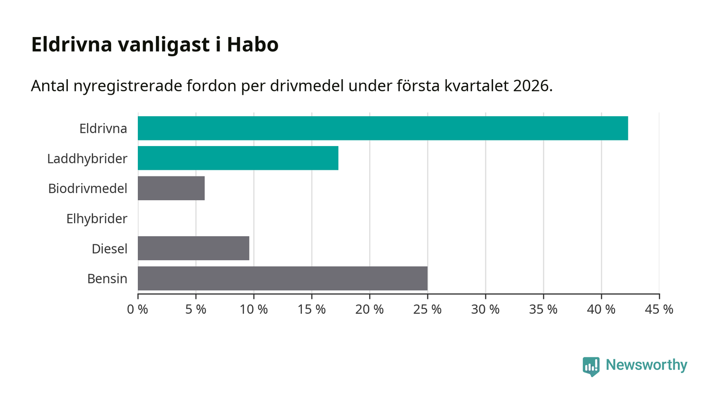 Under första kvartalet 2026 var 60 procent av alla nyregistrerade personbilar i Habo laddbara (sammanlagt registrerades 52 nya bilar). Merparten av de laddbara bilarna var rena elbilar (42 procent av alla).