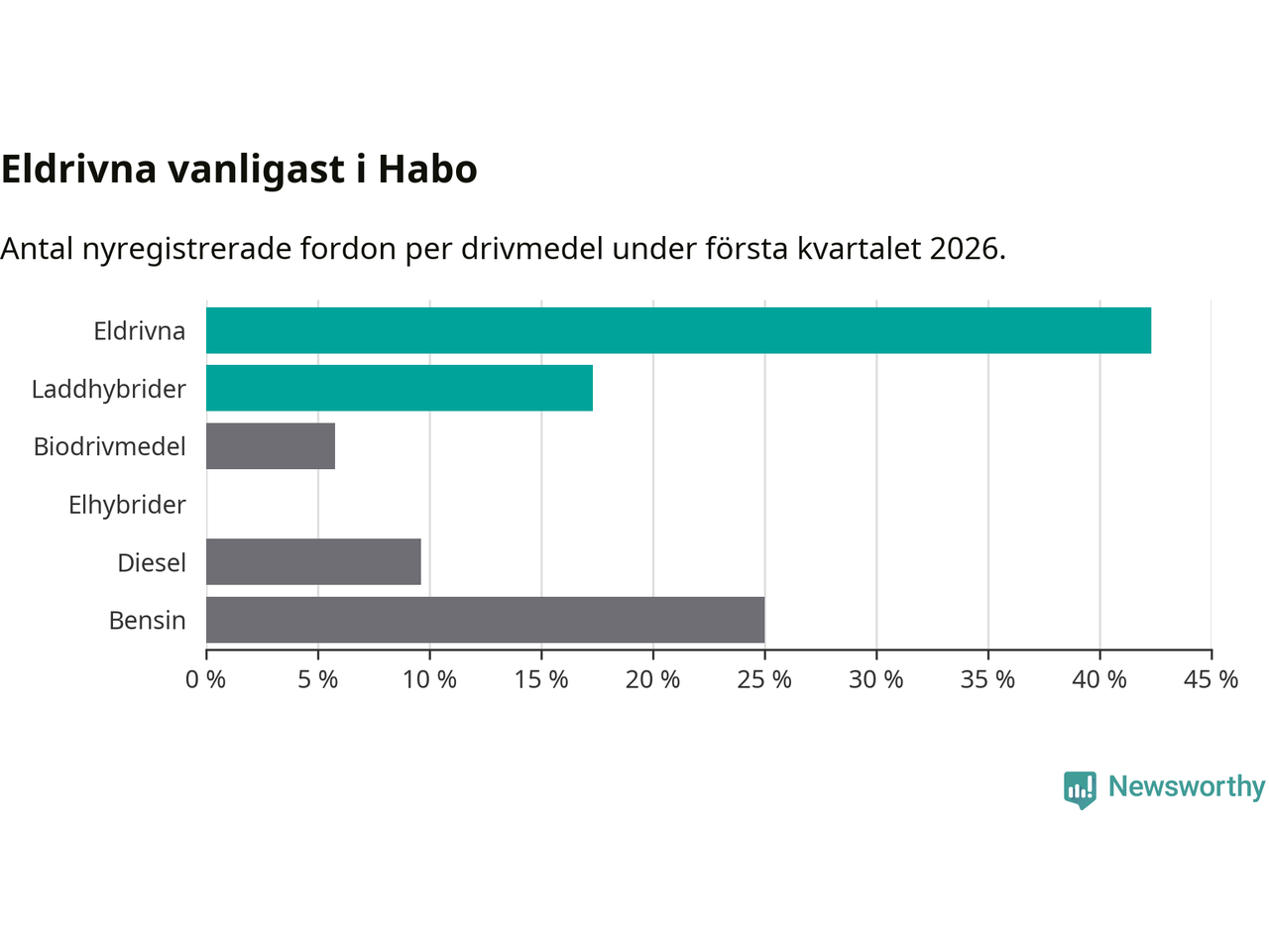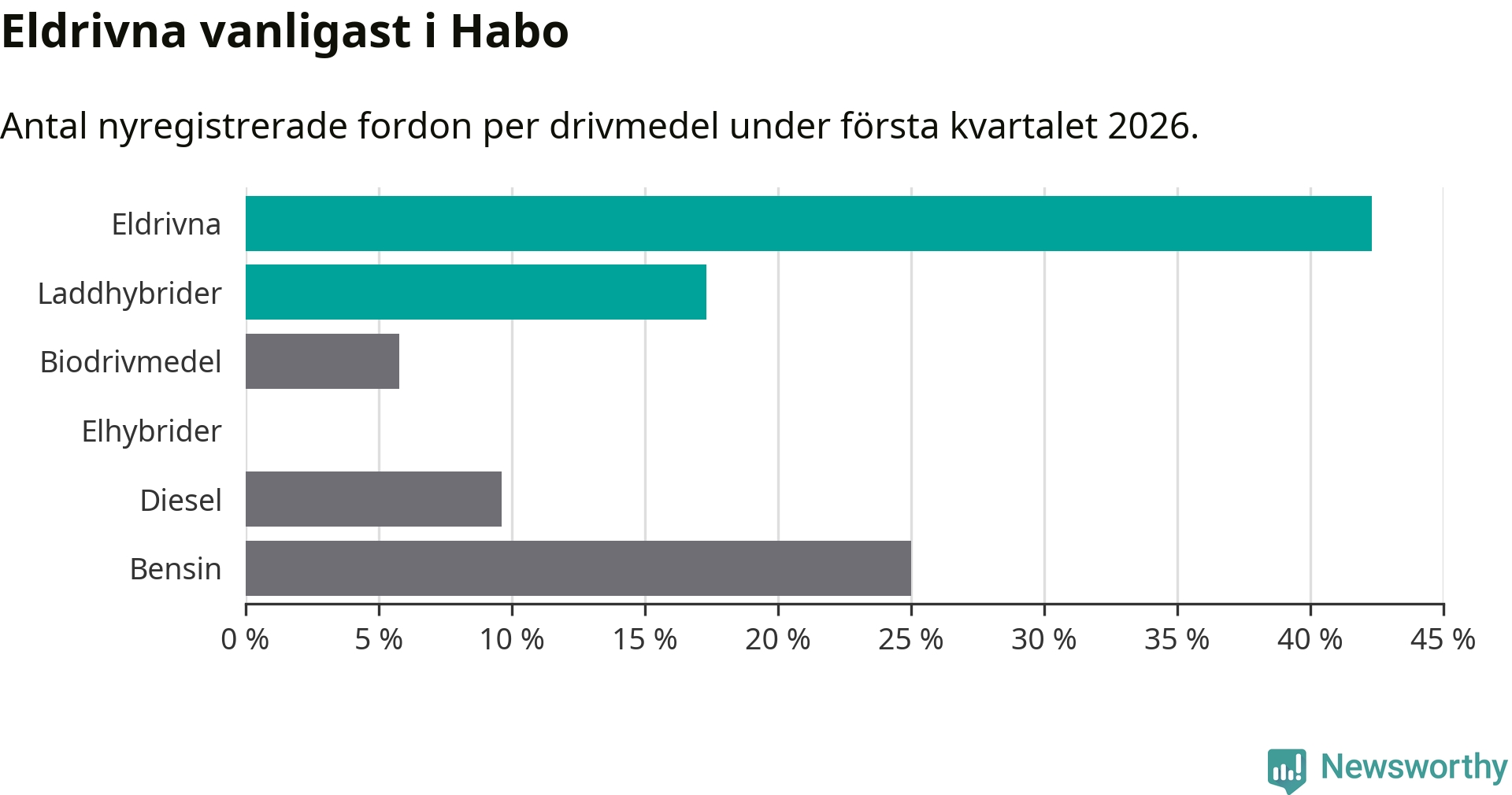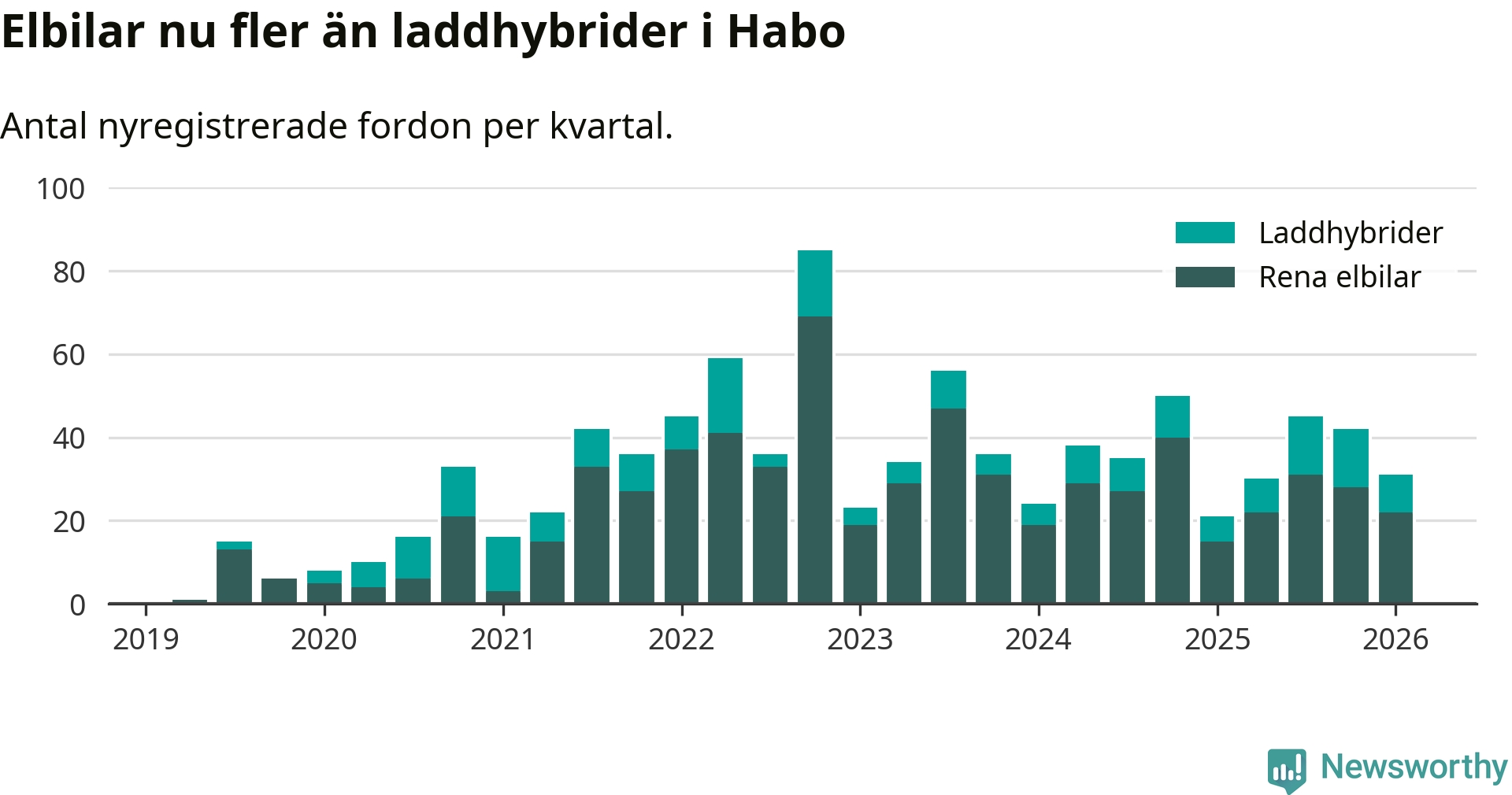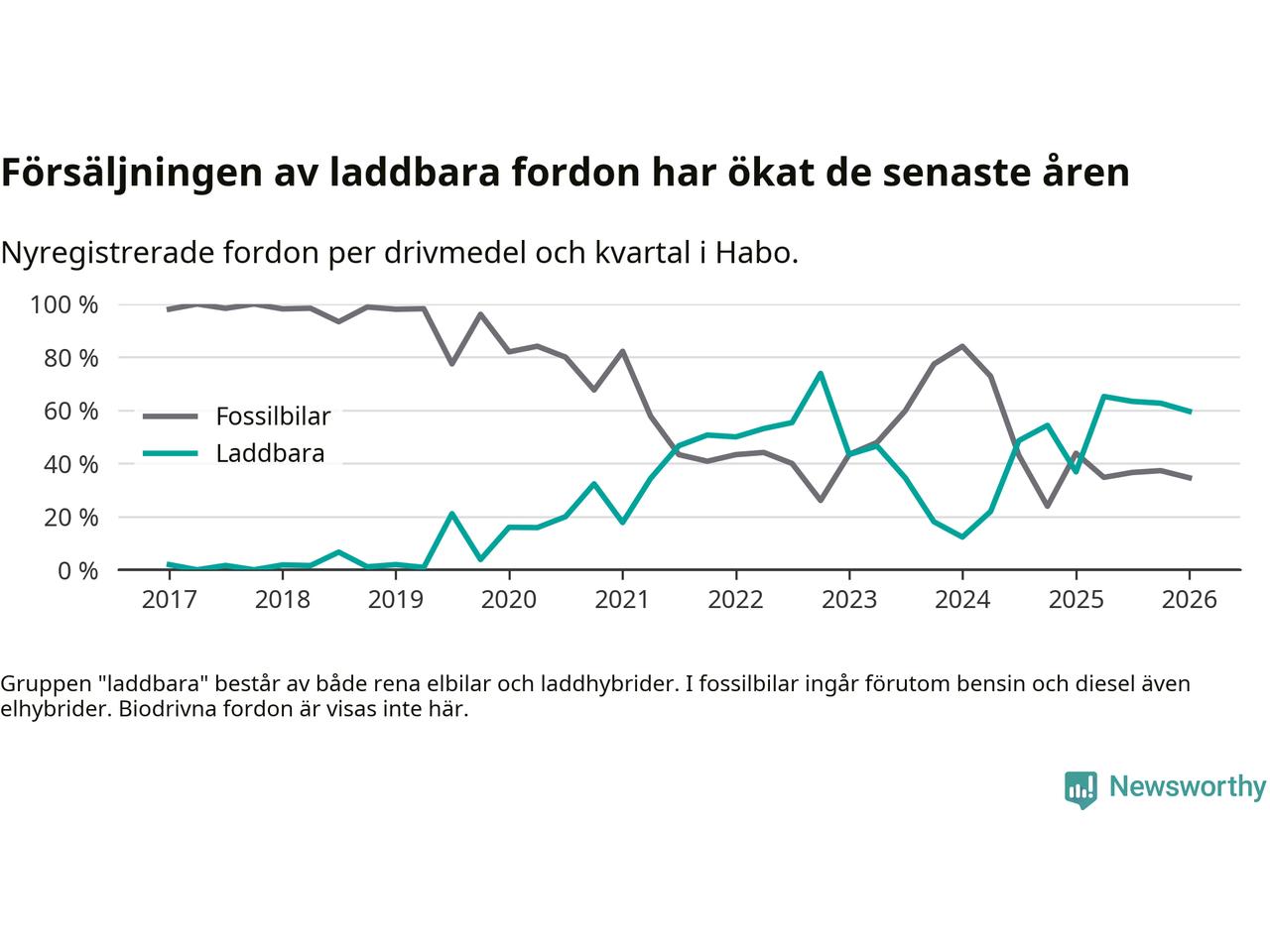 Under första kvartalet 2026 var 60 procent av alla nyregistrerade personbilar i Habo laddbara (sammanlagt registrerades 52 nya bilar). Merparten av de laddbara bilarna var rena elbilar (42 procent av alla).