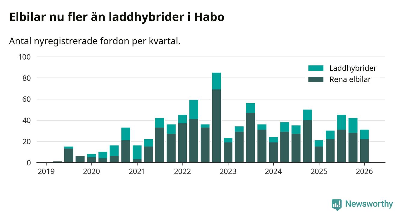 I Habo minskade andelen laddbara bilar under första kvartalet jämfört med kvartalet innan (−3,1 procentenheter). Nyregistreringen peakade under fjärde kvartalet 2022 då 74 procent av de nya bilarna var laddbara.