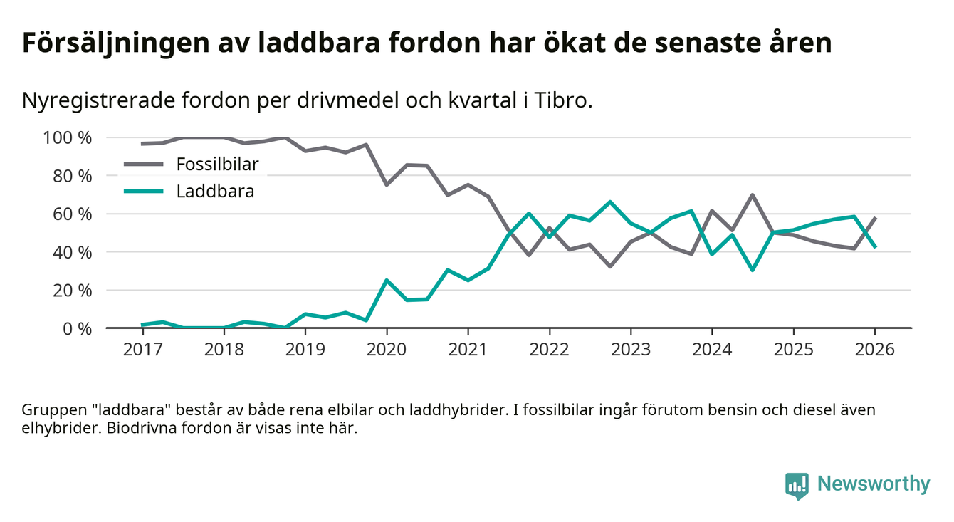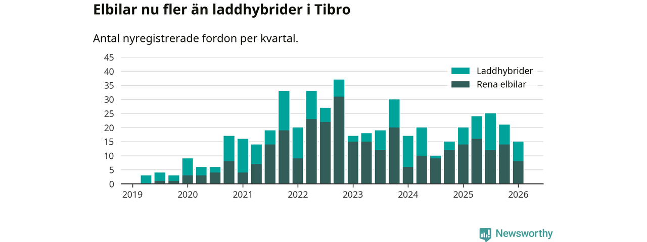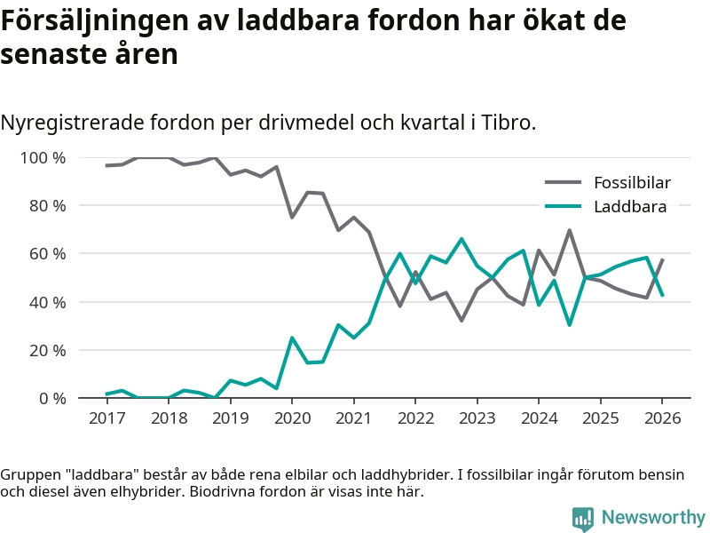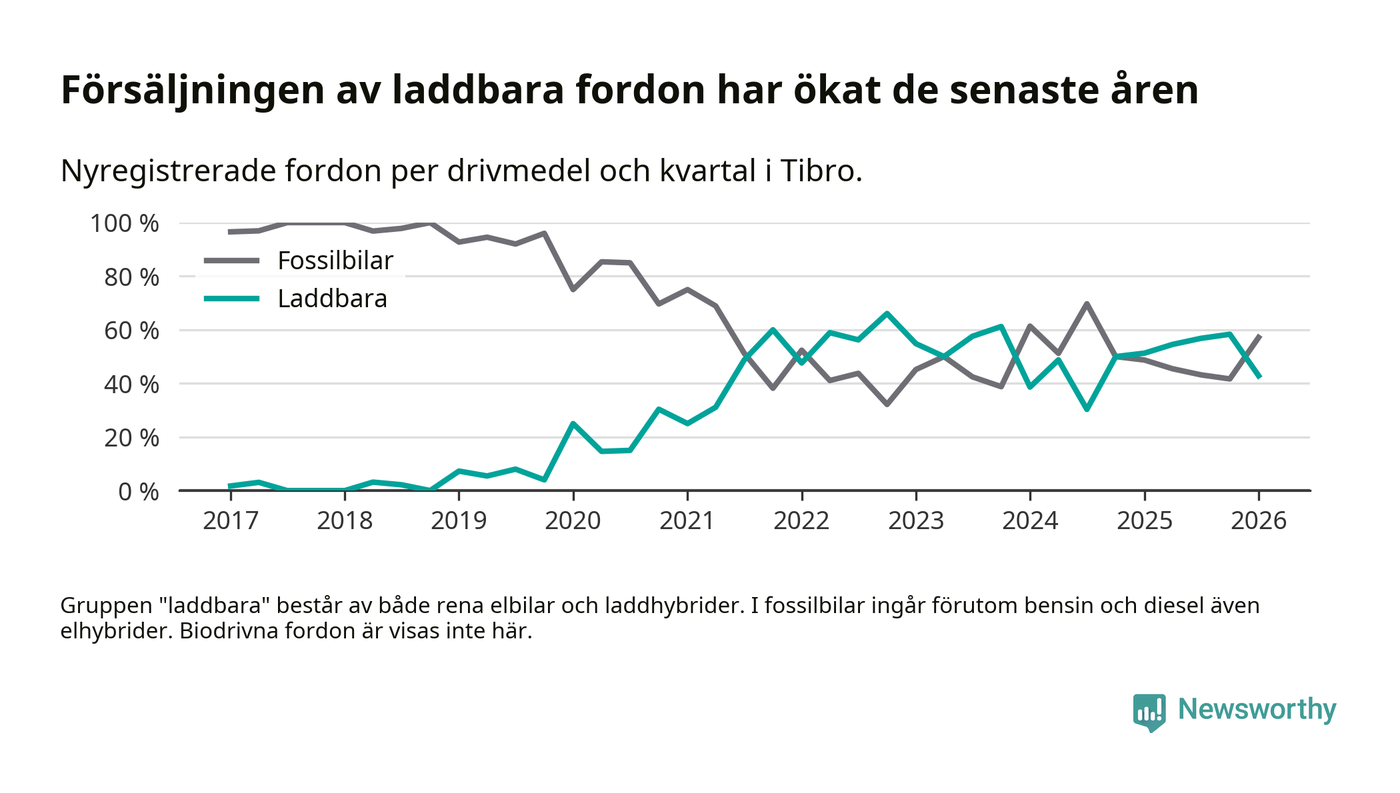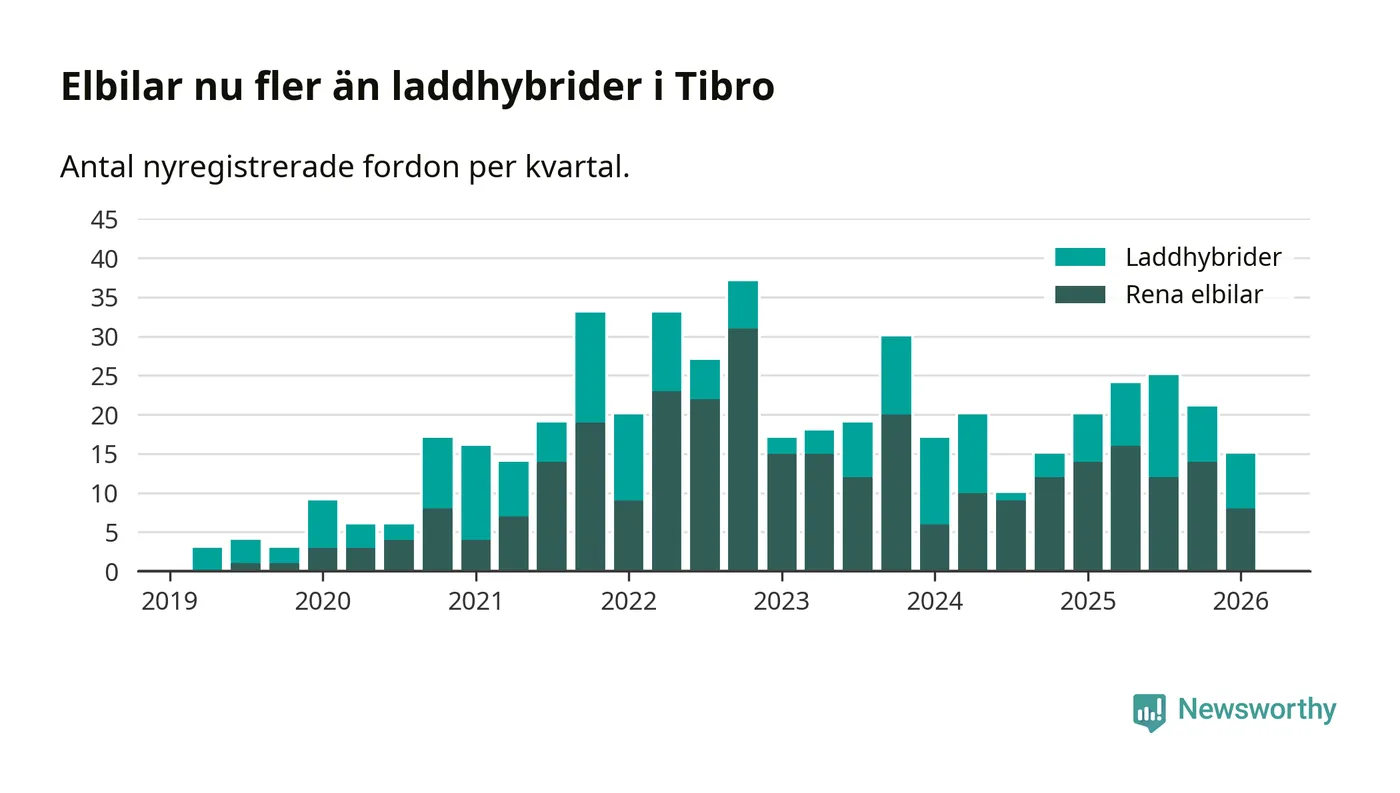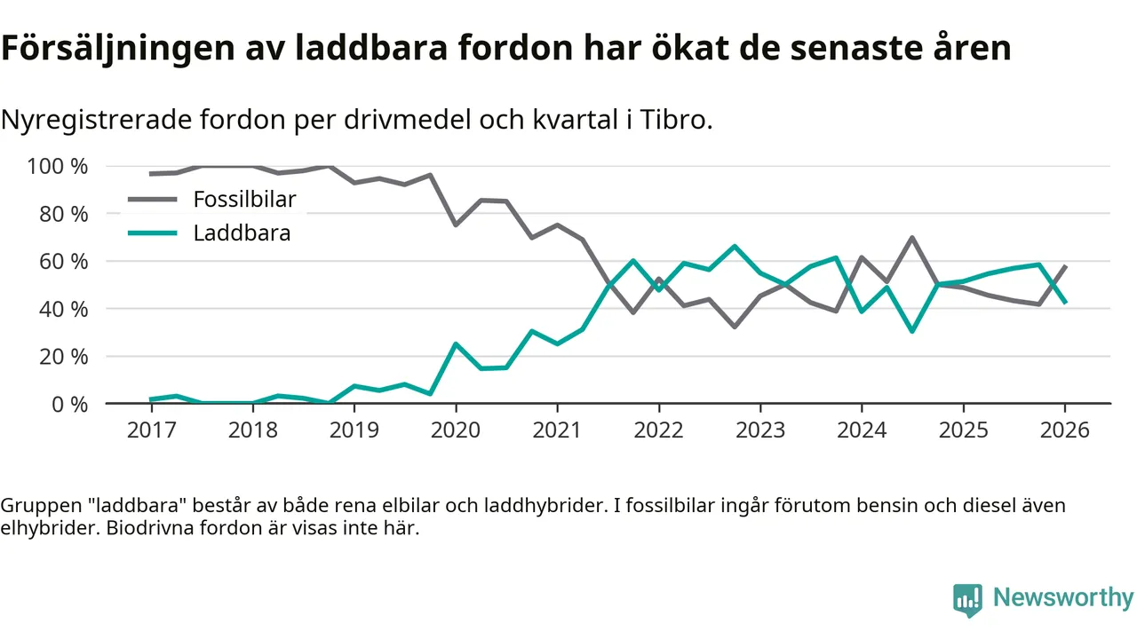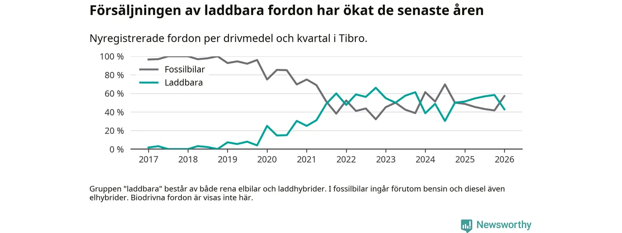 Under första kvartalet 2026 var 43 procent av alla nyregistrerade personbilar i Tibro laddbara (sammanlagt registrerades 35 nya bilar). Merparten av de laddbara bilarna var rena elbilar (23 procent av alla).