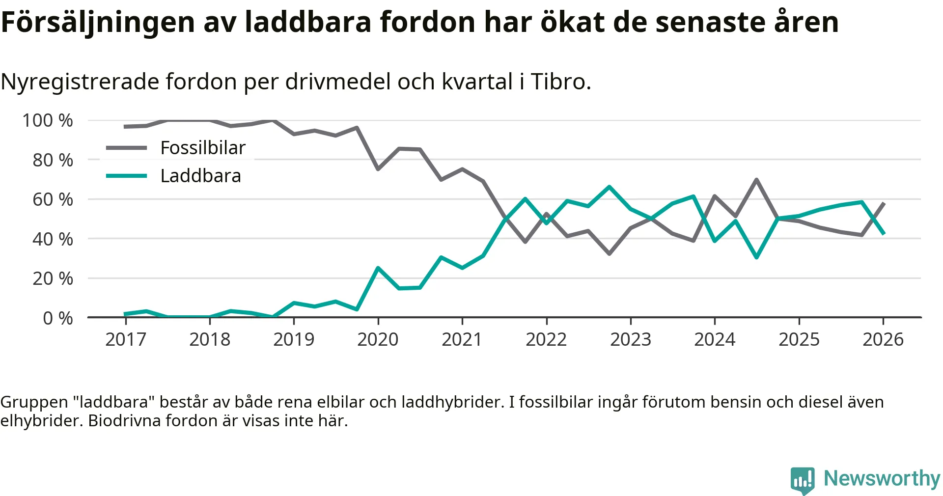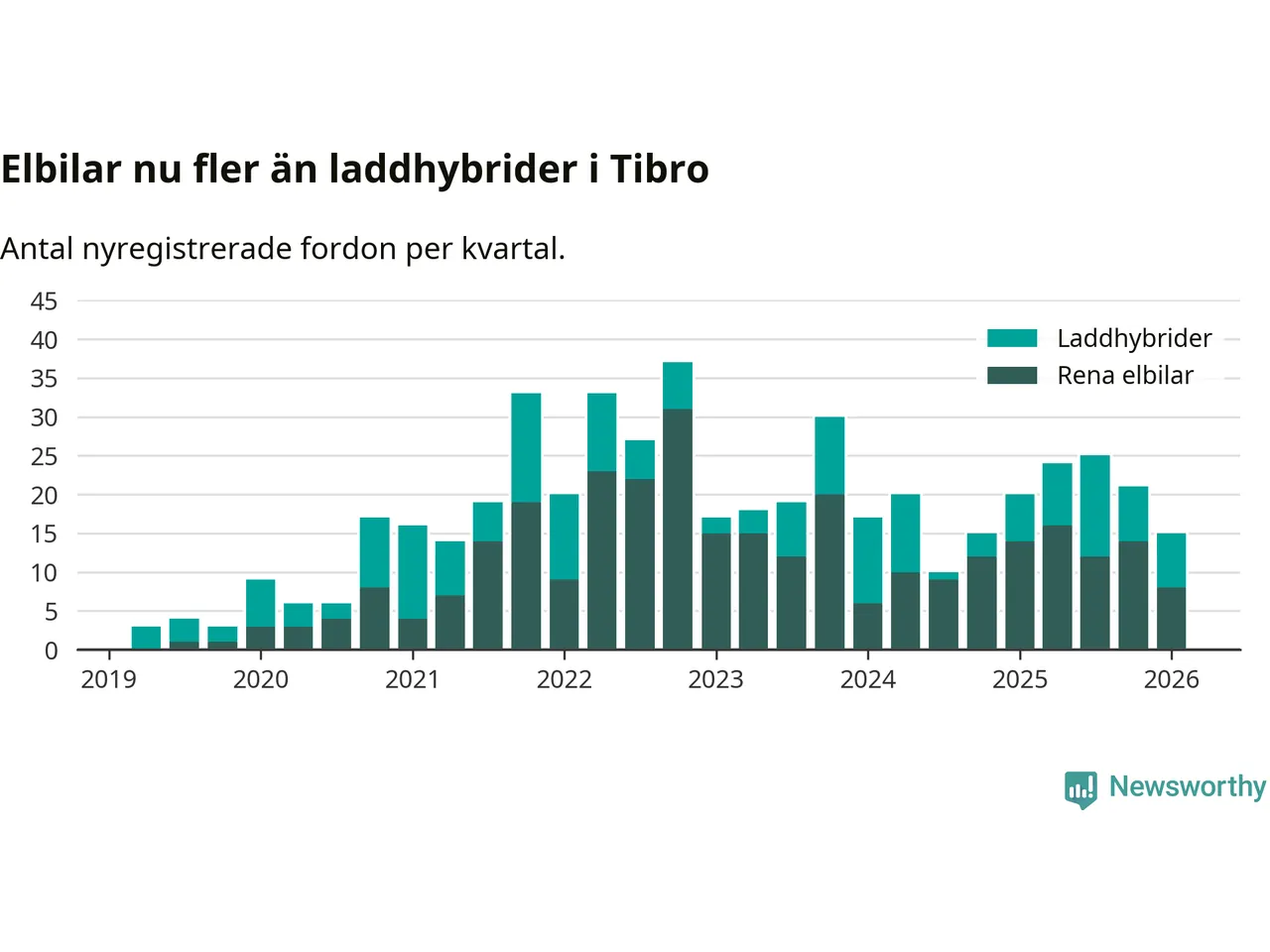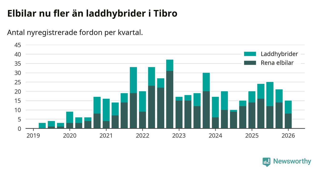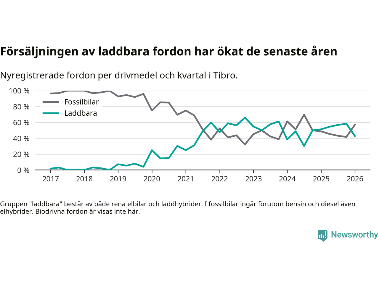 Under första kvartalet 2026 var 43 procent av alla nyregistrerade personbilar i Tibro laddbara (sammanlagt registrerades 35 nya bilar). Merparten av de laddbara bilarna var rena elbilar (23 procent av alla).