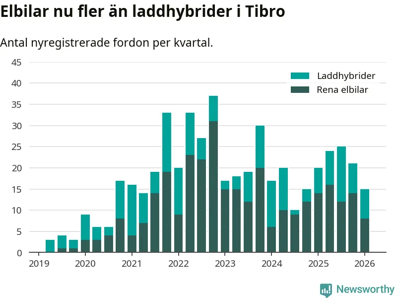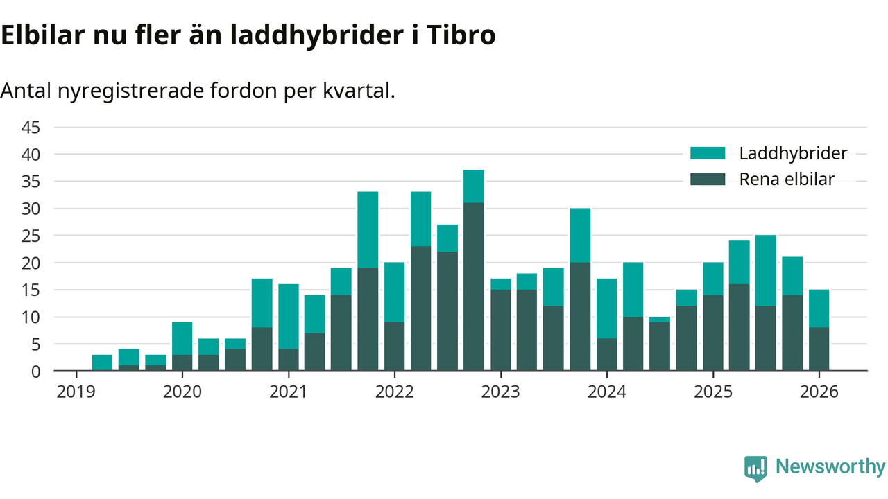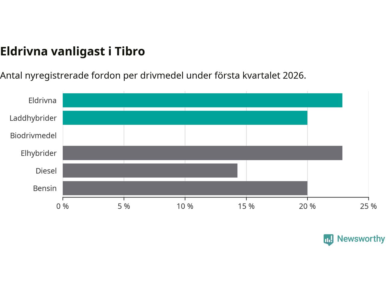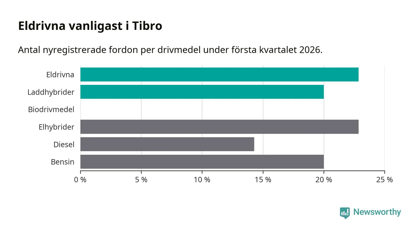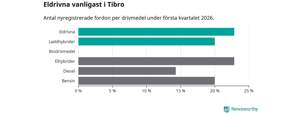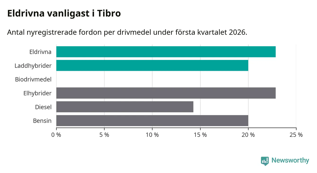 Under första kvartalet 2026 var 43 procent av alla nyregistrerade personbilar i Tibro laddbara (sammanlagt registrerades 35 nya bilar). Merparten av de laddbara bilarna var rena elbilar (23 procent av alla).