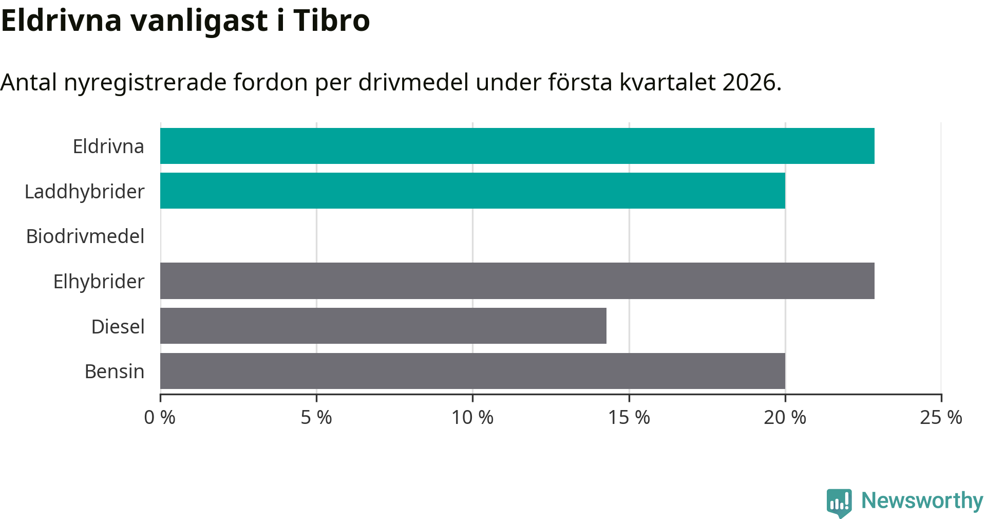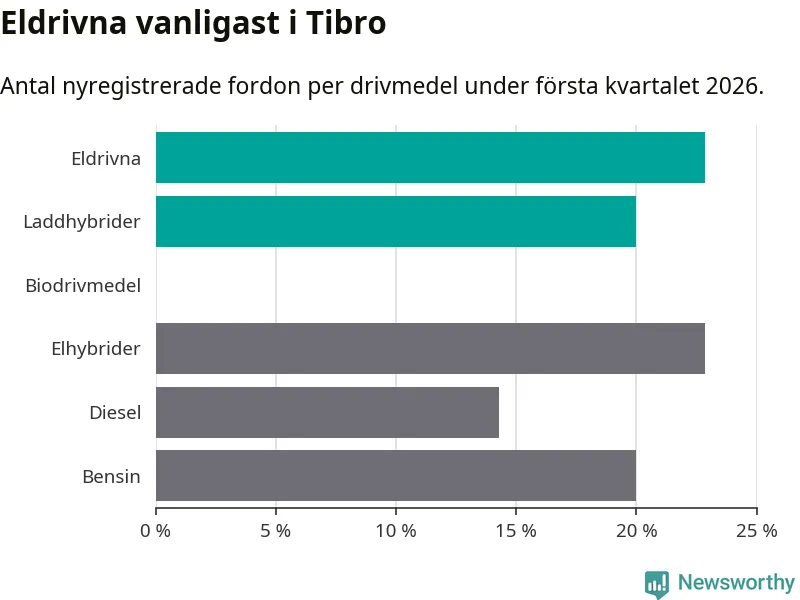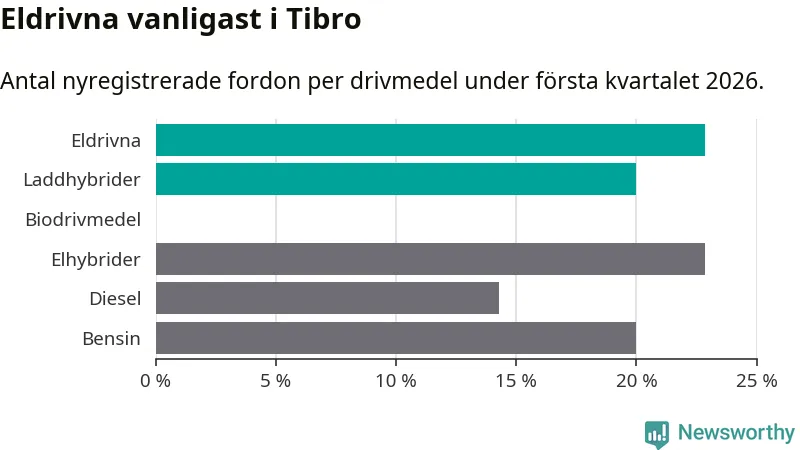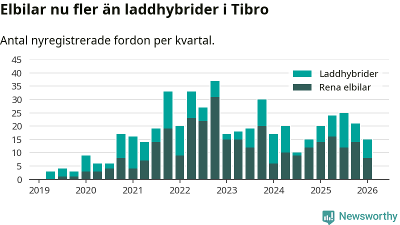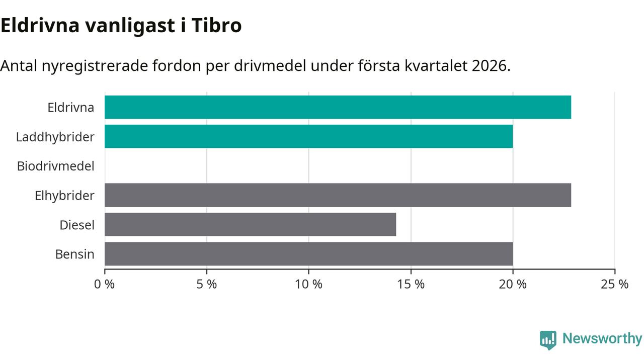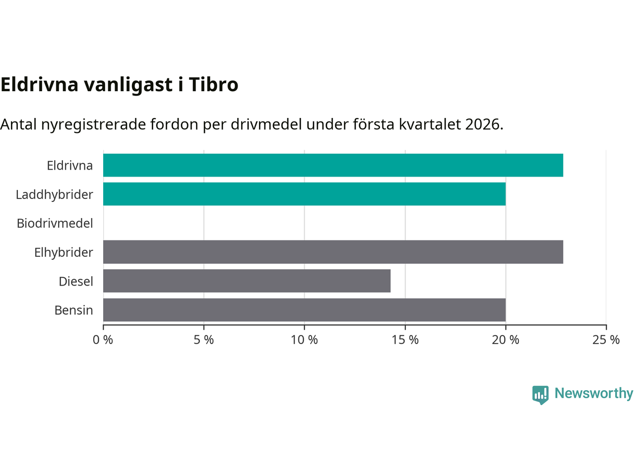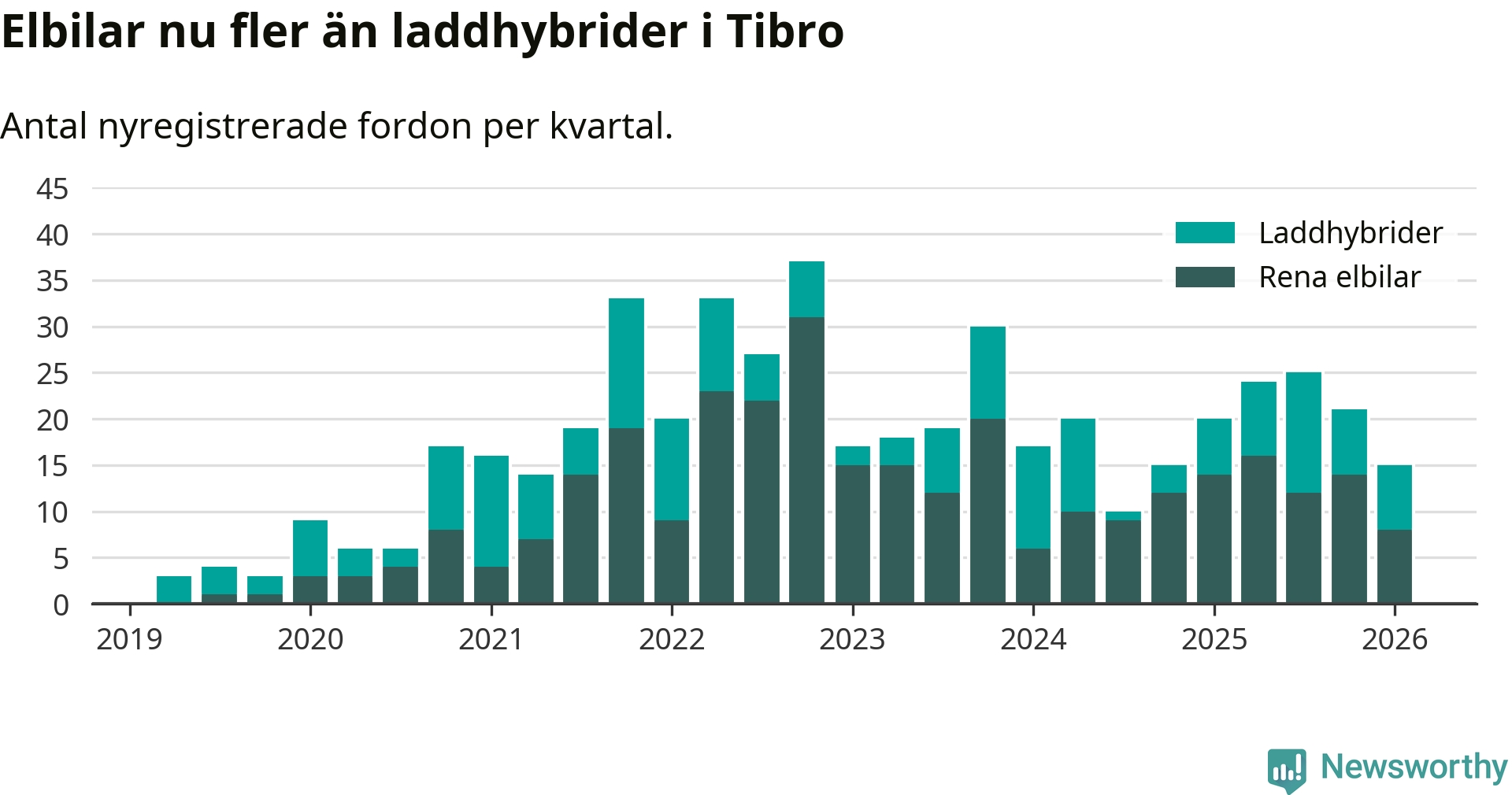 Under första kvartalet 2026 var 43 procent av alla nyregistrerade personbilar i Tibro laddbara (sammanlagt registrerades 35 nya bilar). Merparten av de laddbara bilarna var rena elbilar (23 procent av alla).