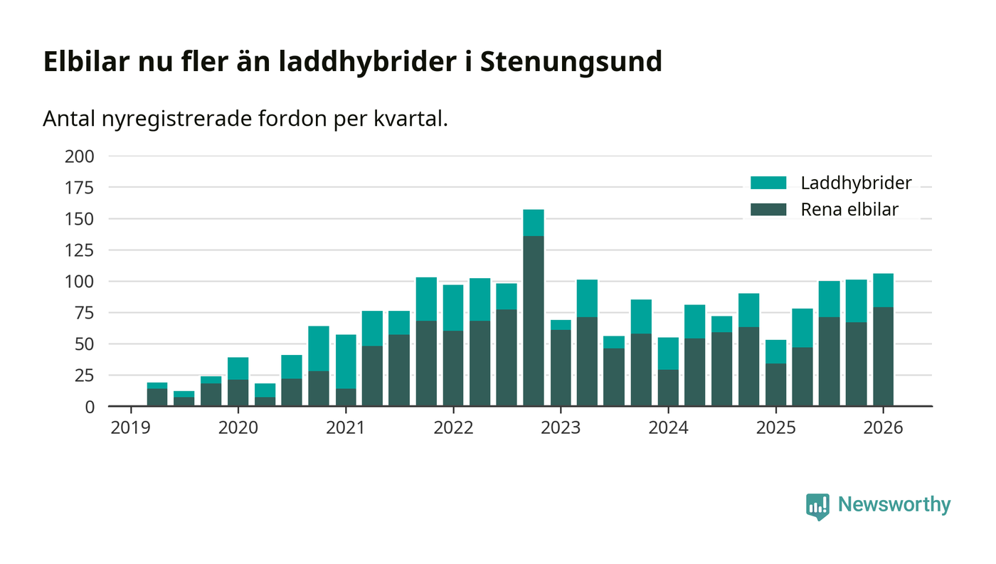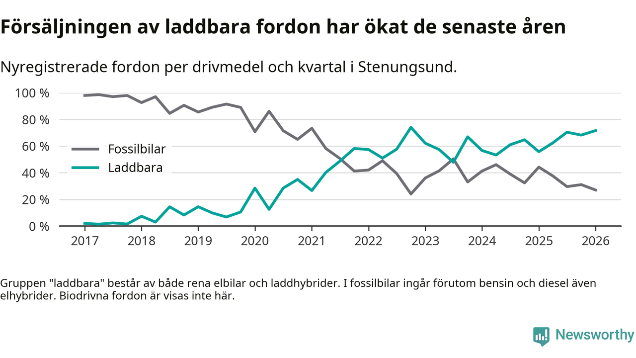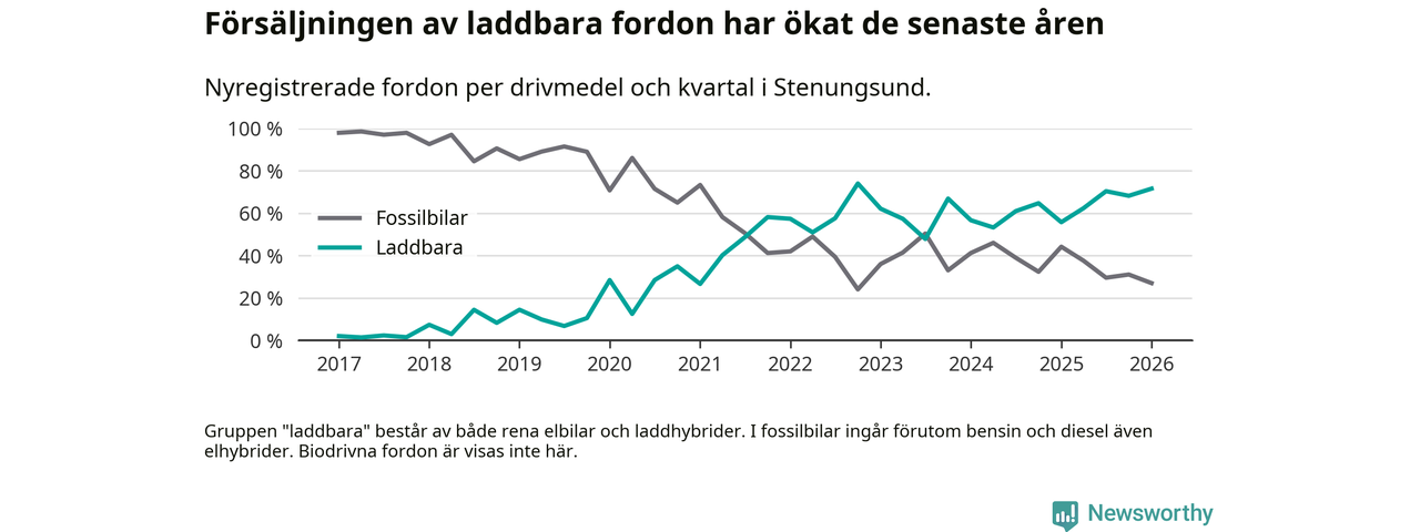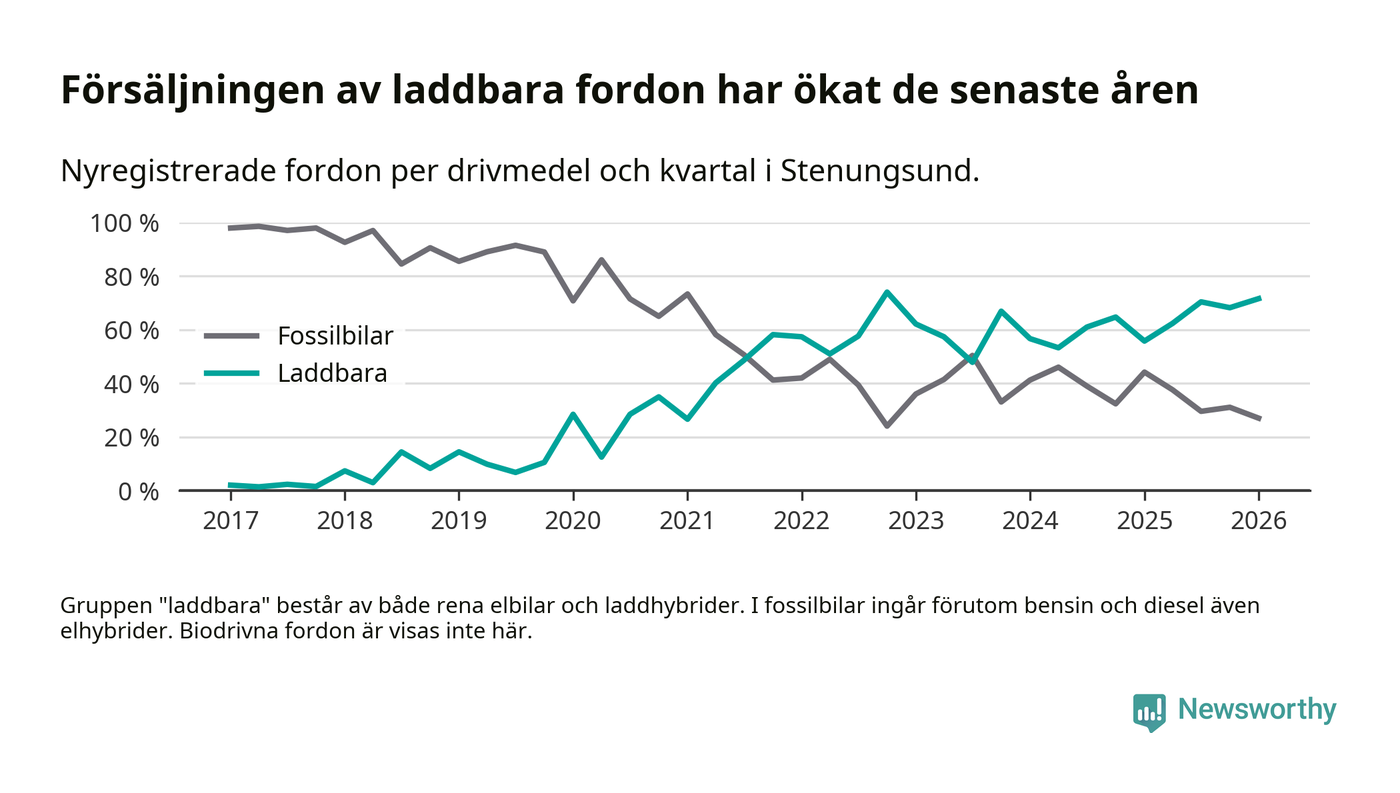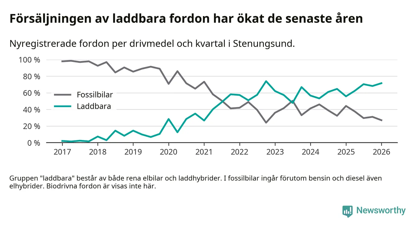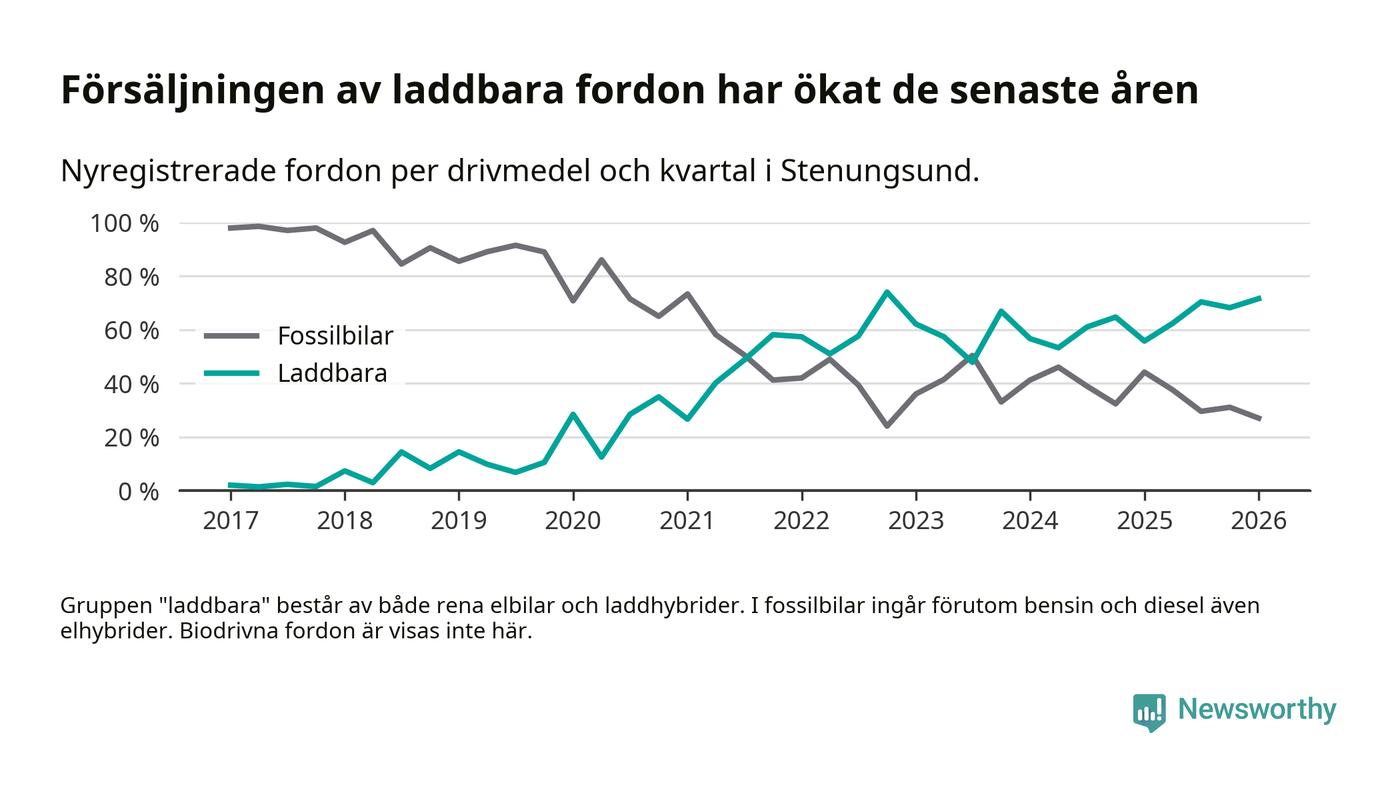 Under första kvartalet 2026 var 72 procent av alla nyregistrerade personbilar i Stenungsund laddbara (sammanlagt registrerades 148 nya bilar). Merparten av de laddbara bilarna var rena elbilar (53 procent av alla).