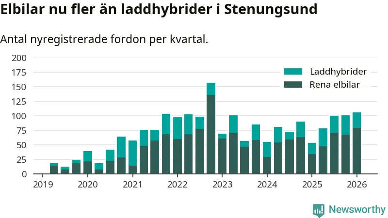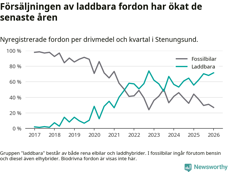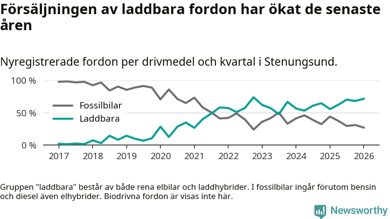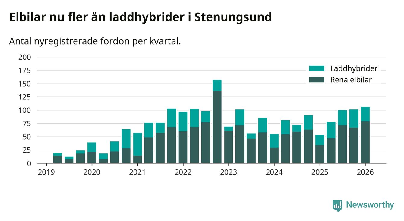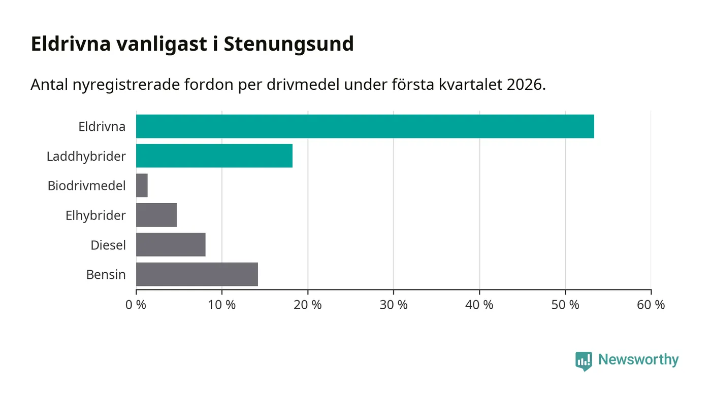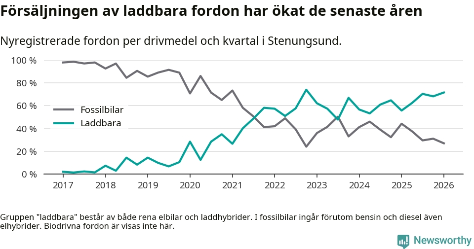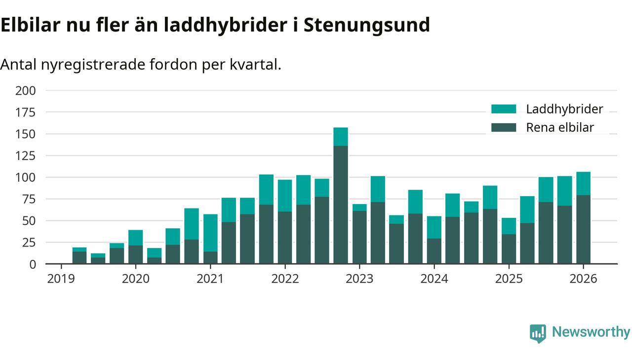 Under första kvartalet 2026 var 72 procent av alla nyregistrerade personbilar i Stenungsund laddbara (sammanlagt registrerades 148 nya bilar). Merparten av de laddbara bilarna var rena elbilar (53 procent av alla).