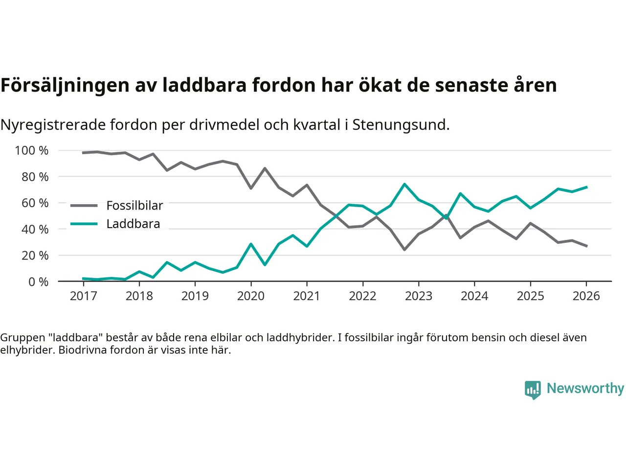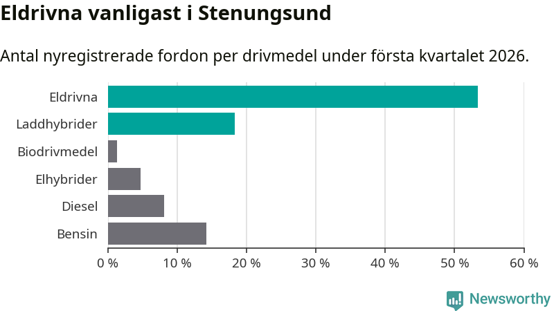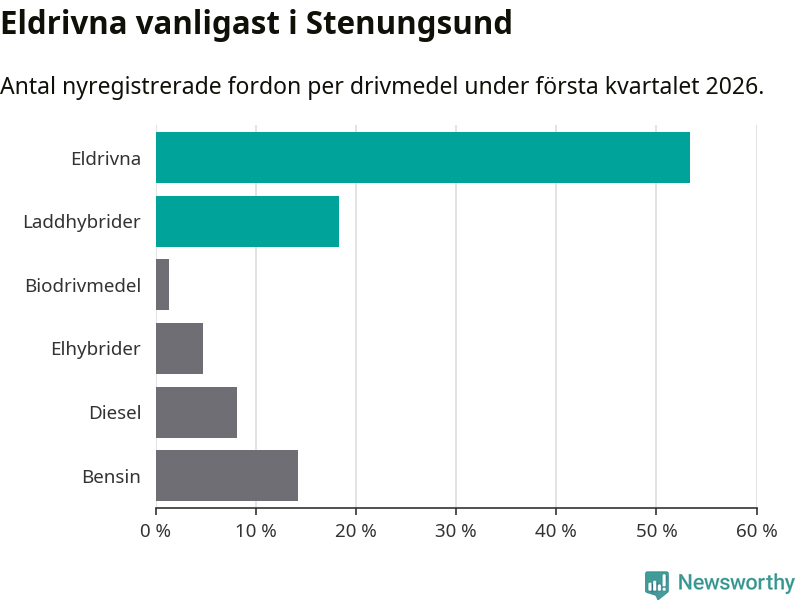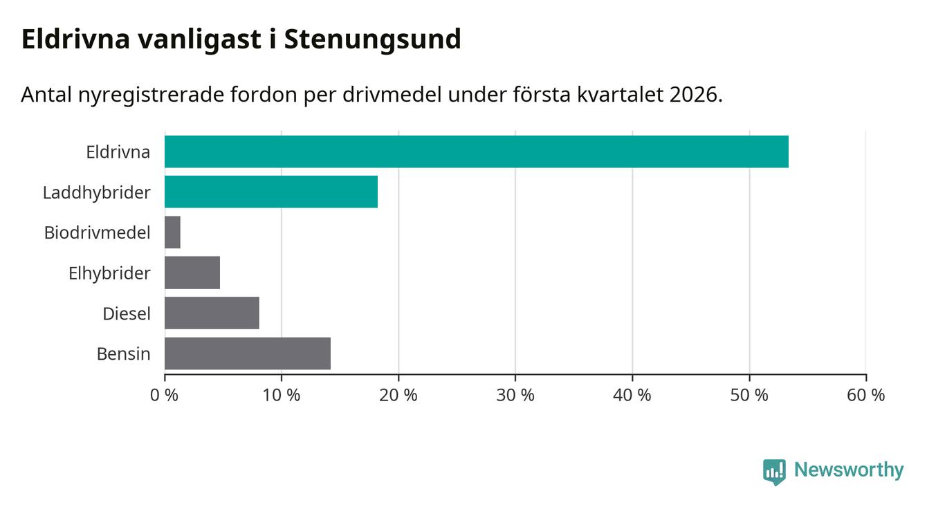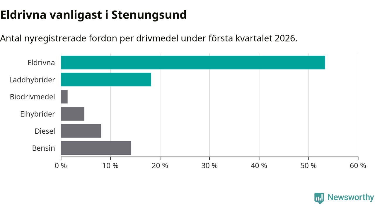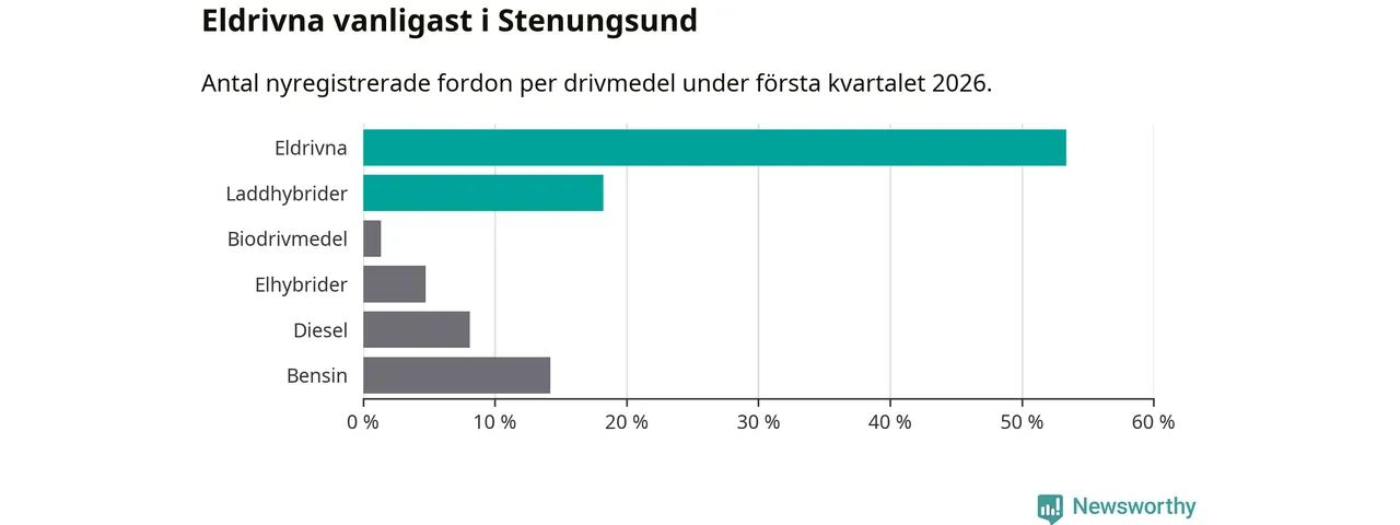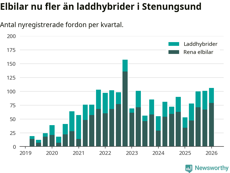 Under första kvartalet 2026 var 72 procent av alla nyregistrerade personbilar i Stenungsund laddbara (sammanlagt registrerades 148 nya bilar). Merparten av de laddbara bilarna var rena elbilar (53 procent av alla).
