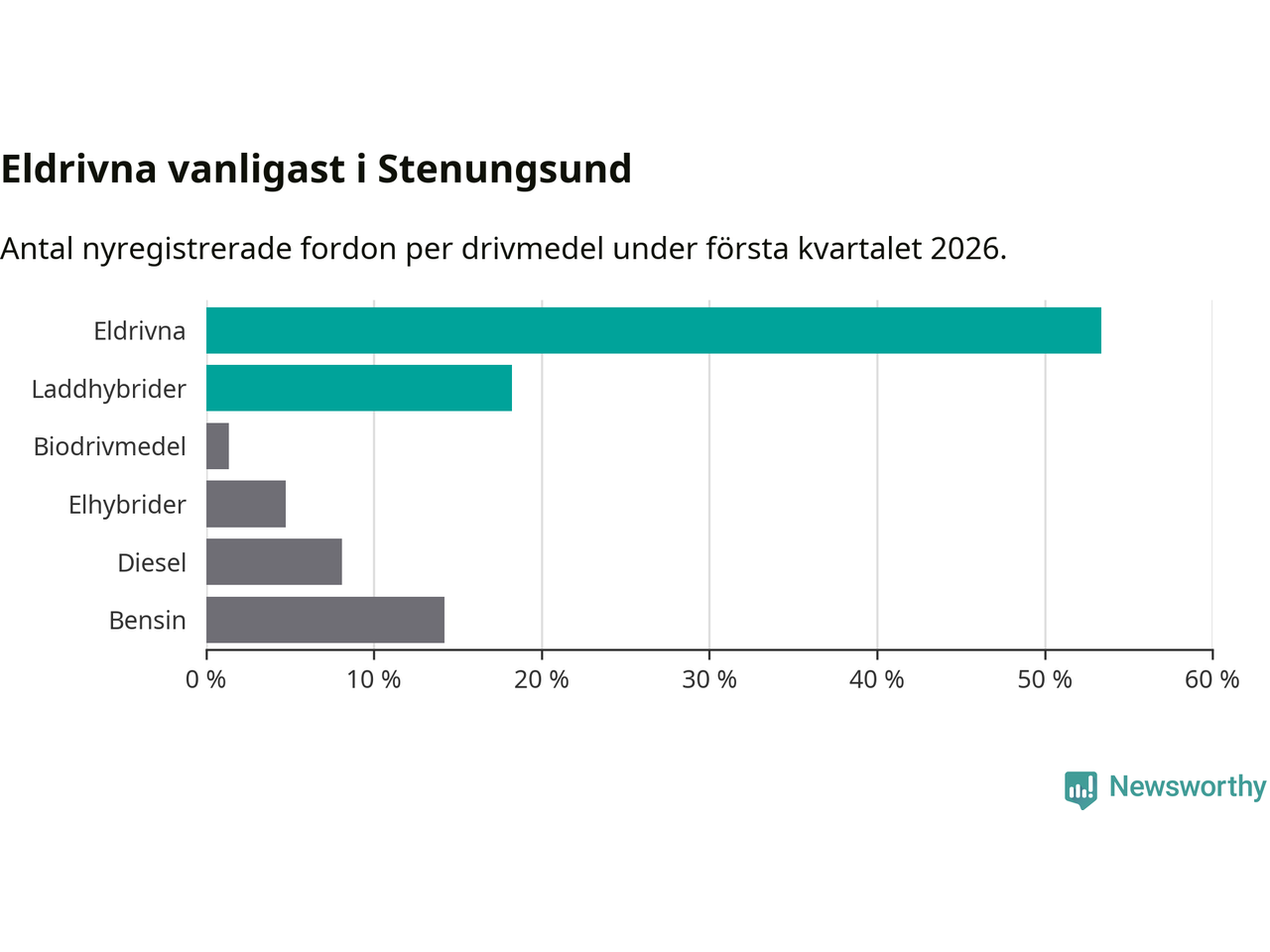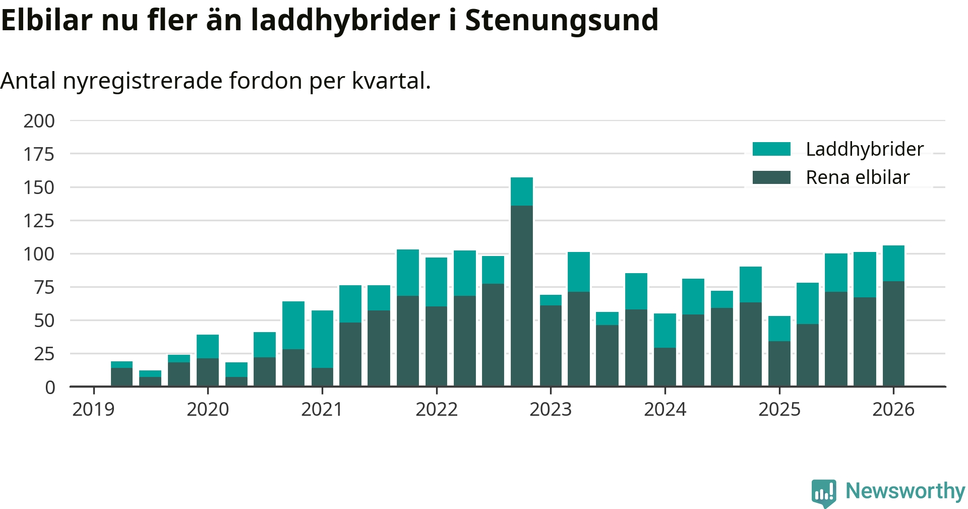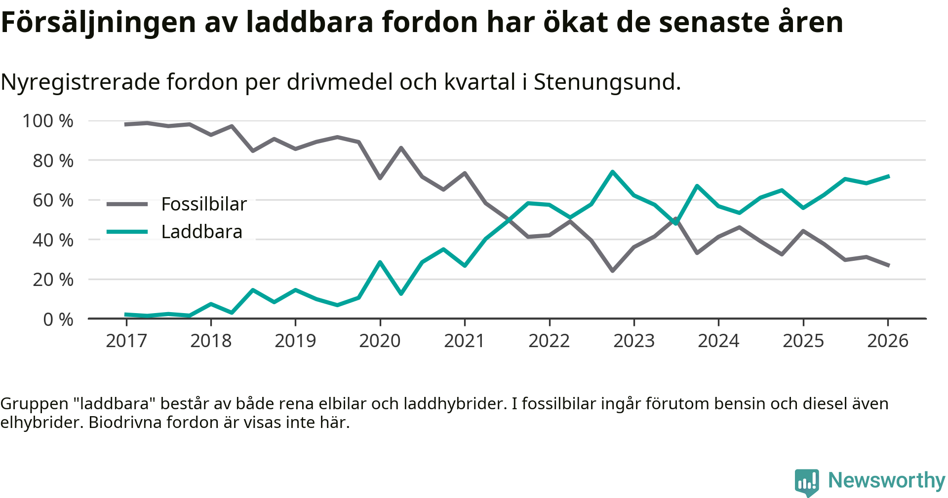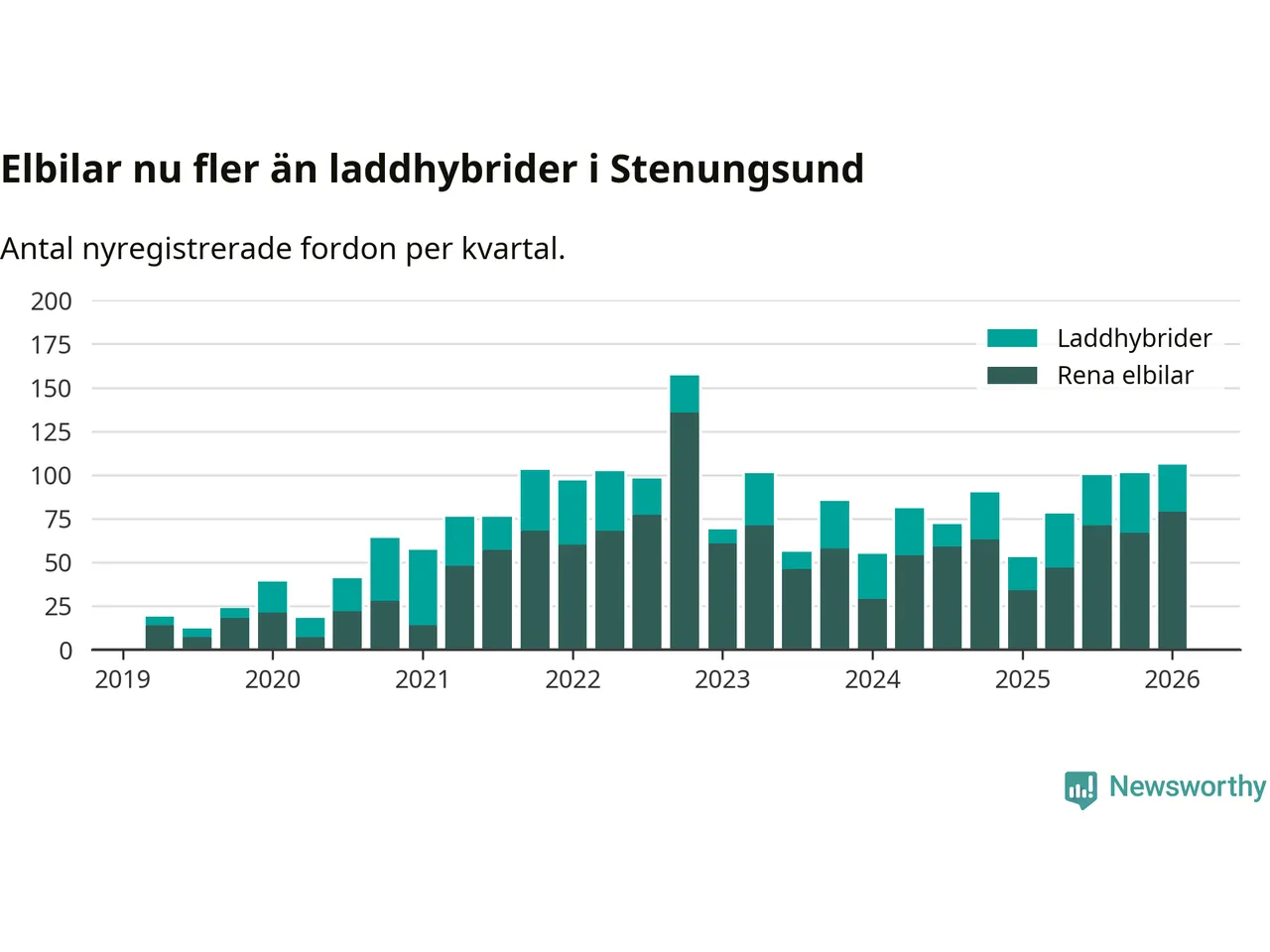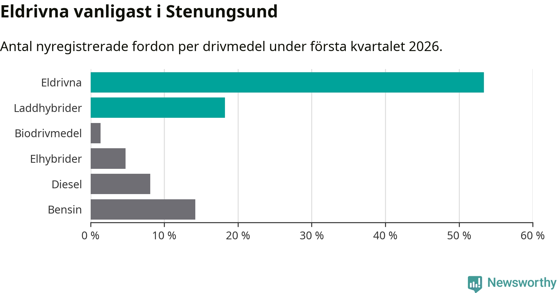 Under första kvartalet 2026 var 72 procent av alla nyregistrerade personbilar i Stenungsund laddbara (sammanlagt registrerades 148 nya bilar). Merparten av de laddbara bilarna var rena elbilar (53 procent av alla).