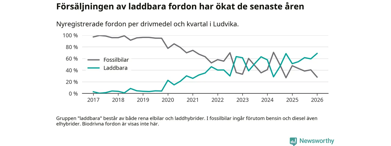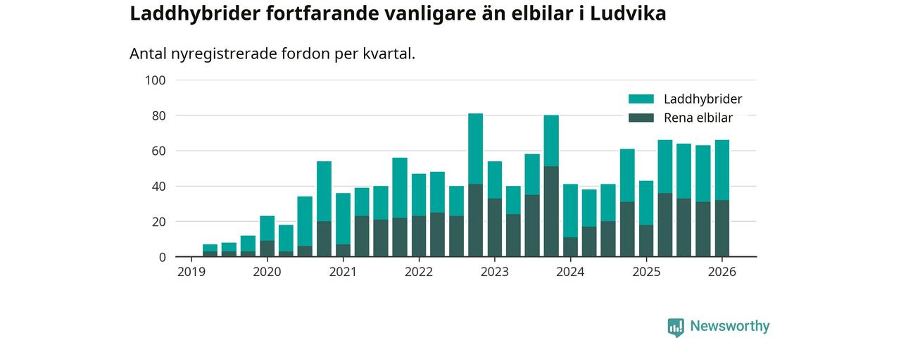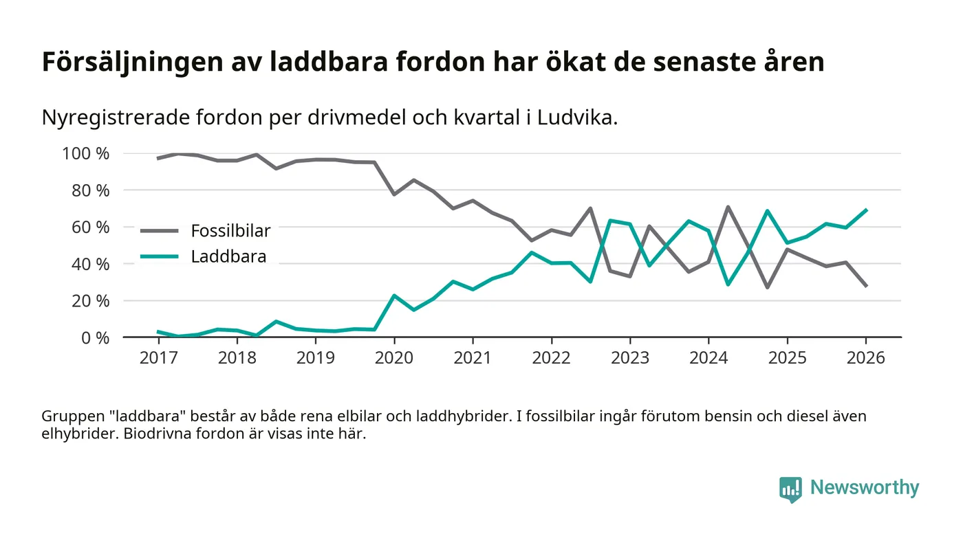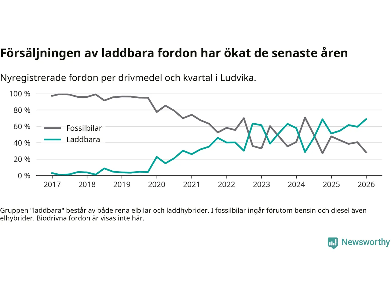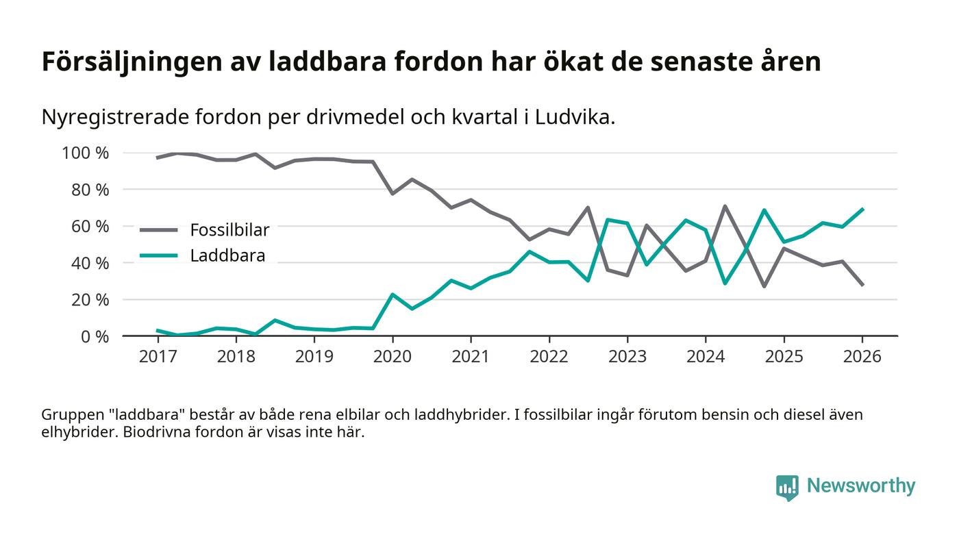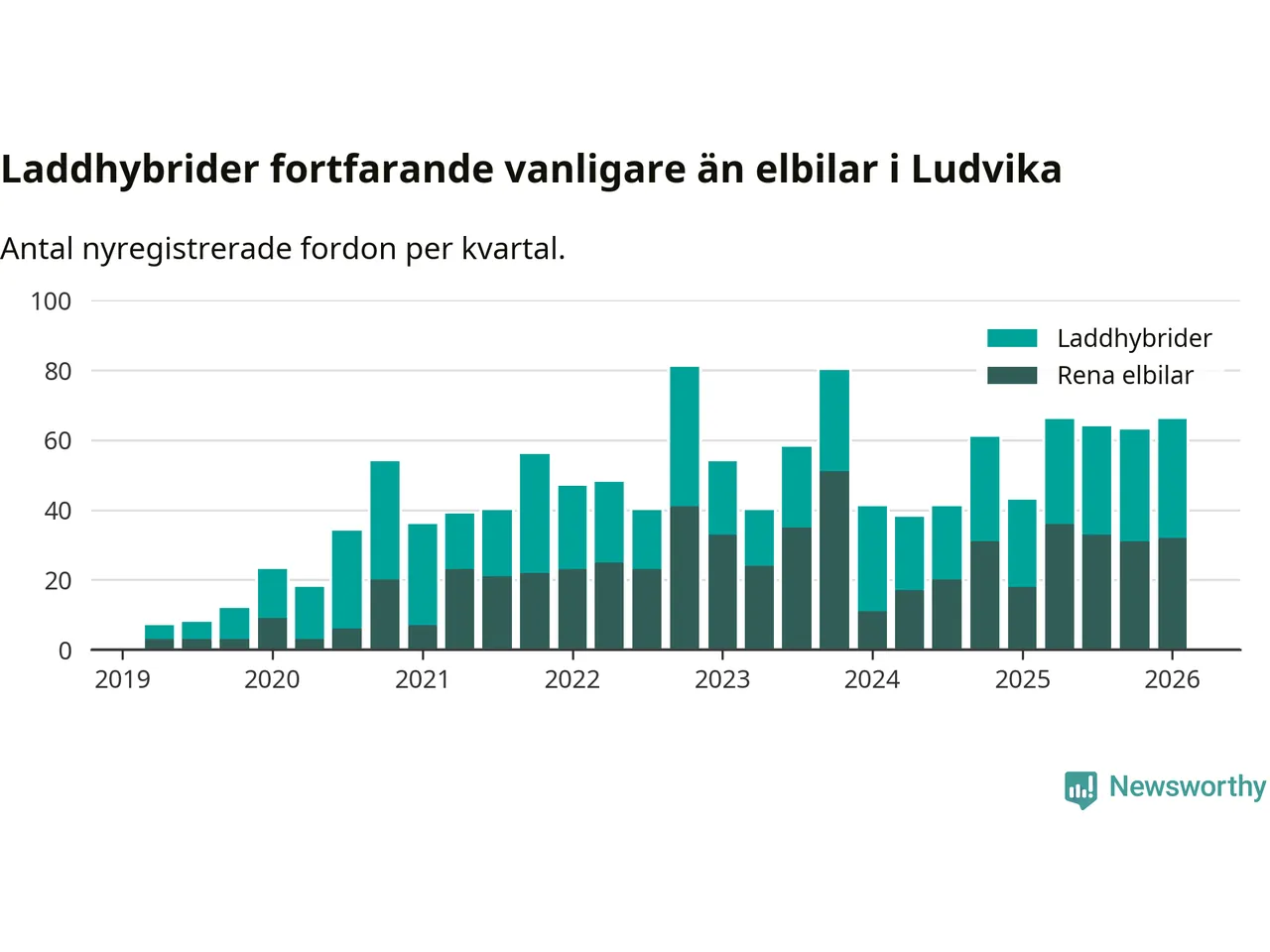 Under första kvartalet 2026 var 69 procent av alla nyregistrerade personbilar i Ludvika laddbara (sammanlagt registrerades 96 nya bilar). Merparten av de laddbara bilarna var så kallade laddhybrider, det vill säga fordon som går att ladda och köra på el, men som även har en förbränningsmotor. 33 procent av alla nya bilar var rena elbilar.