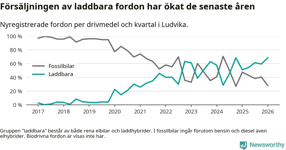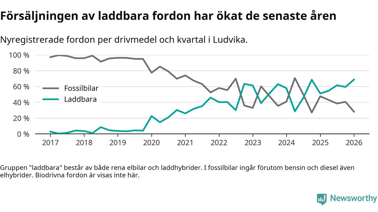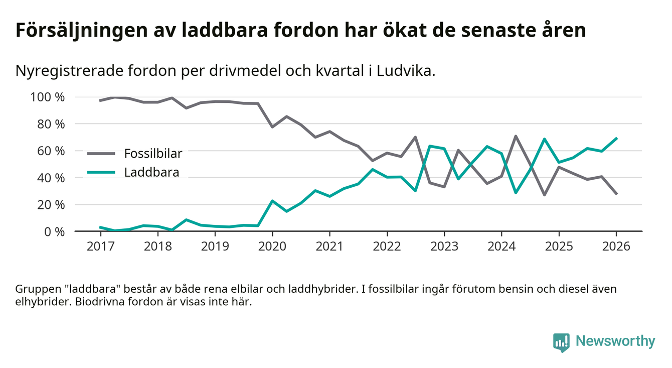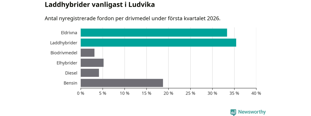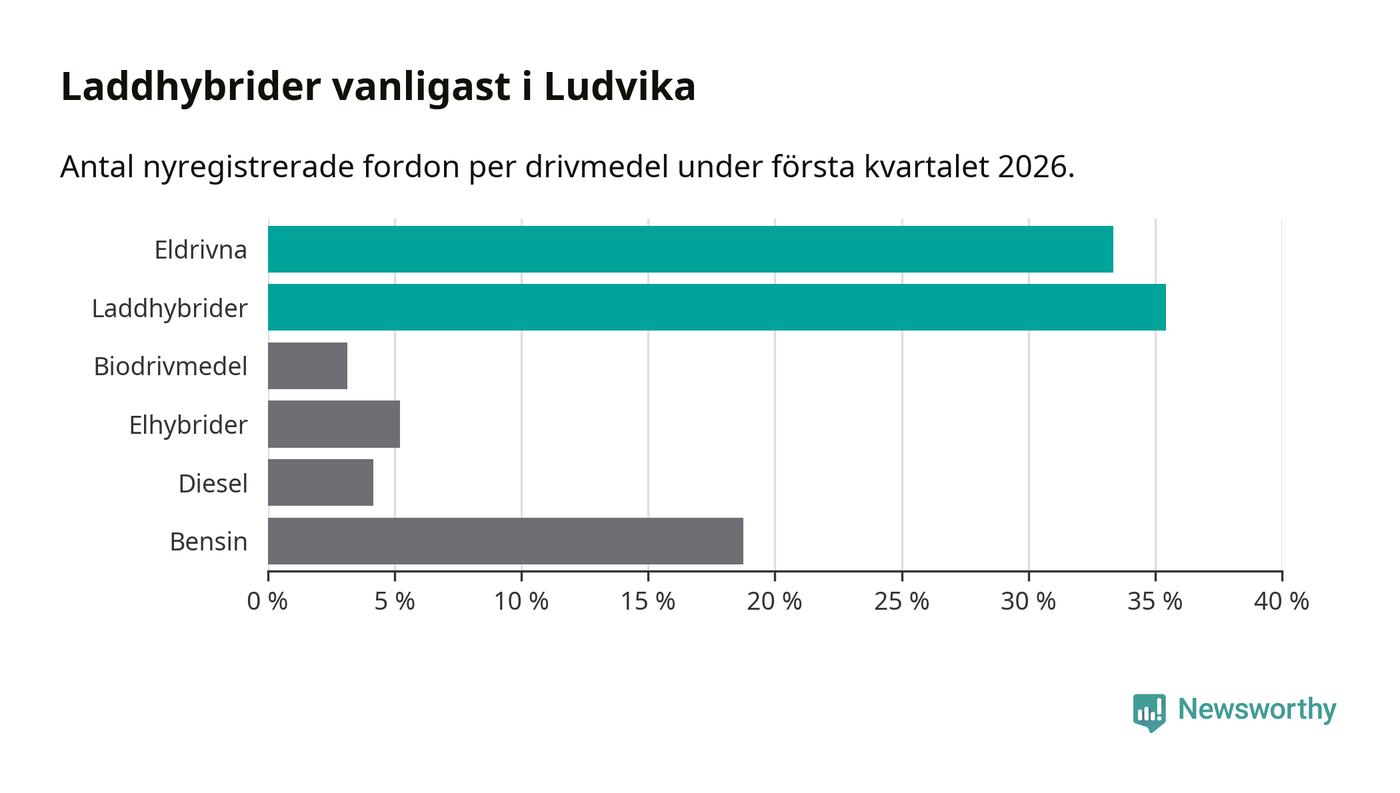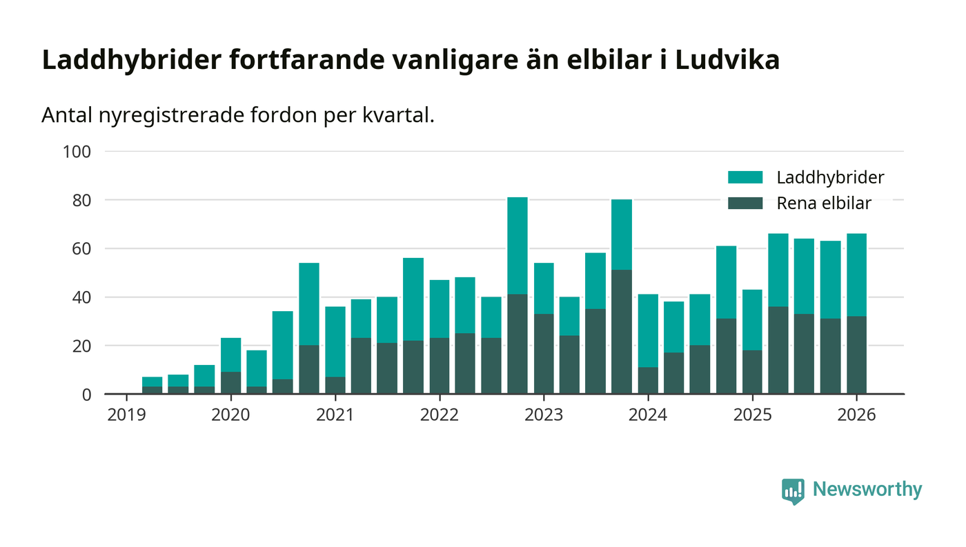 Under första kvartalet 2026 var 69 procent av alla nyregistrerade personbilar i Ludvika laddbara (sammanlagt registrerades 96 nya bilar). Merparten av de laddbara bilarna var så kallade laddhybrider, det vill säga fordon som går att ladda och köra på el, men som även har en förbränningsmotor. 33 procent av alla nya bilar var rena elbilar.
