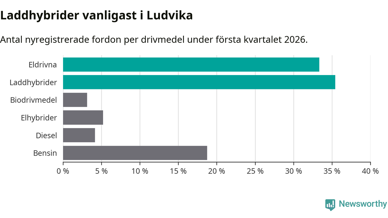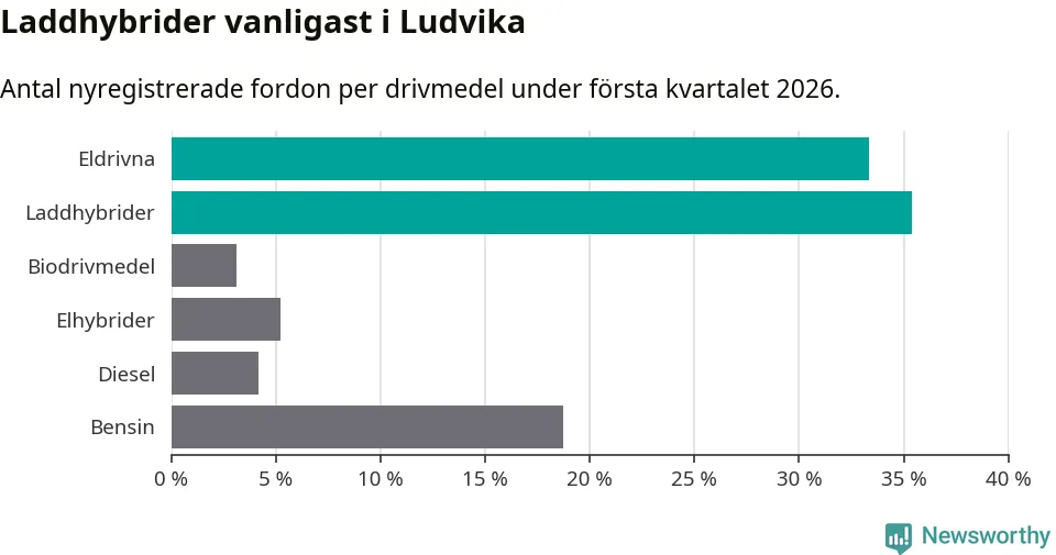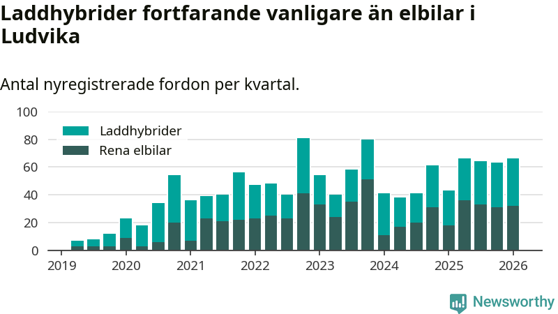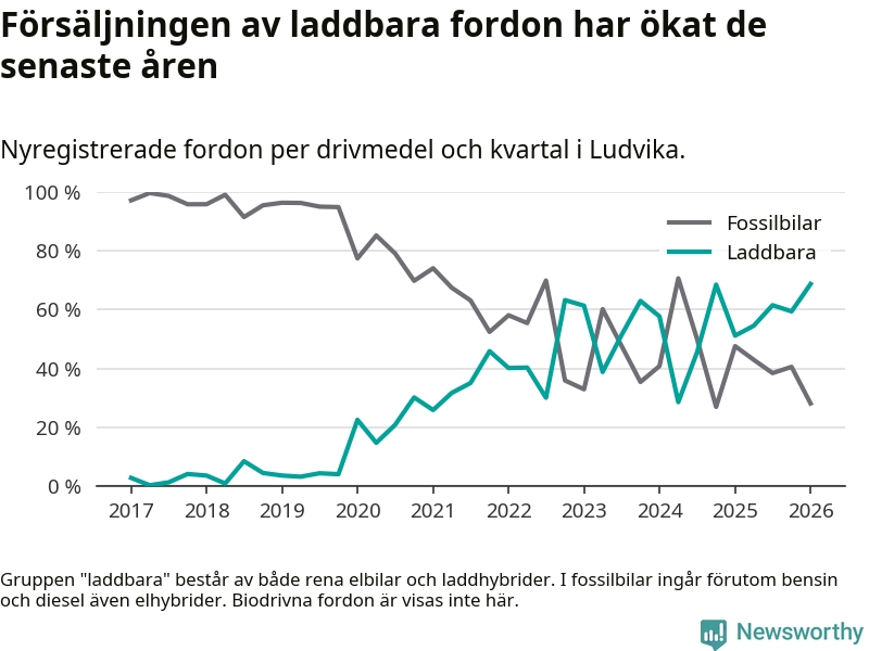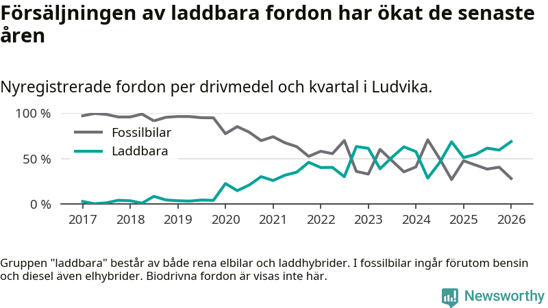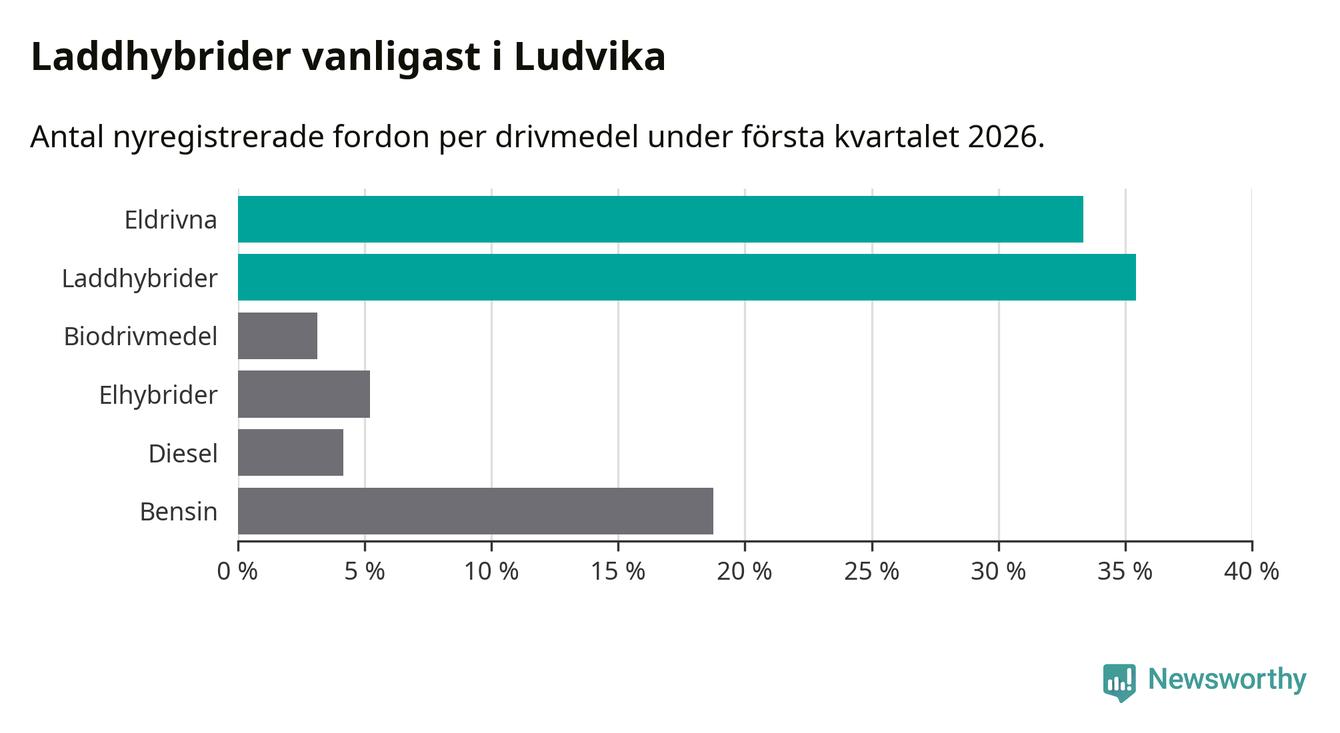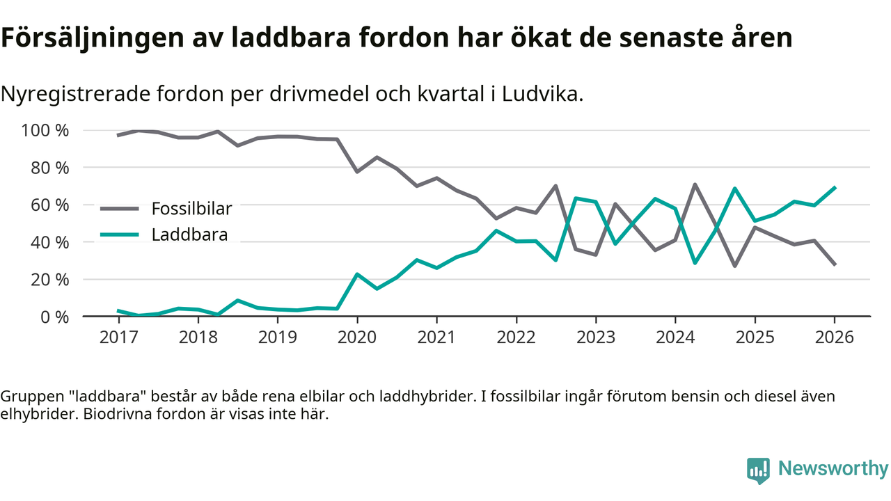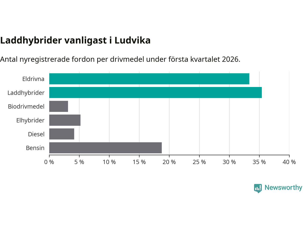 Under första kvartalet 2026 var 69 procent av alla nyregistrerade personbilar i Ludvika laddbara (sammanlagt registrerades 96 nya bilar). Merparten av de laddbara bilarna var så kallade laddhybrider, det vill säga fordon som går att ladda och köra på el, men som även har en förbränningsmotor. 33 procent av alla nya bilar var rena elbilar.