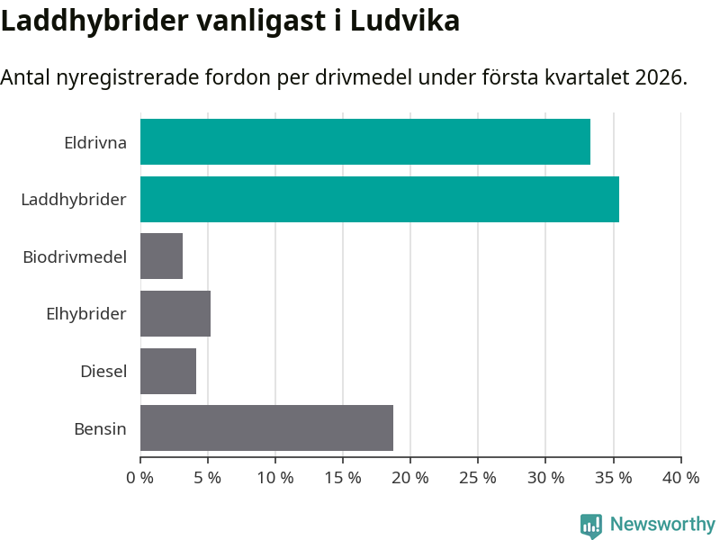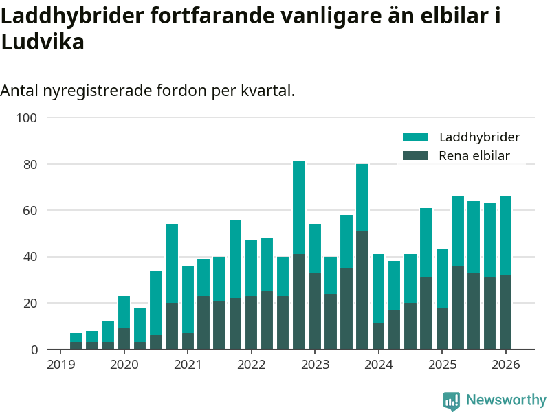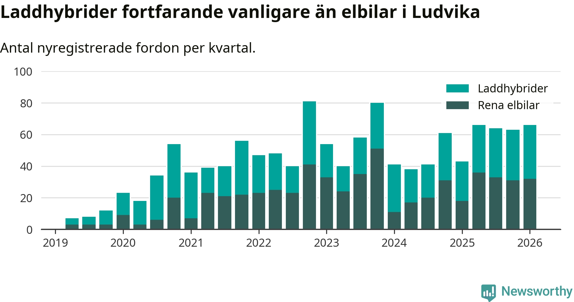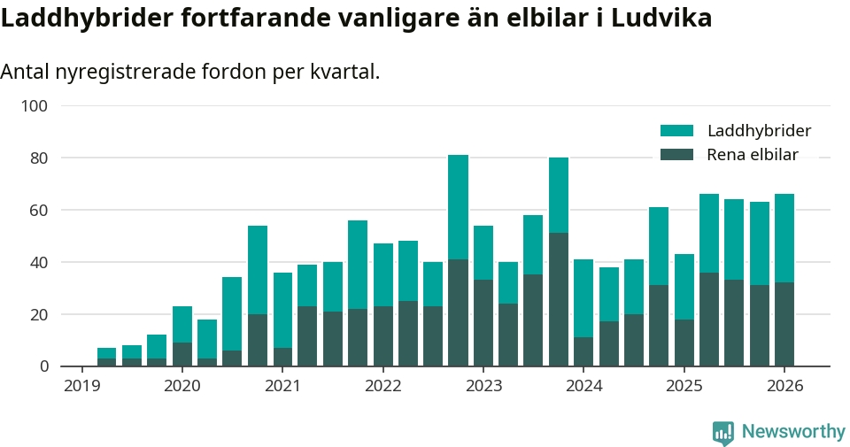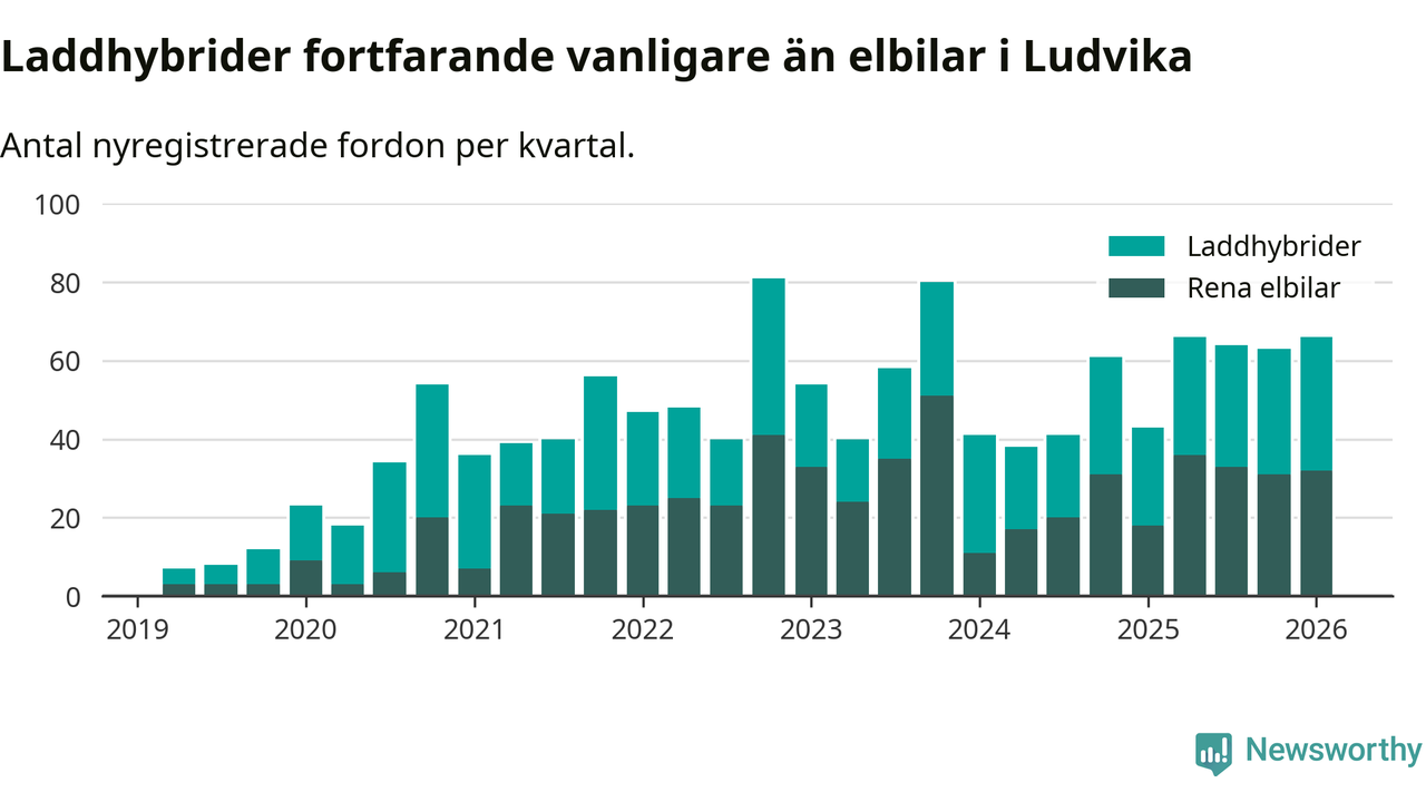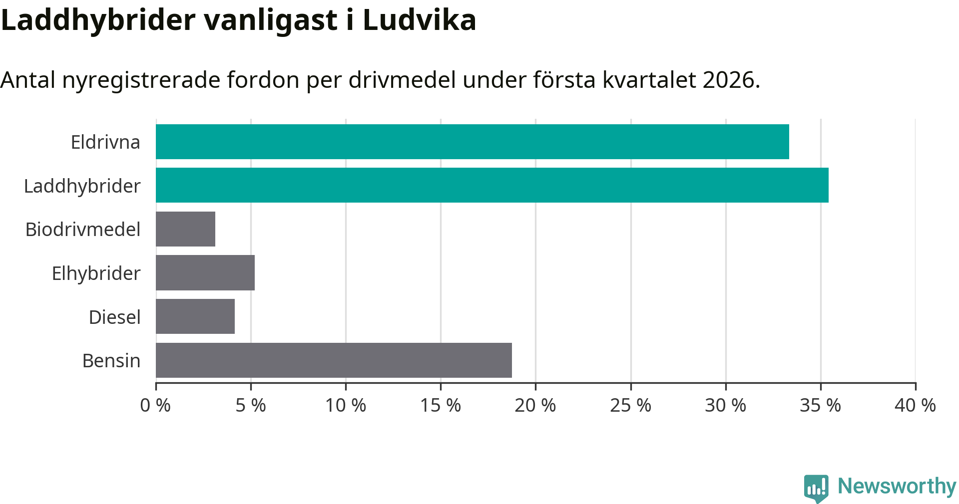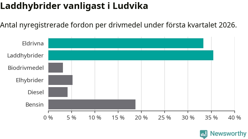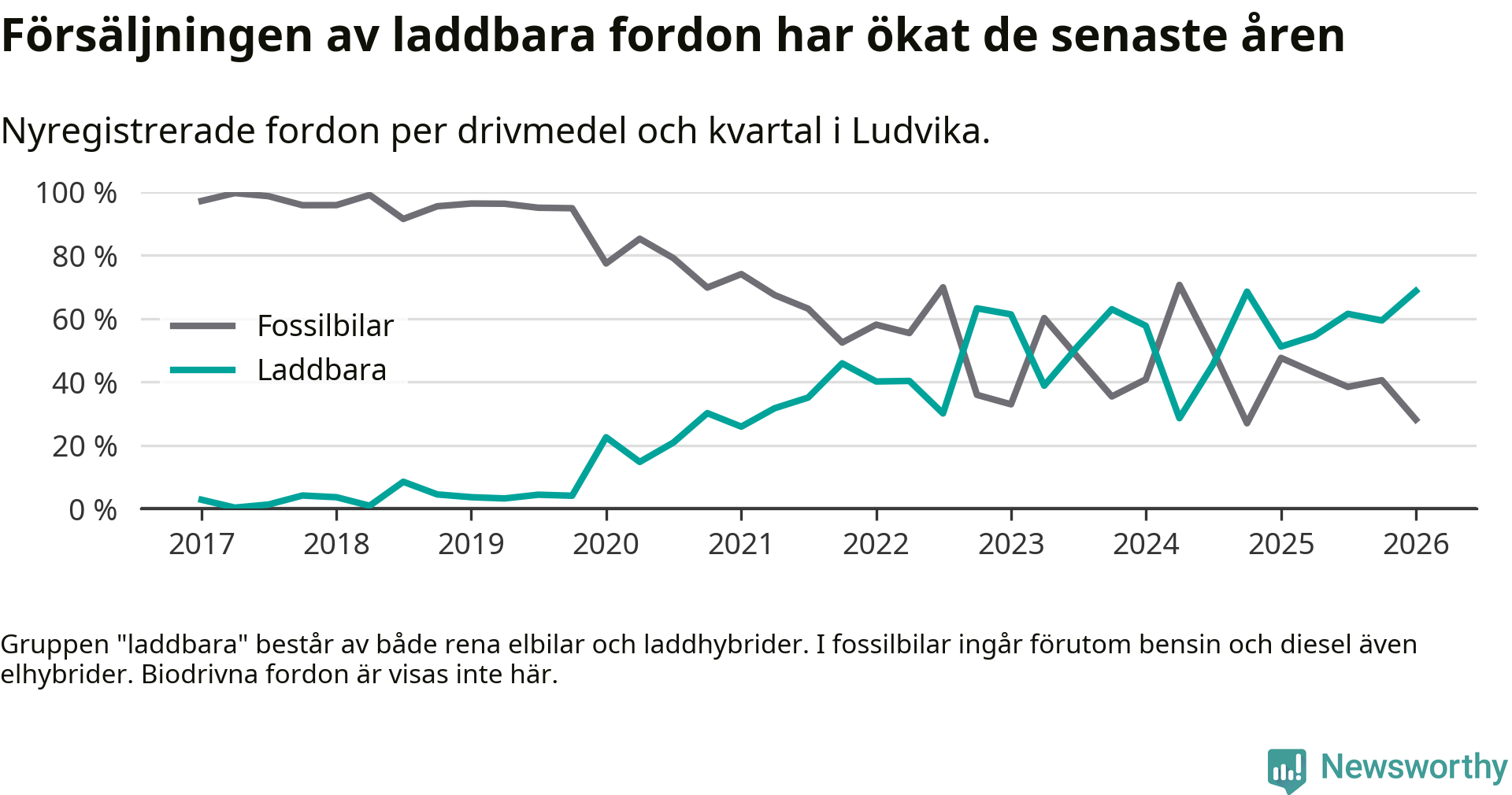 Under första kvartalet 2026 var 69 procent av alla nyregistrerade personbilar i Ludvika laddbara (sammanlagt registrerades 96 nya bilar). Merparten av de laddbara bilarna var så kallade laddhybrider, det vill säga fordon som går att ladda och köra på el, men som även har en förbränningsmotor. 33 procent av alla nya bilar var rena elbilar.