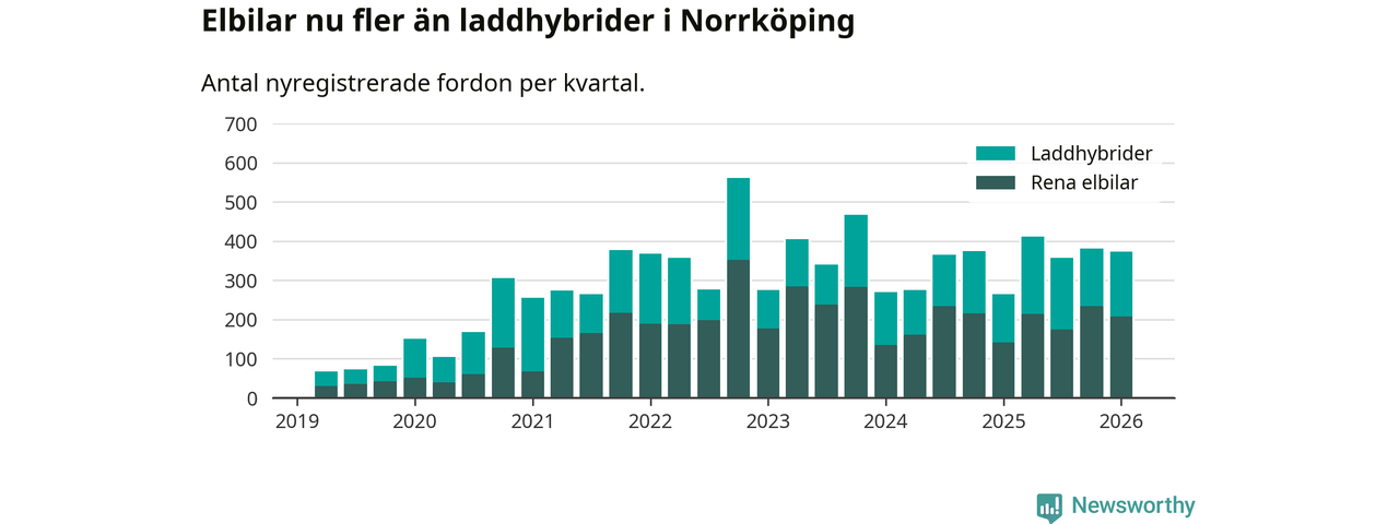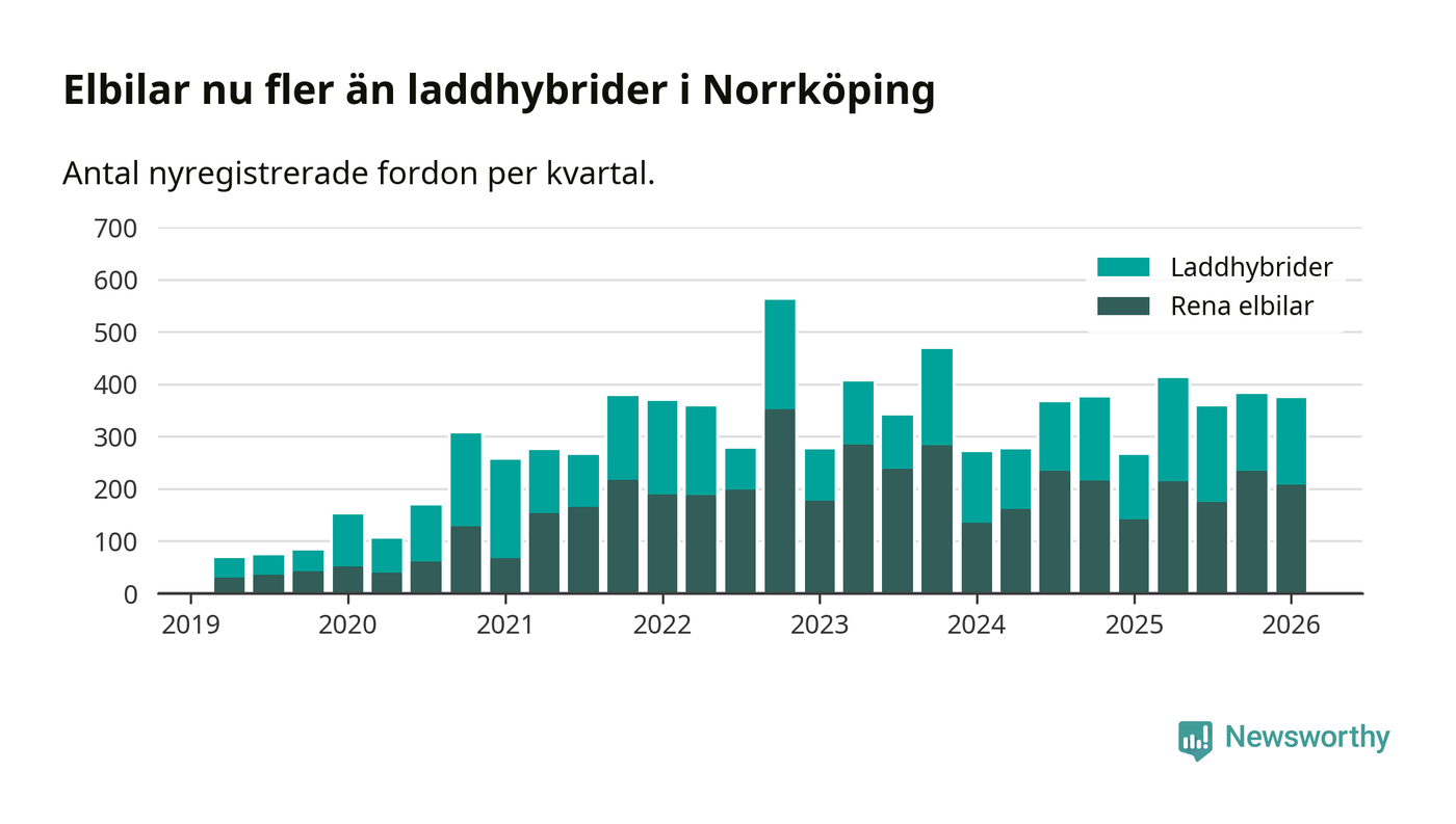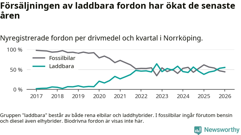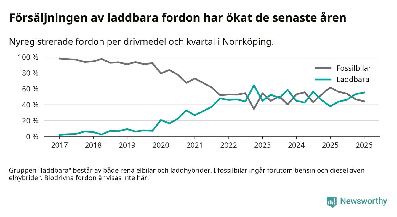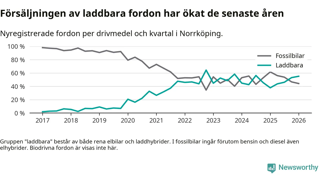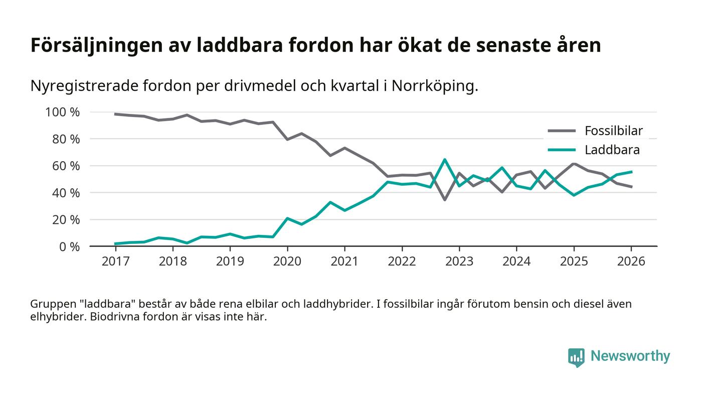 Under första kvartalet 2026 var 55 procent av alla nyregistrerade personbilar i Norrköping laddbara (sammanlagt registrerades 678 nya bilar). Merparten av de laddbara bilarna var rena elbilar (31 procent av alla).