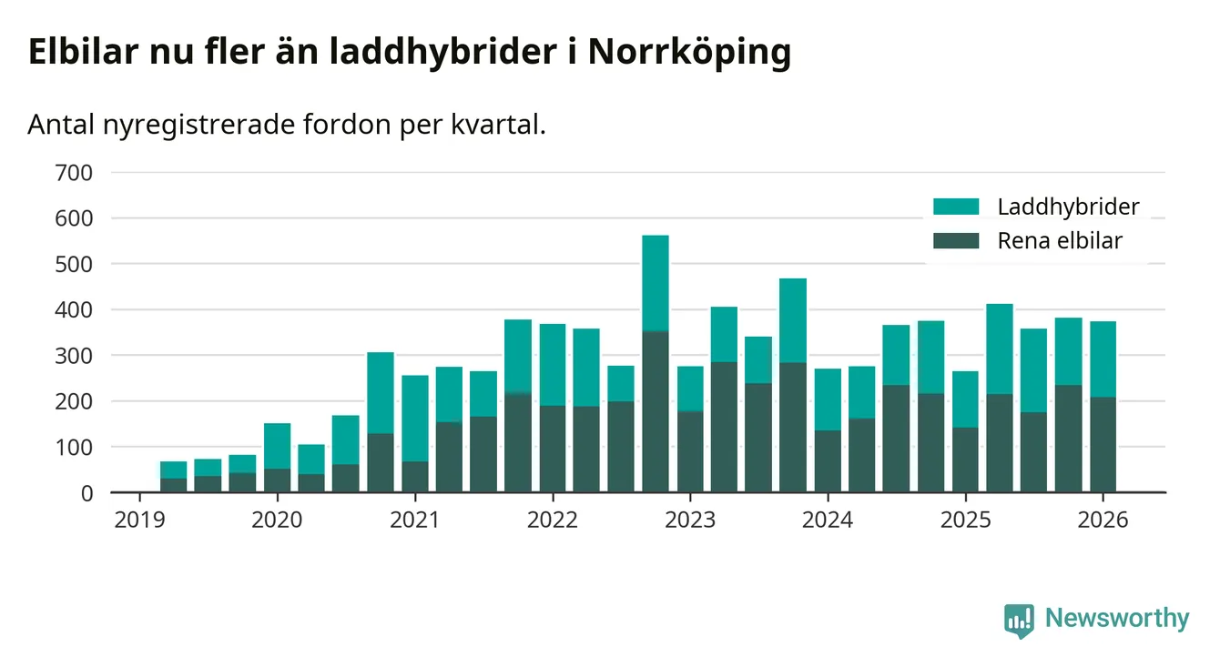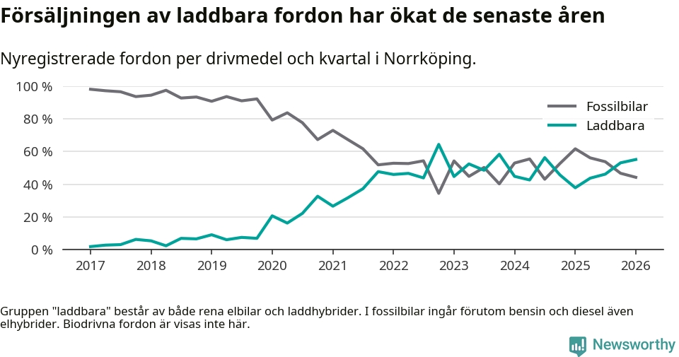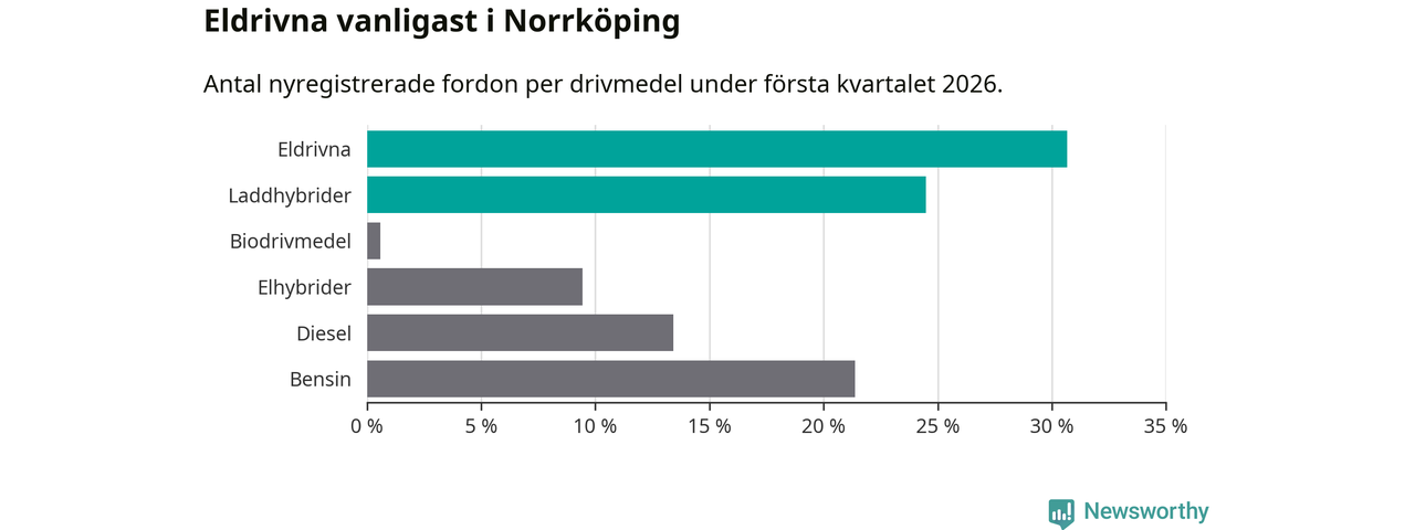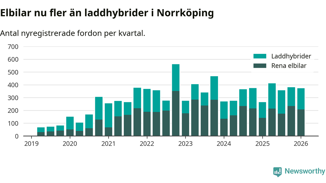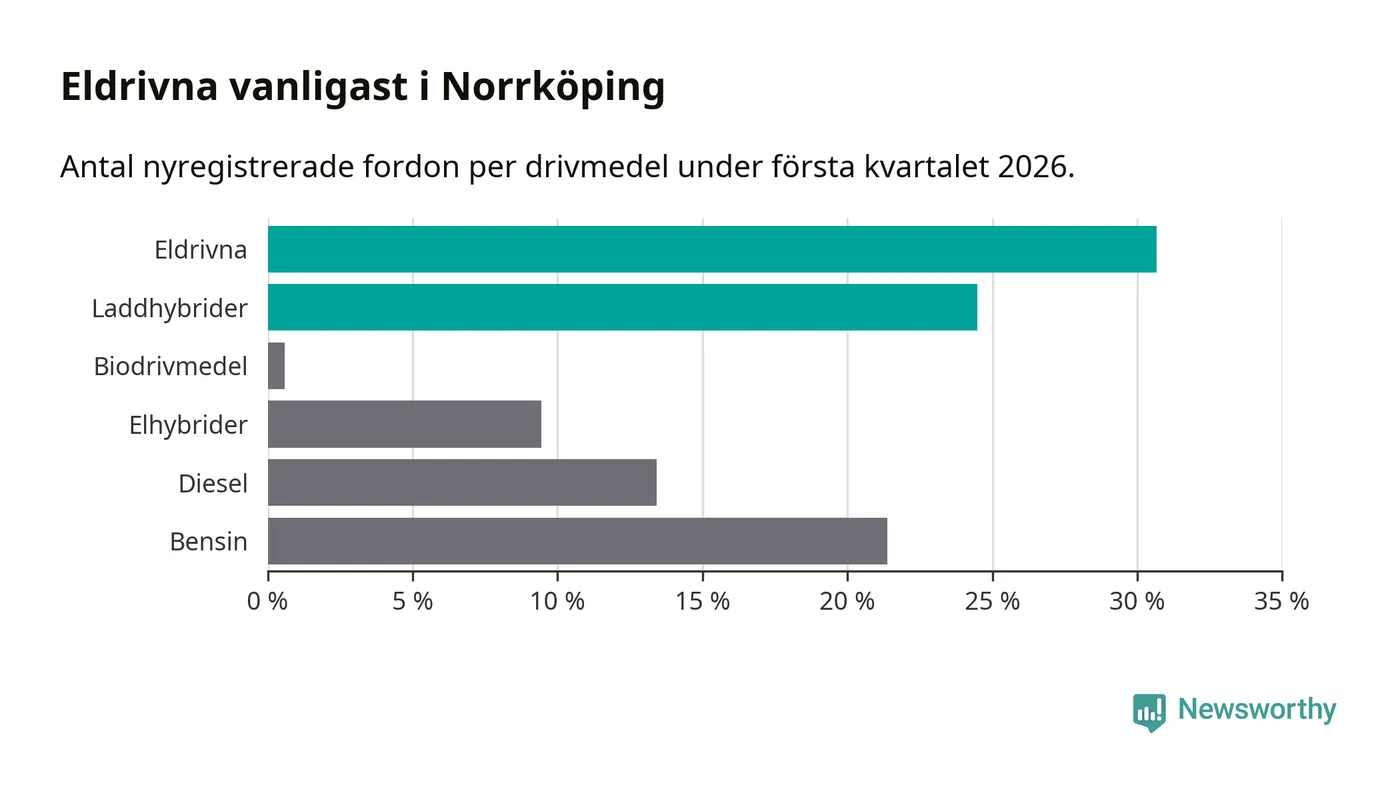 Under första kvartalet 2026 var 55 procent av alla nyregistrerade personbilar i Norrköping laddbara (sammanlagt registrerades 678 nya bilar). Merparten av de laddbara bilarna var rena elbilar (31 procent av alla).