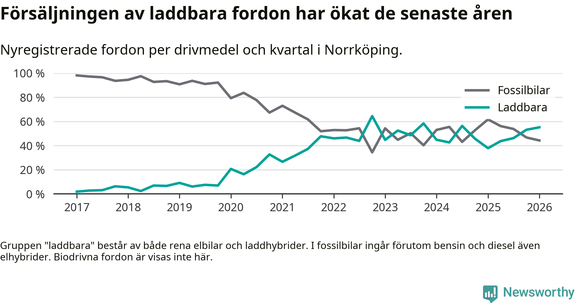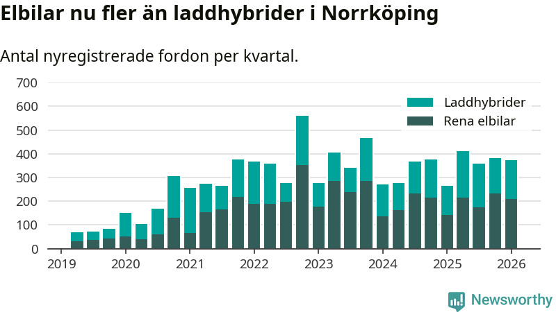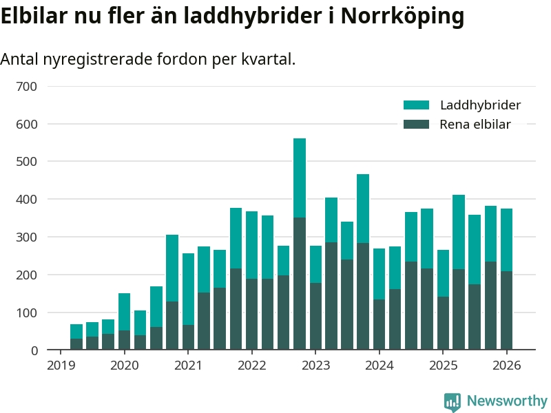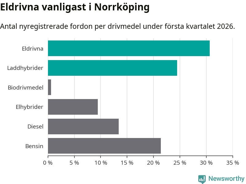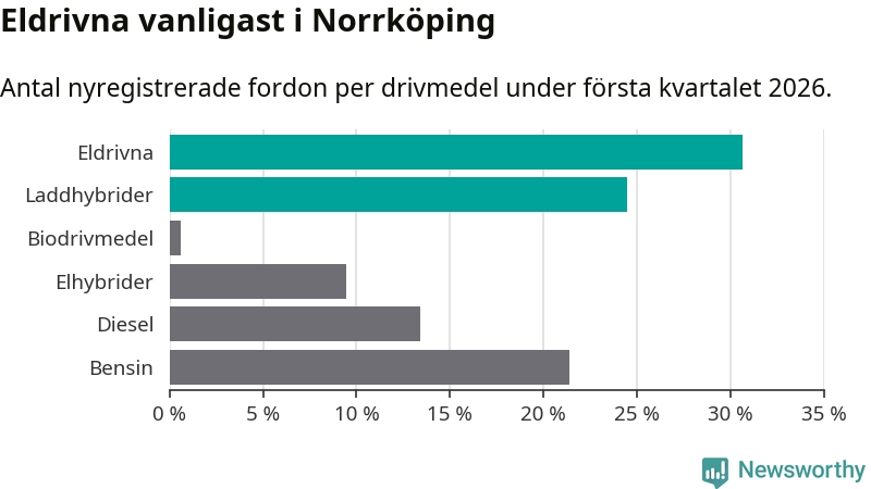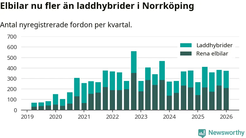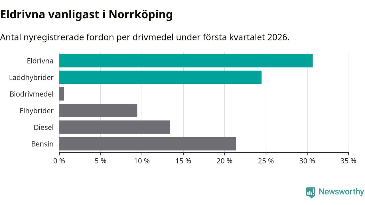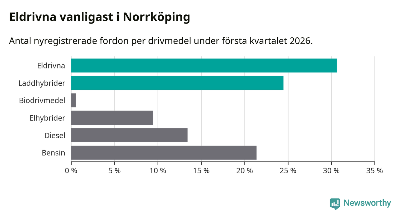 Under första kvartalet 2026 var 55 procent av alla nyregistrerade personbilar i Norrköping laddbara (sammanlagt registrerades 678 nya bilar). Merparten av de laddbara bilarna var rena elbilar (31 procent av alla).