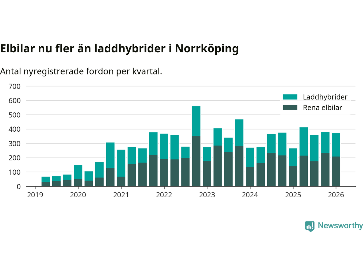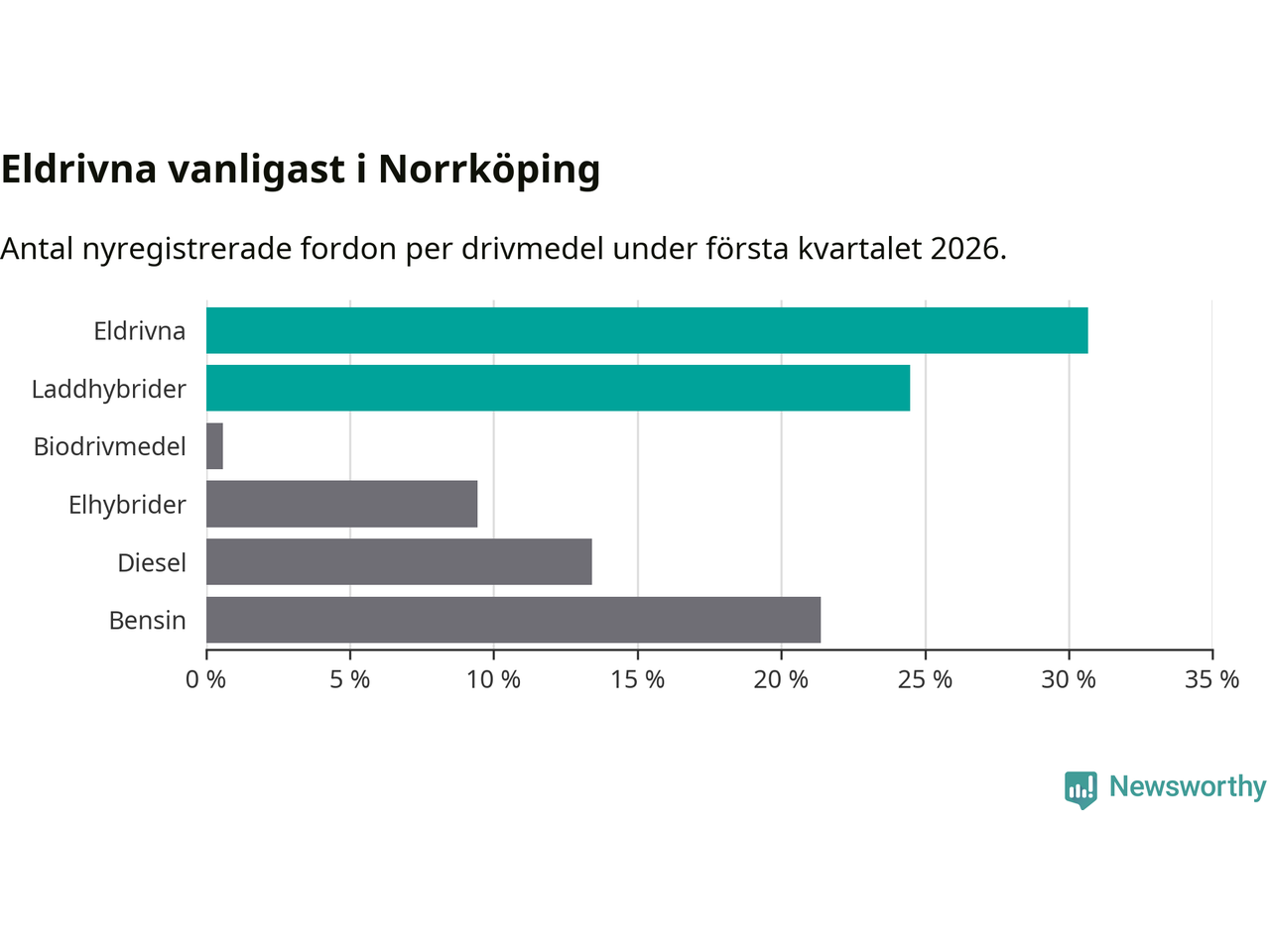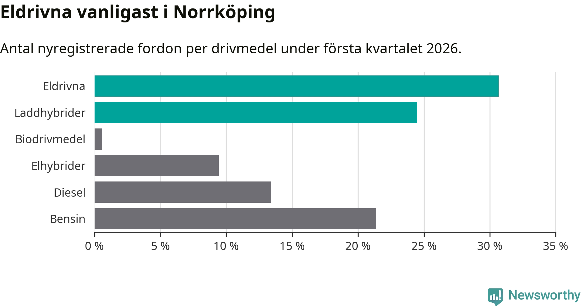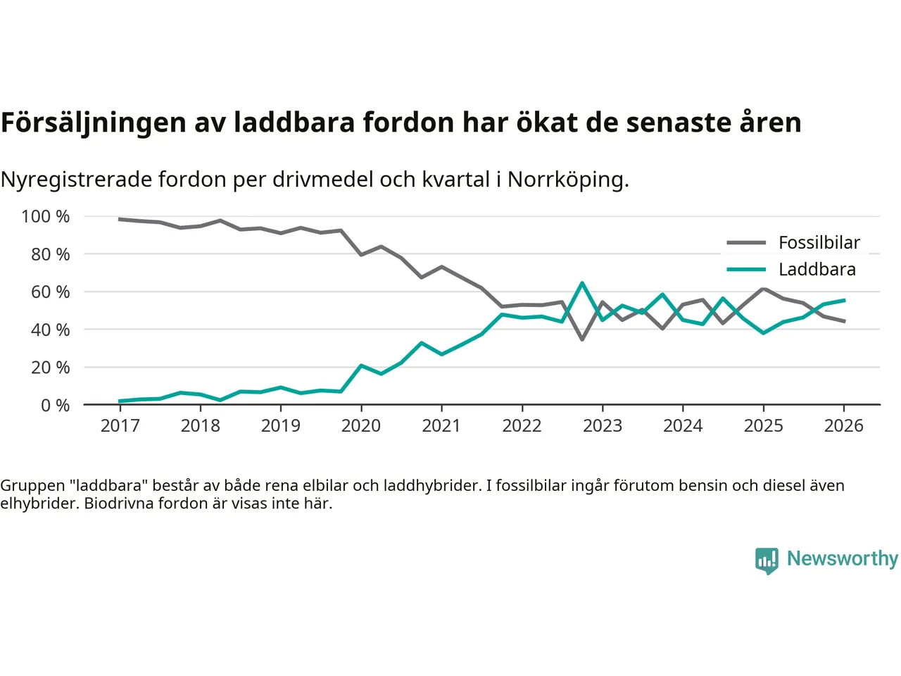 Under första kvartalet 2026 var 55 procent av alla nyregistrerade personbilar i Norrköping laddbara (sammanlagt registrerades 678 nya bilar). Merparten av de laddbara bilarna var rena elbilar (31 procent av alla).