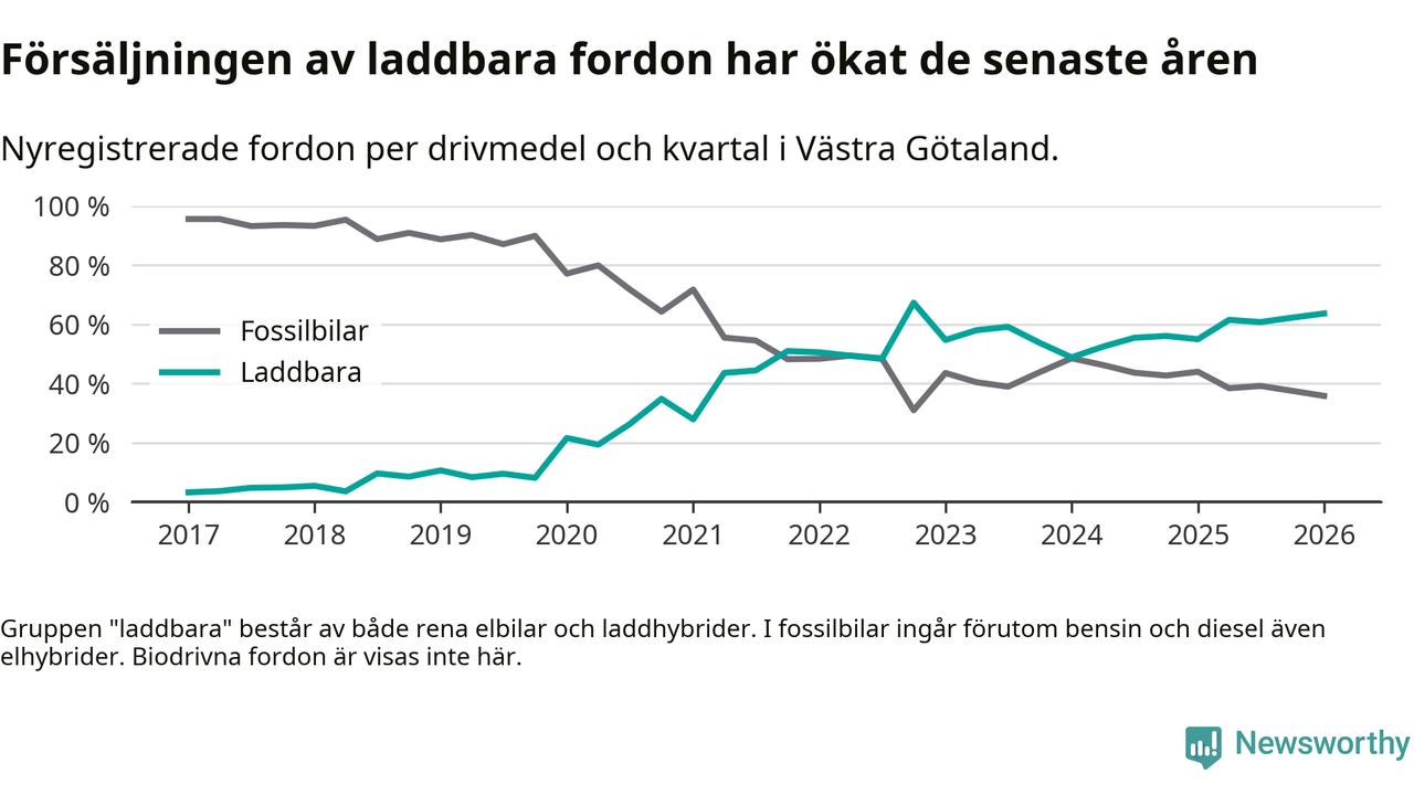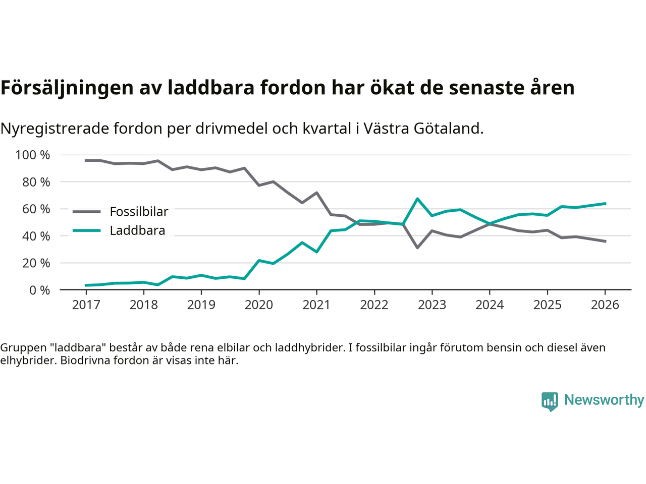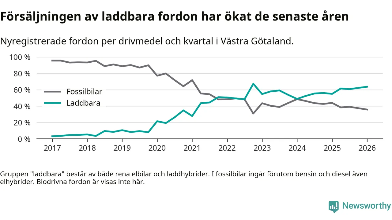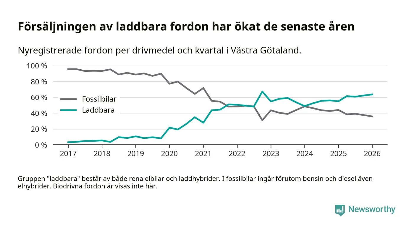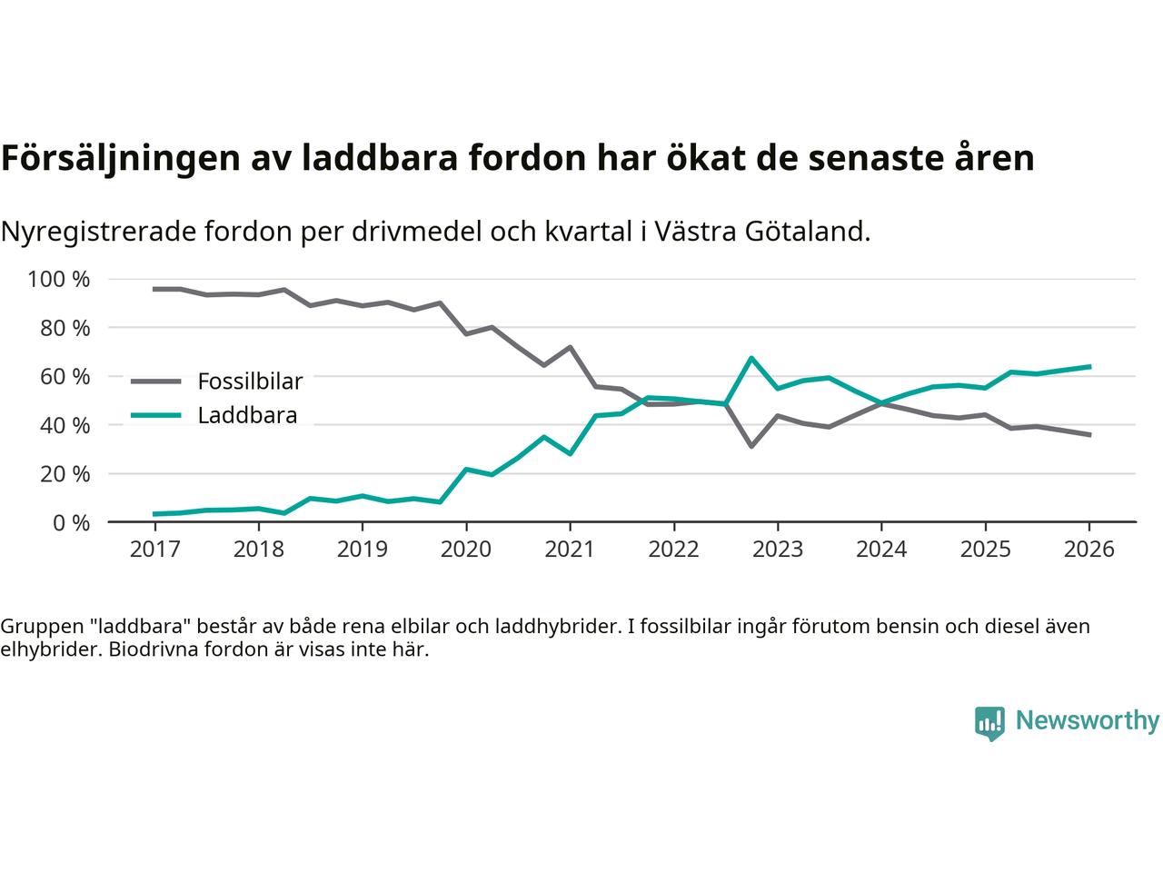 Under första kvartalet 2026 var 64 procent av alla nyregistrerade personbilar i Västra Götaland laddbara (sammanlagt registrerades 10 105 nya bilar). Merparten av de laddbara bilarna var rena elbilar (42 procent av alla).