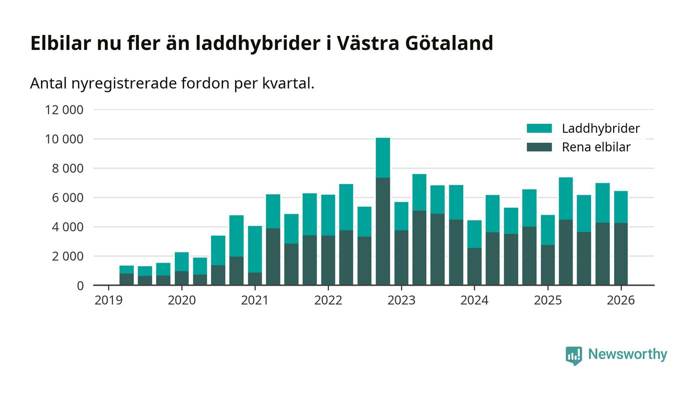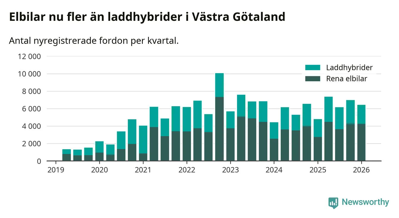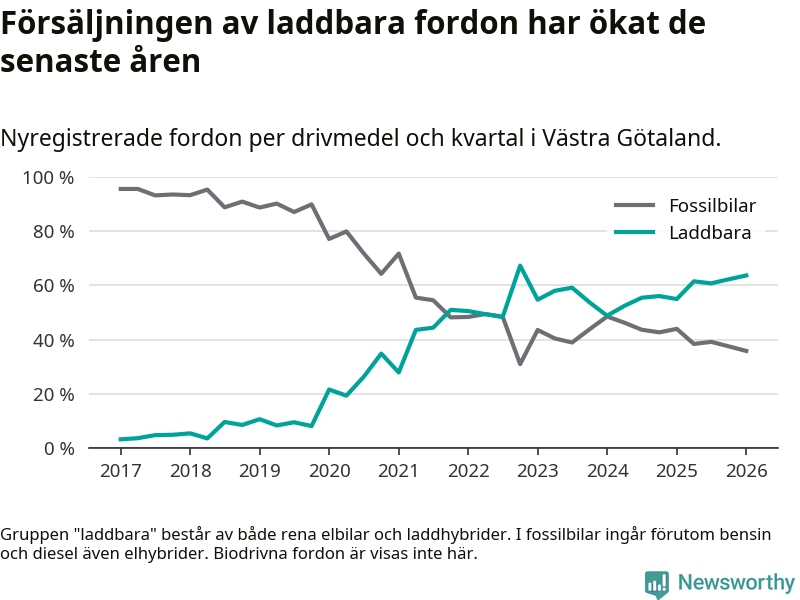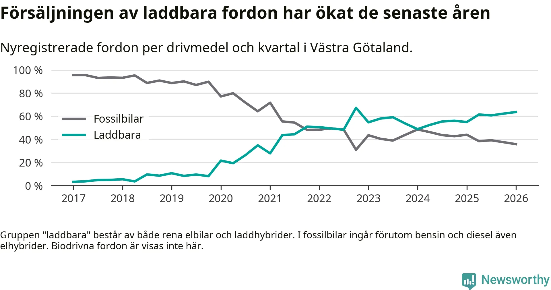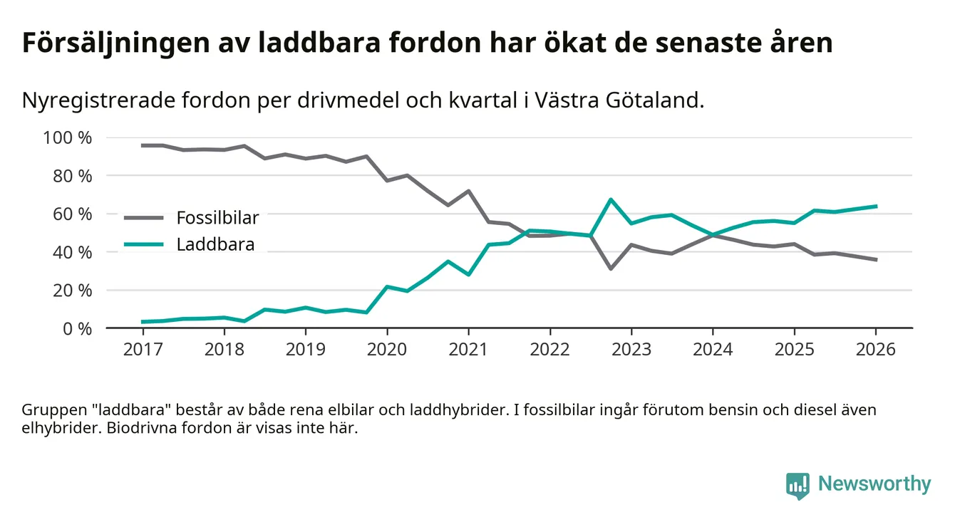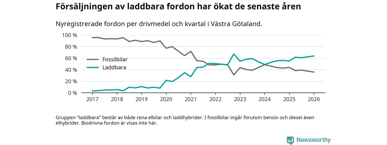 Under första kvartalet 2026 var 64 procent av alla nyregistrerade personbilar i Västra Götaland laddbara (sammanlagt registrerades 10 105 nya bilar). Merparten av de laddbara bilarna var rena elbilar (42 procent av alla).