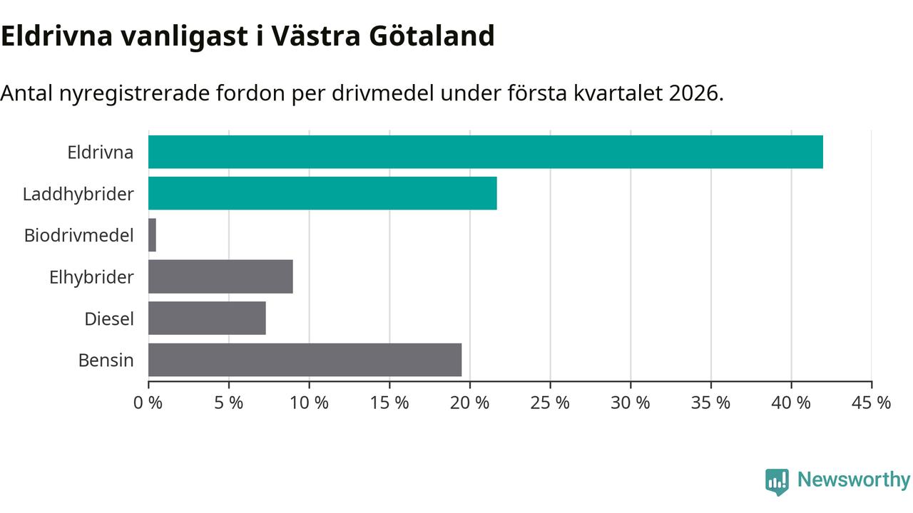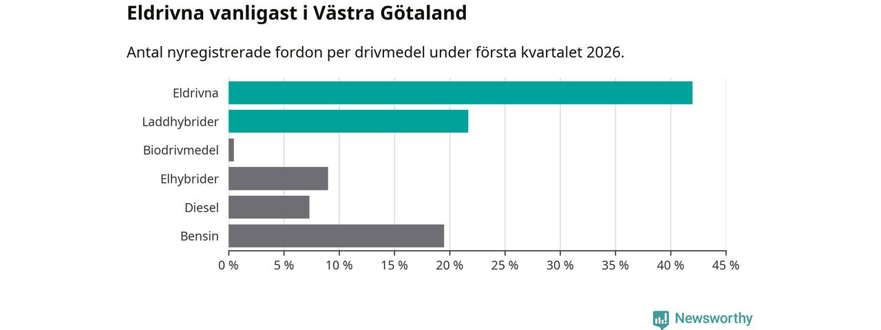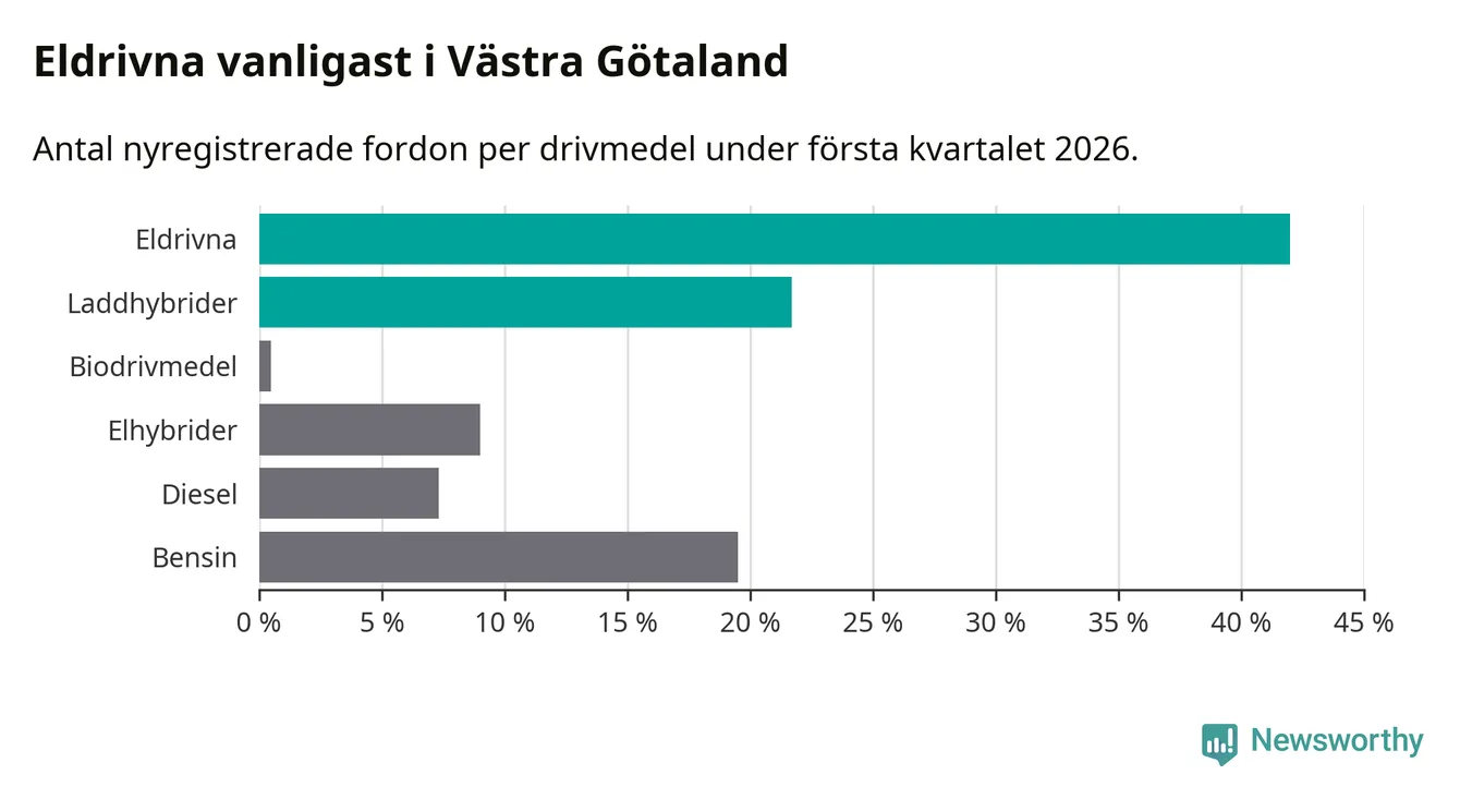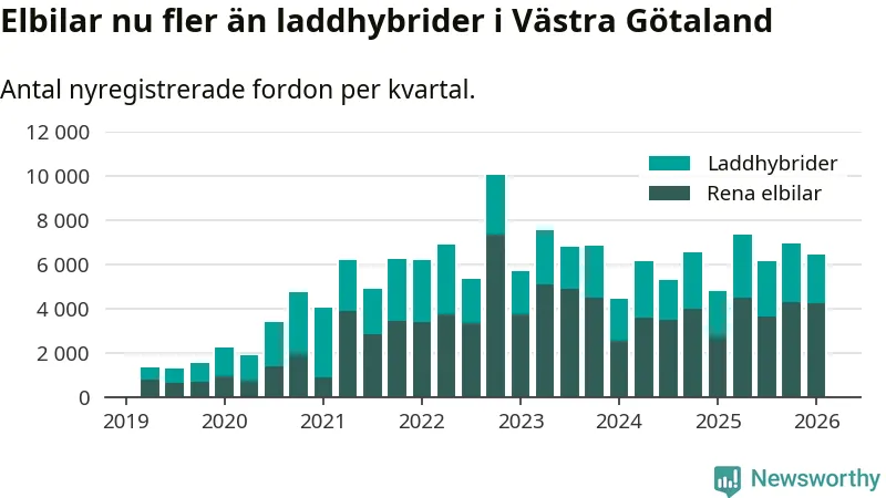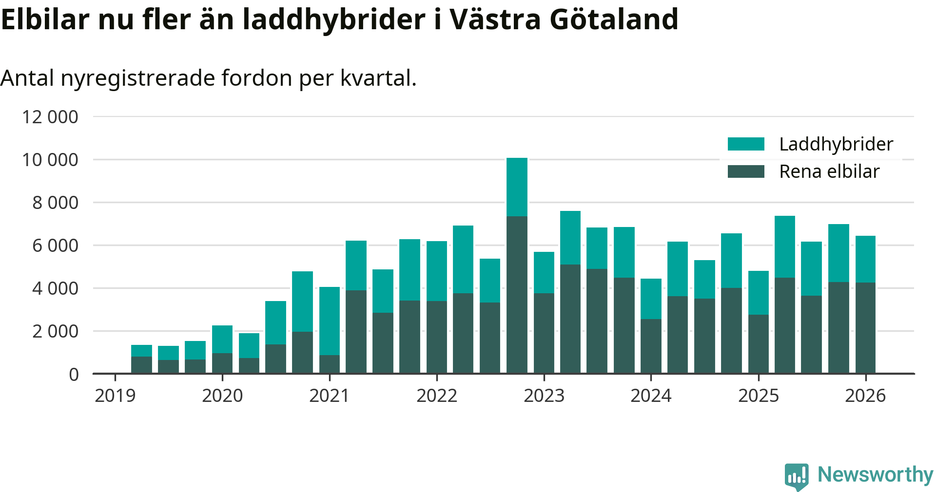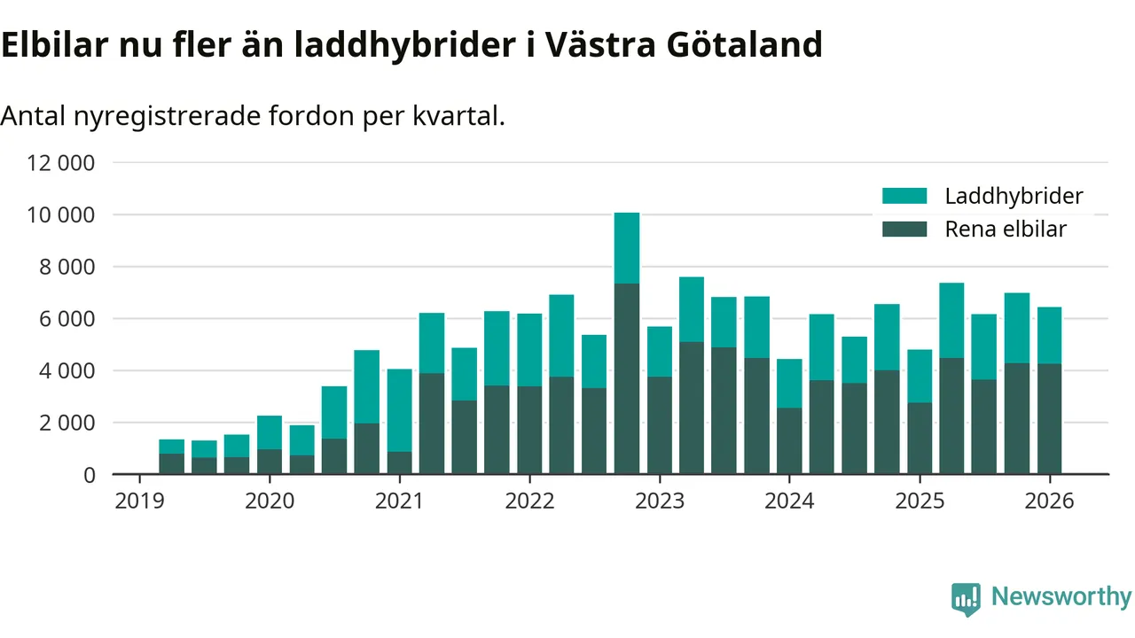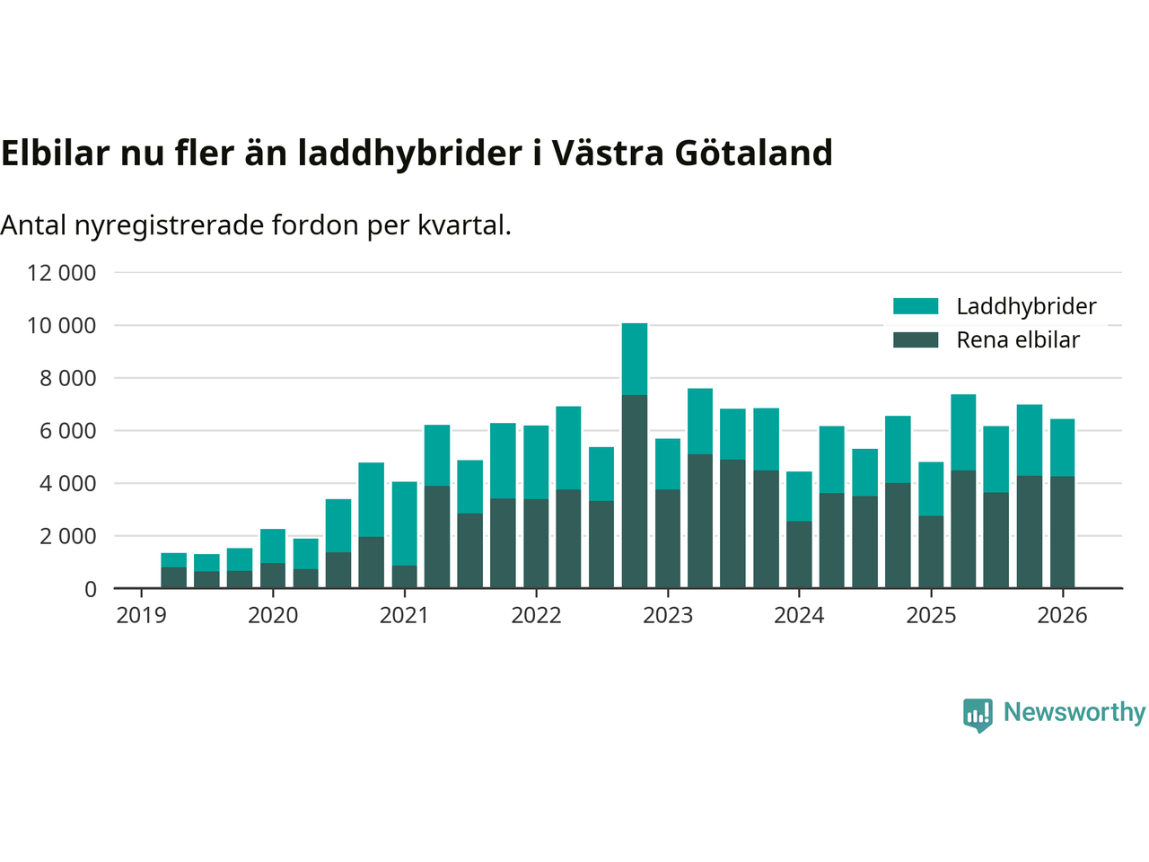 Under första kvartalet 2026 var 64 procent av alla nyregistrerade personbilar i Västra Götaland laddbara (sammanlagt registrerades 10 105 nya bilar). Merparten av de laddbara bilarna var rena elbilar (42 procent av alla).