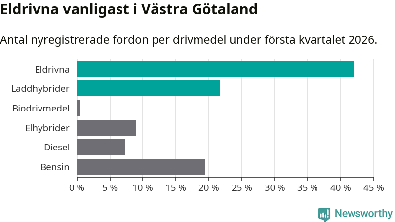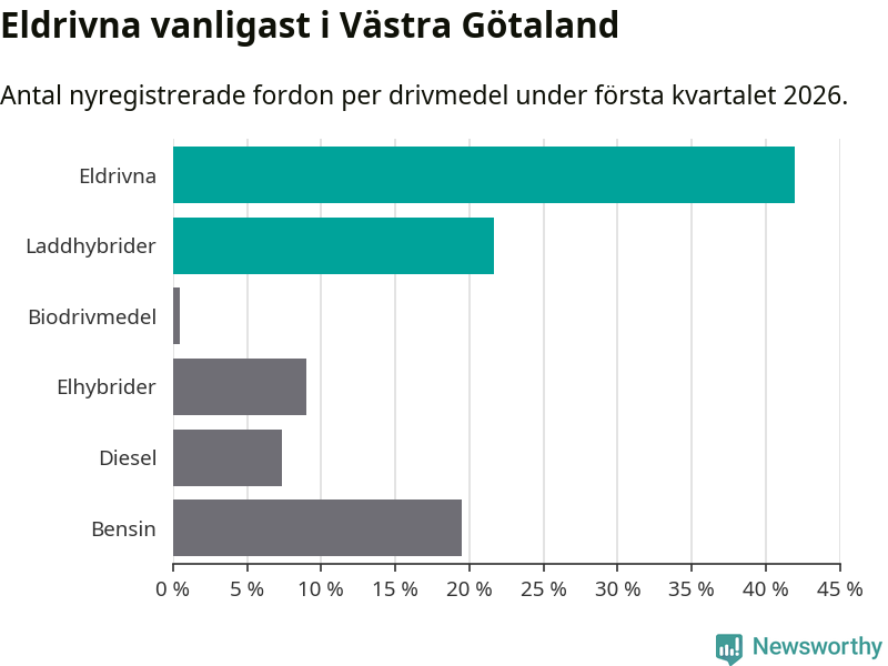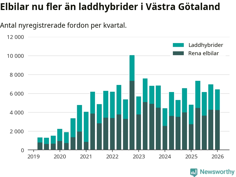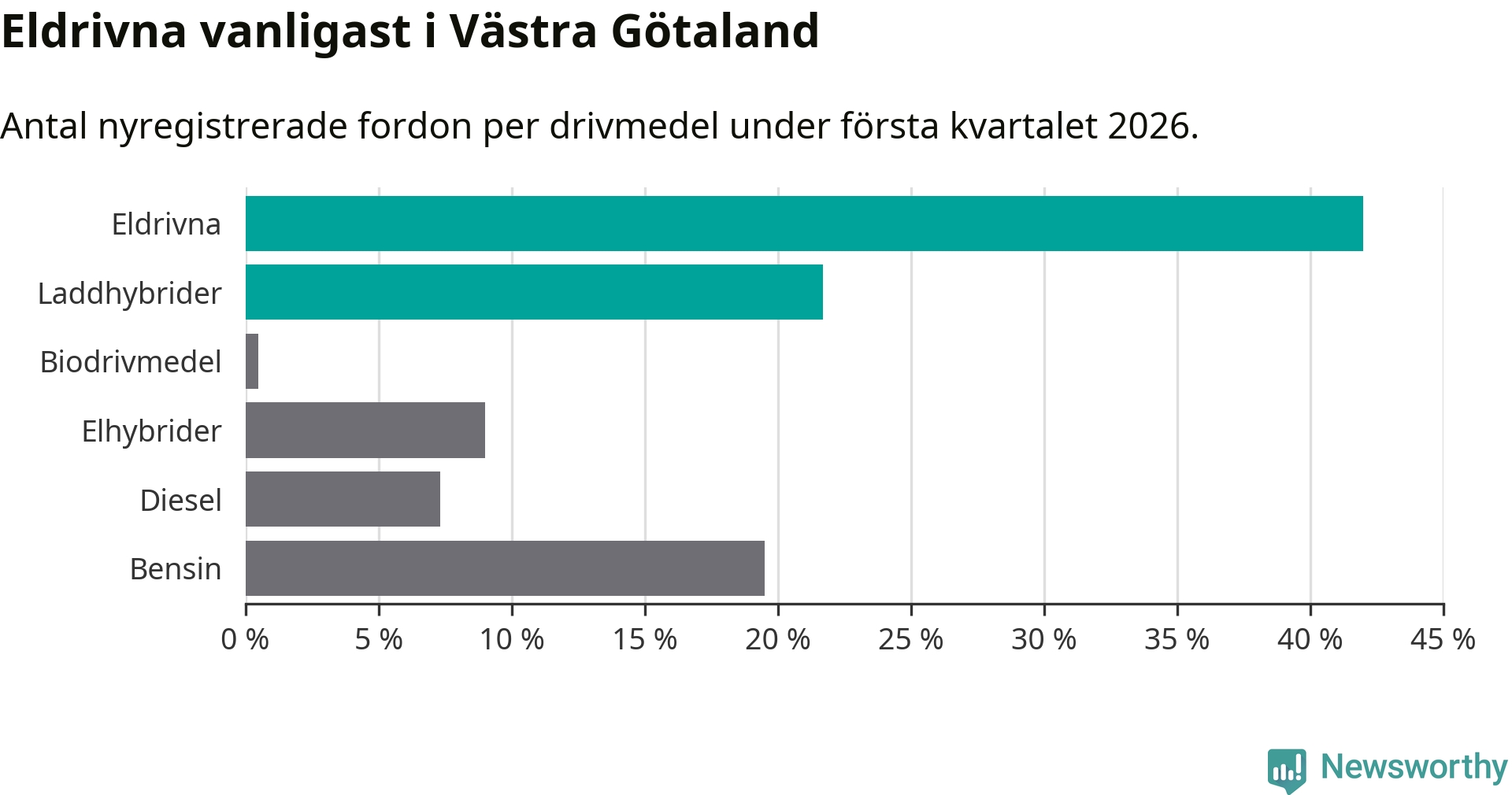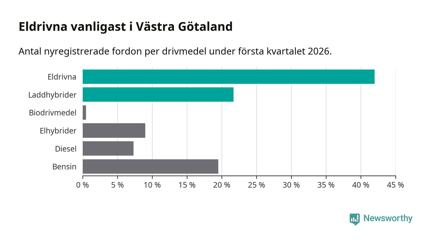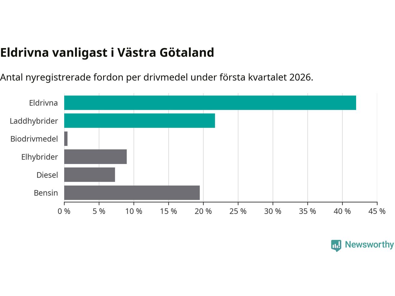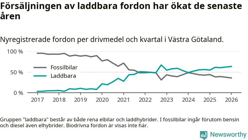 Under första kvartalet 2026 var 64 procent av alla nyregistrerade personbilar i Västra Götaland laddbara (sammanlagt registrerades 10 105 nya bilar). Merparten av de laddbara bilarna var rena elbilar (42 procent av alla).
