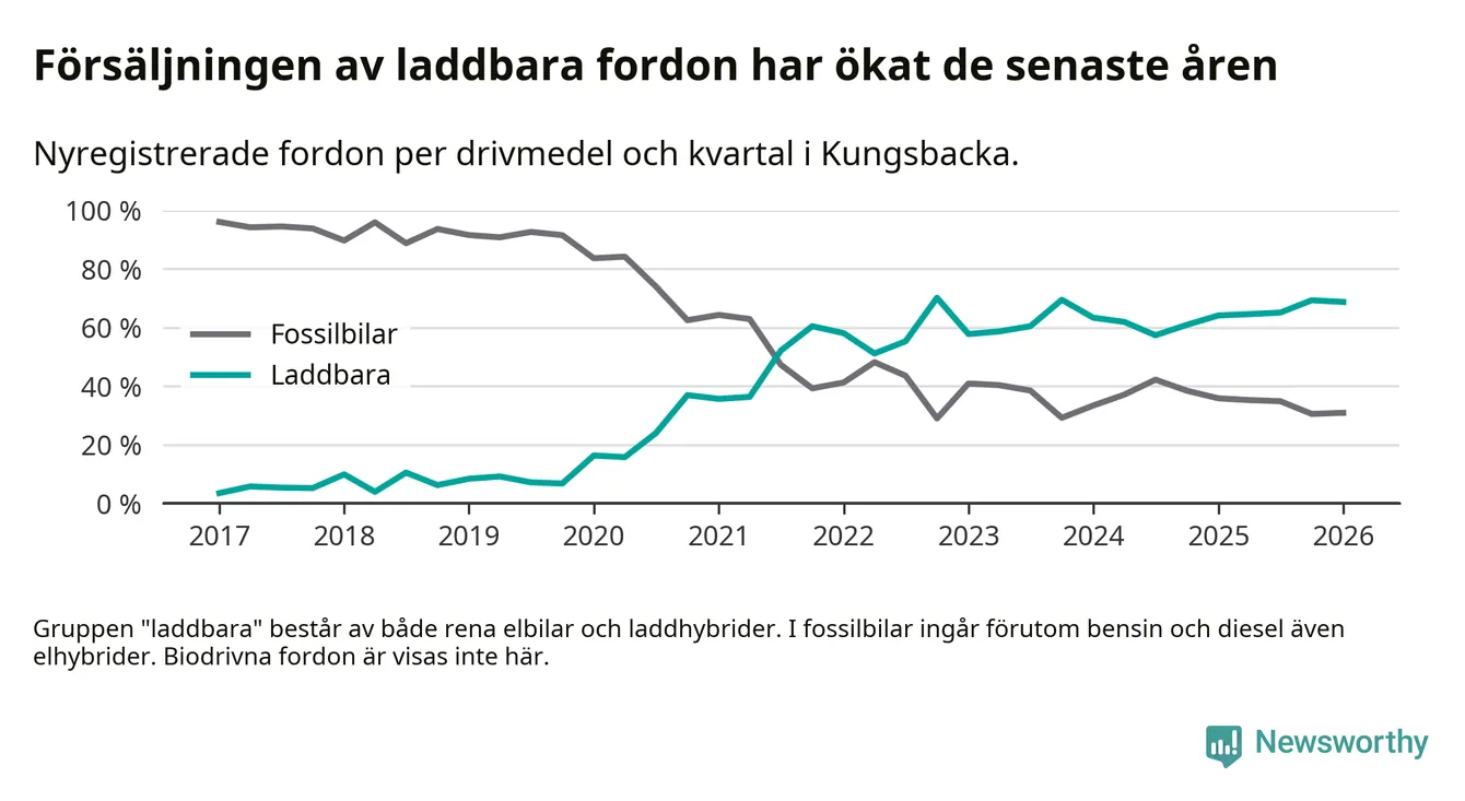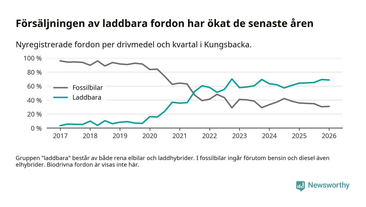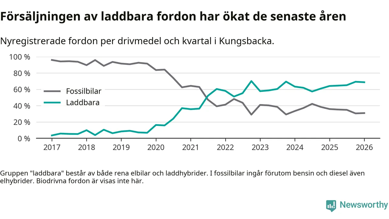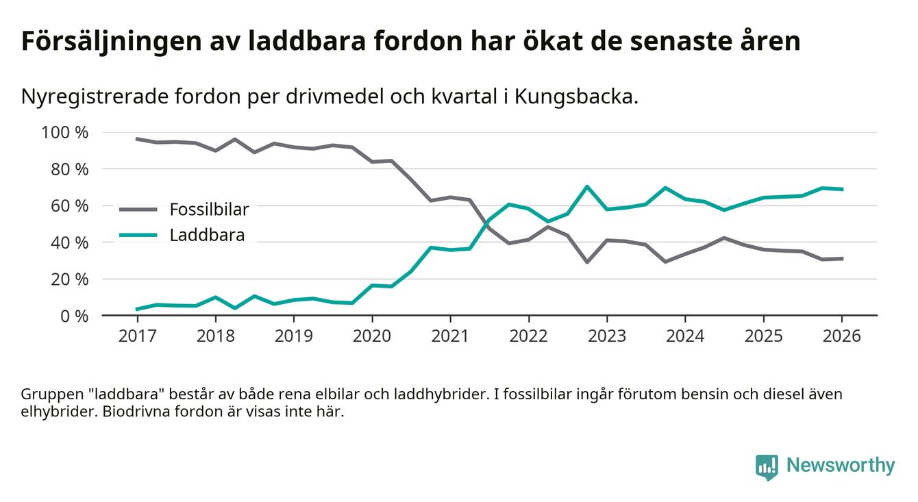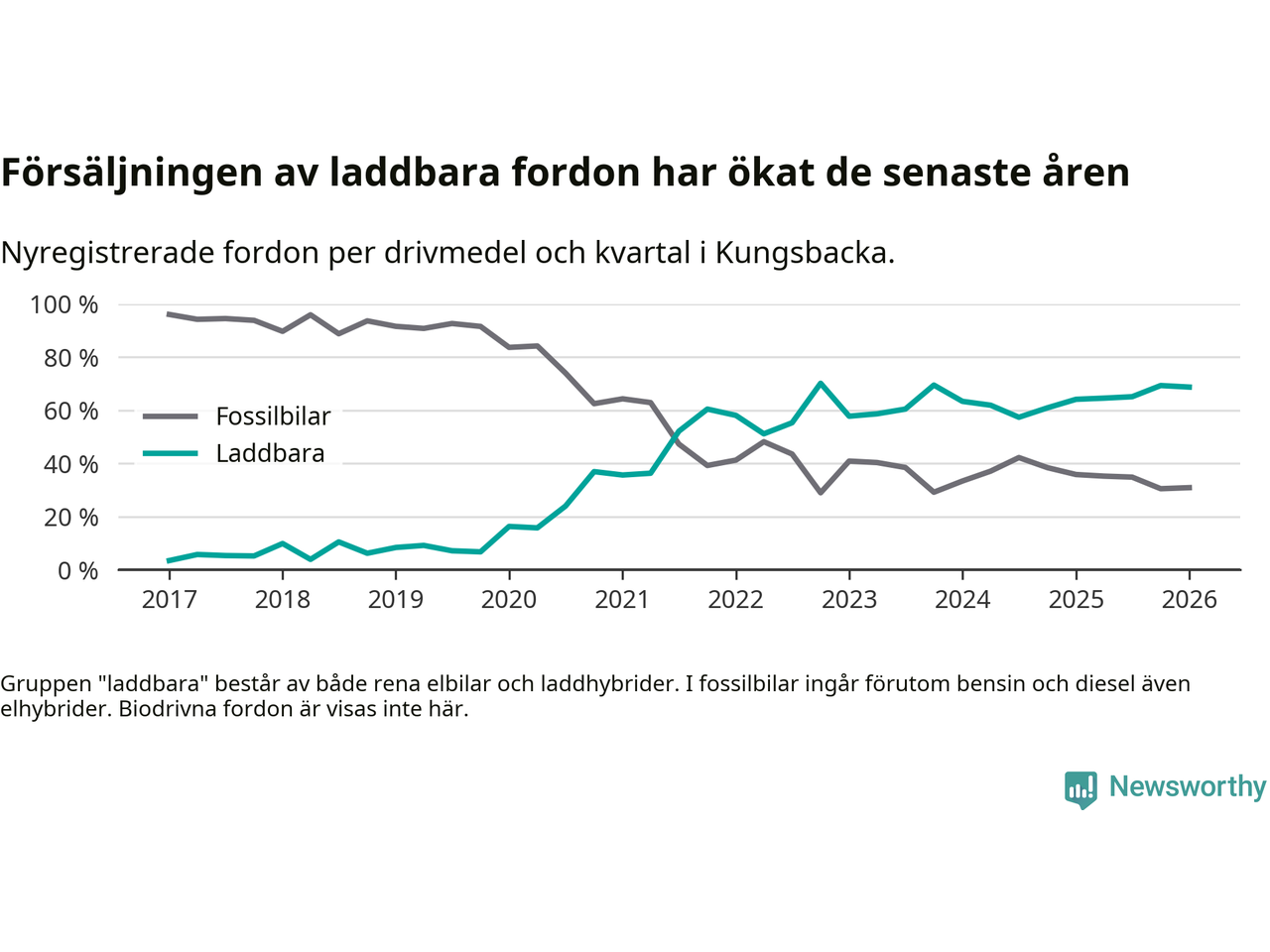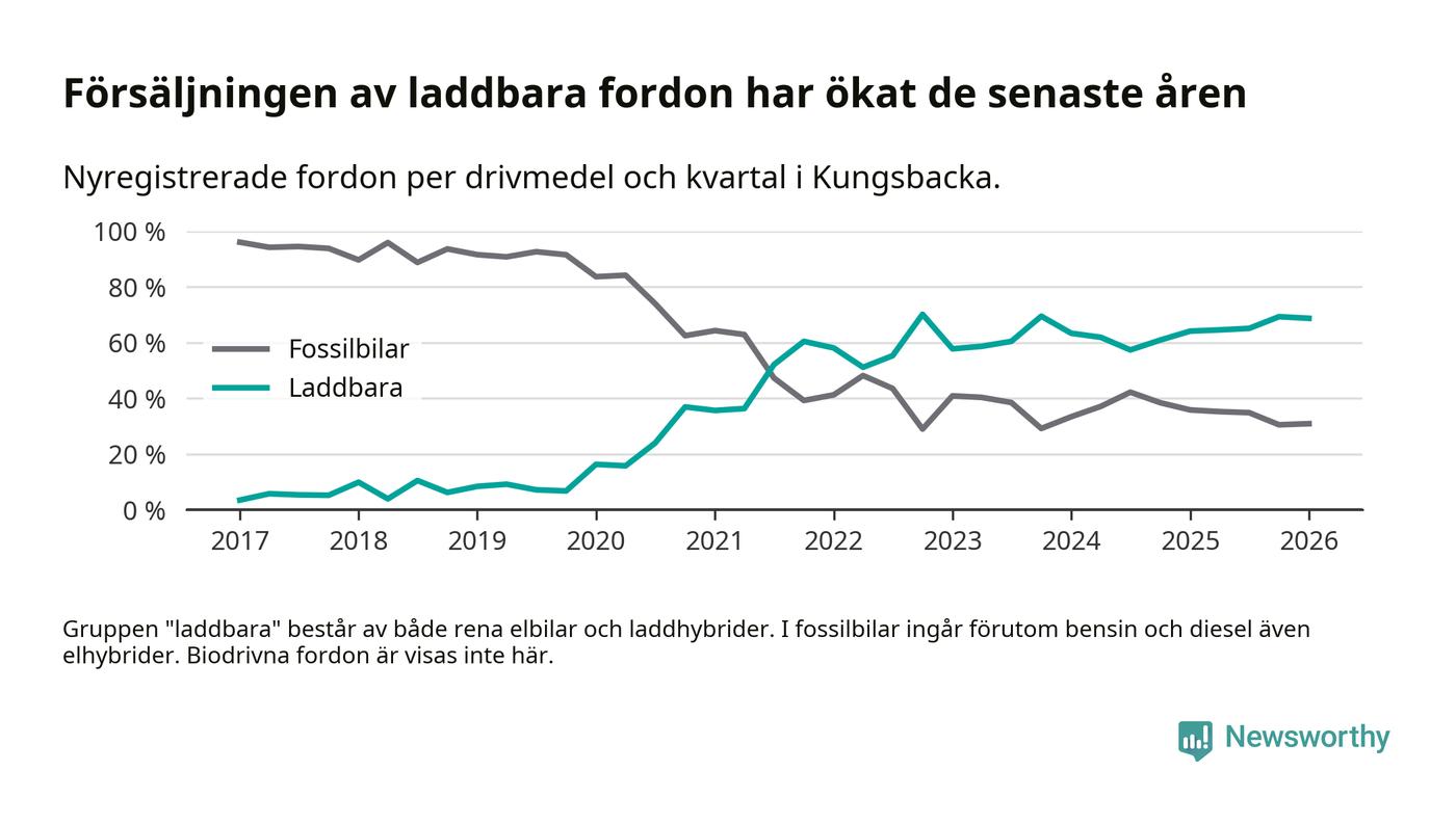 Under första kvartalet 2026 var 69 procent av alla nyregistrerade personbilar i Kungsbacka laddbara (sammanlagt registrerades 592 nya bilar). Merparten av de laddbara bilarna var rena elbilar (48 procent av alla).