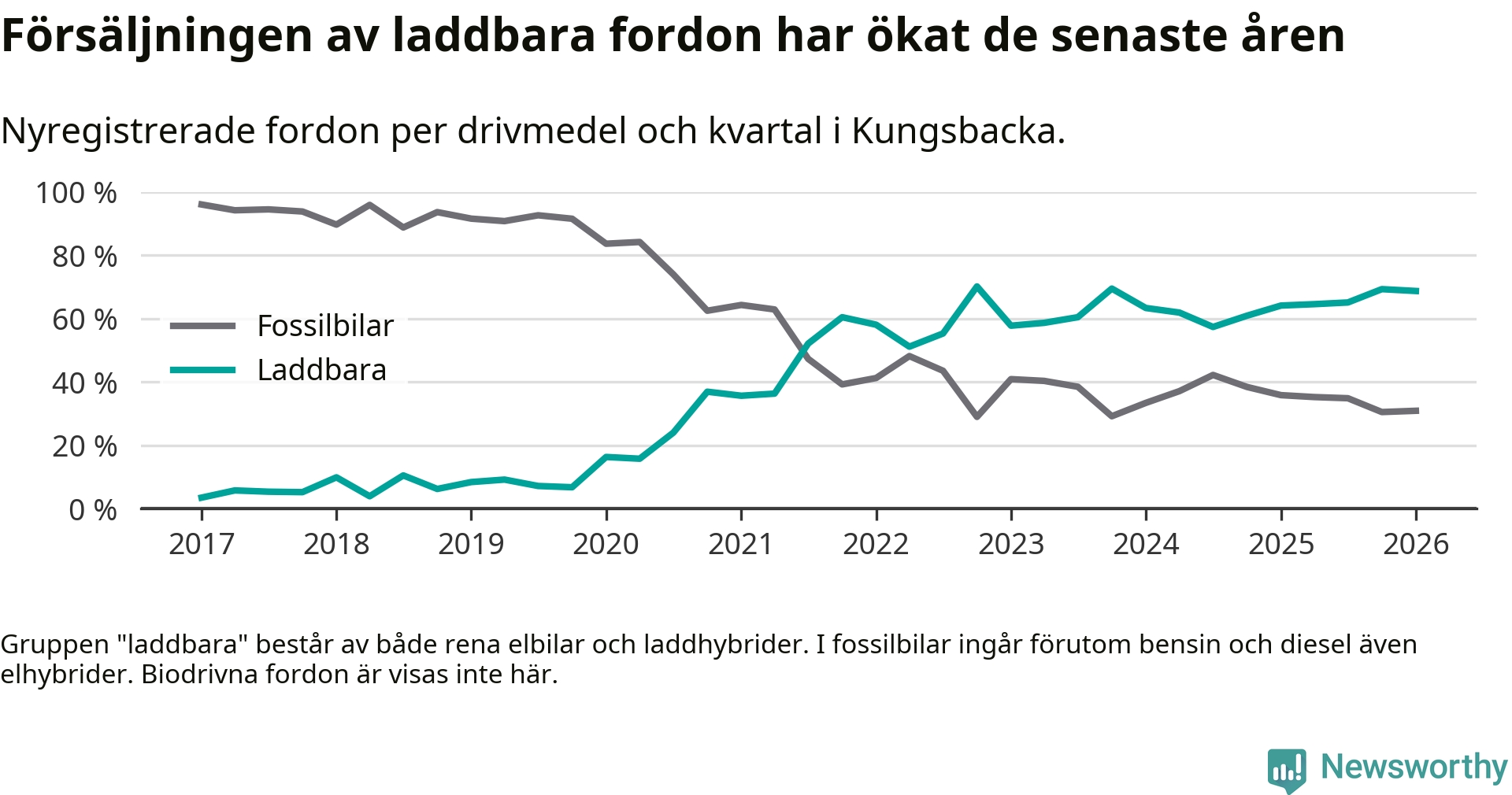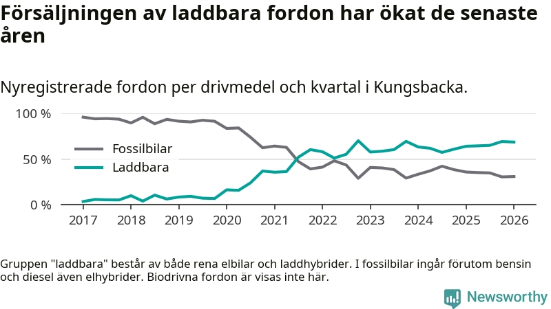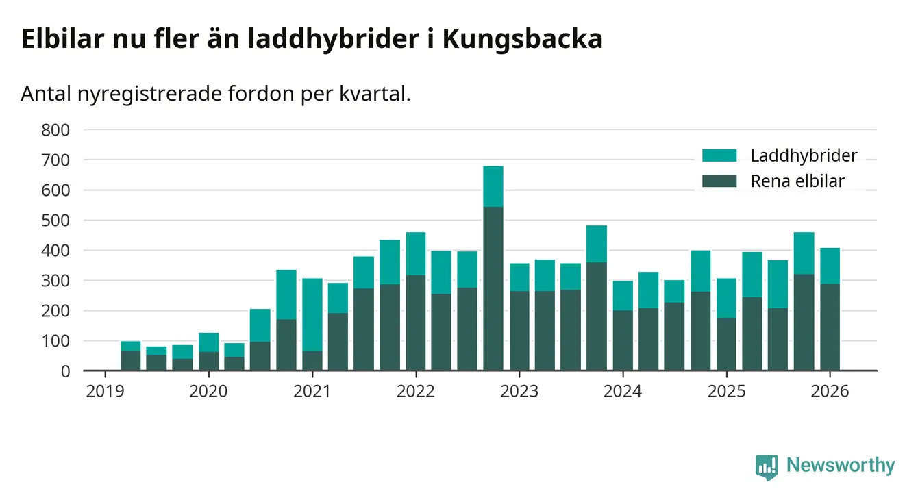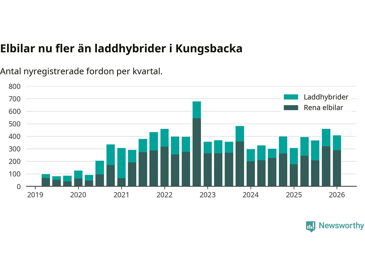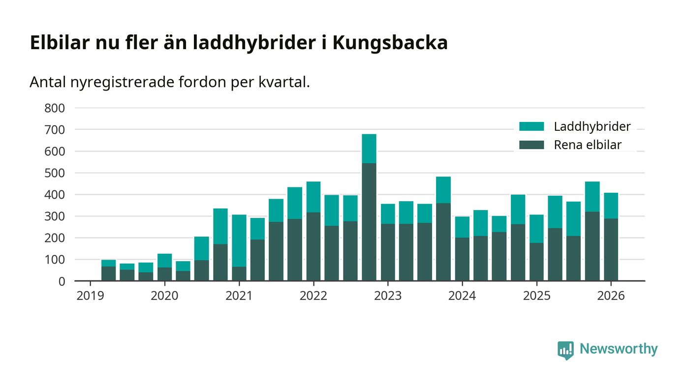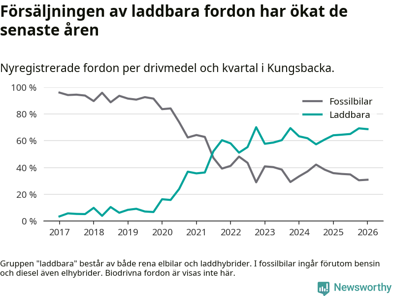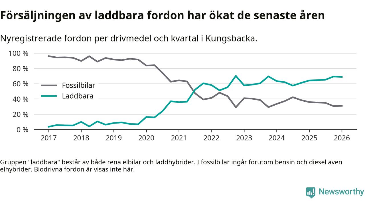 Under första kvartalet 2026 var 69 procent av alla nyregistrerade personbilar i Kungsbacka laddbara (sammanlagt registrerades 592 nya bilar). Merparten av de laddbara bilarna var rena elbilar (48 procent av alla).