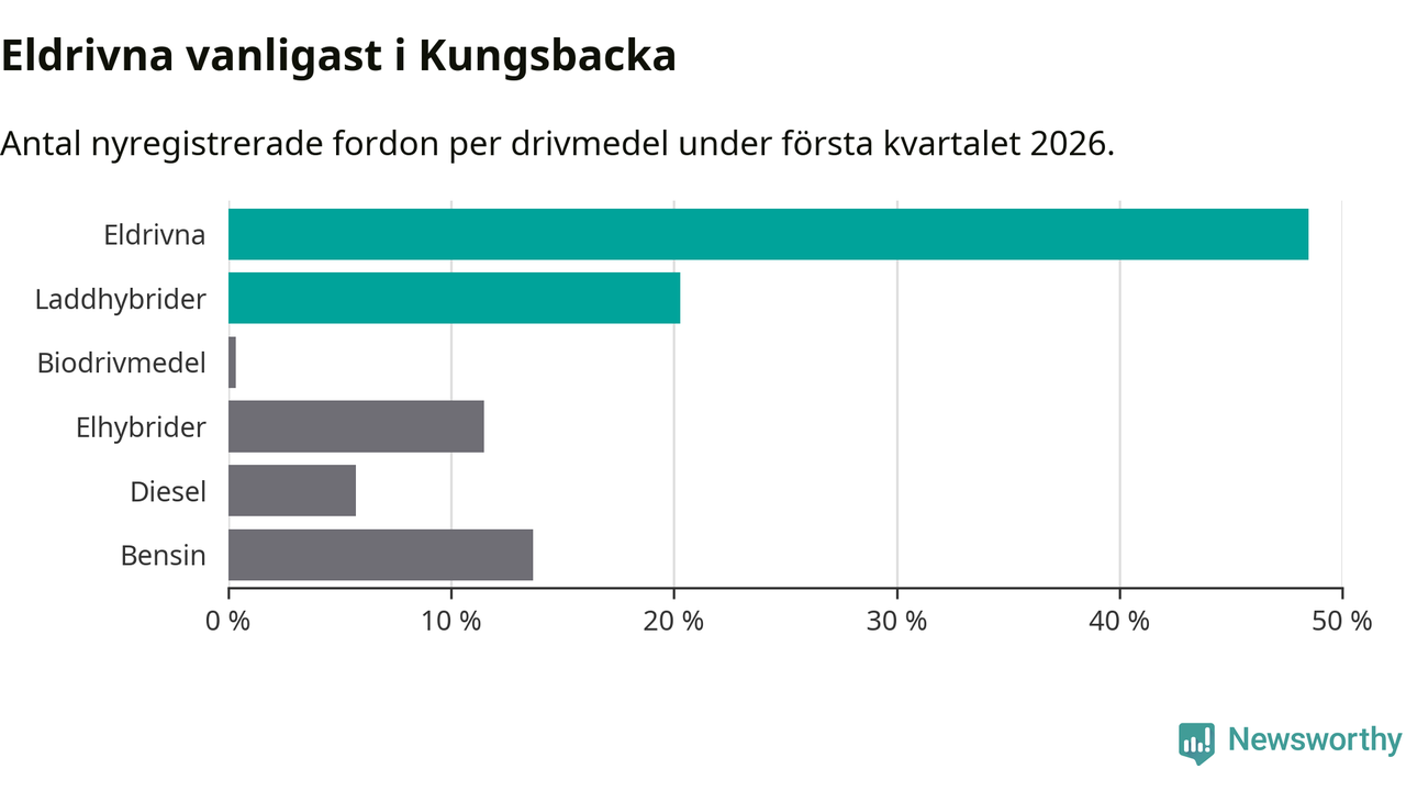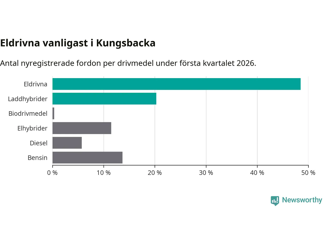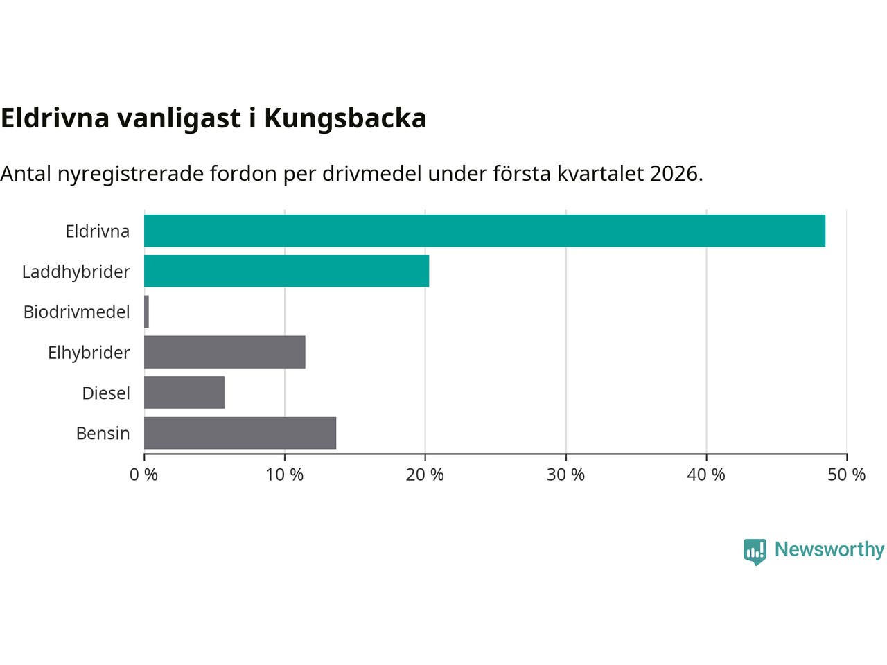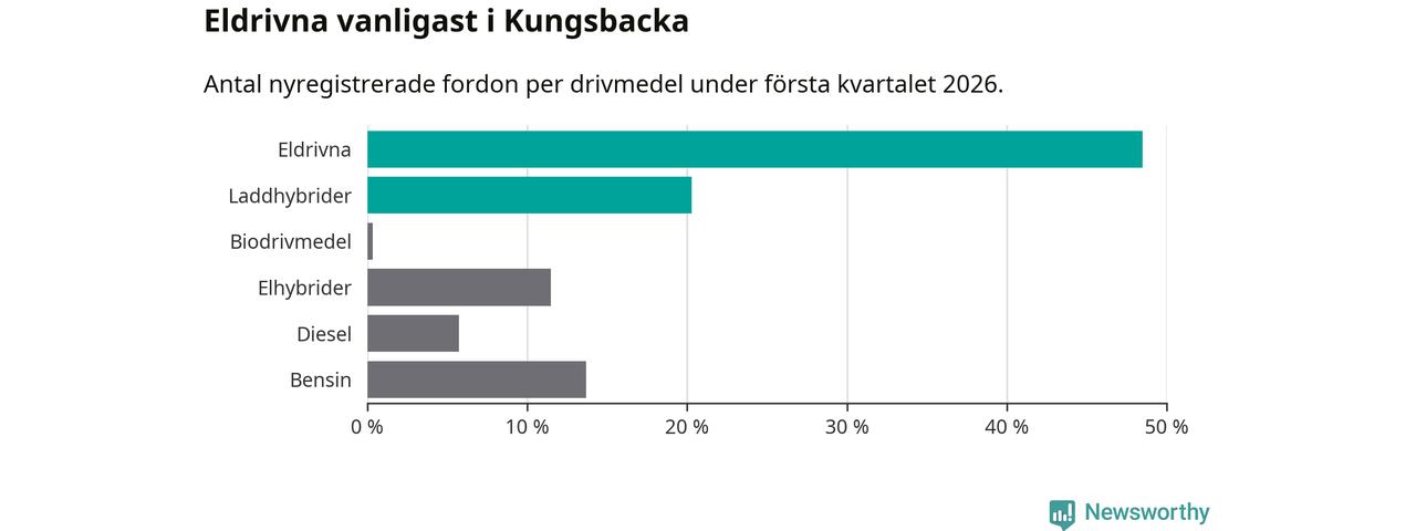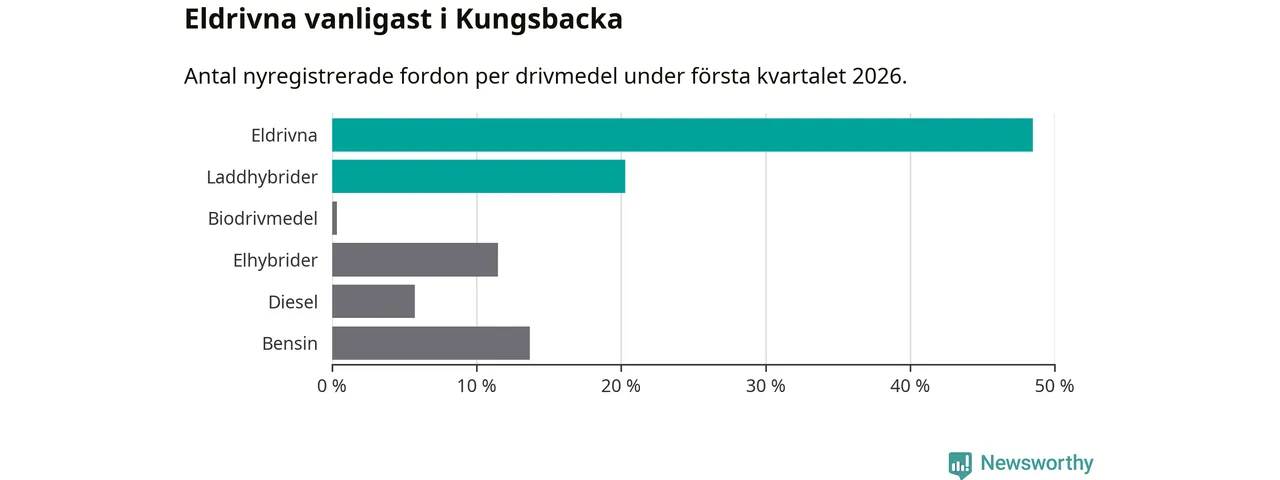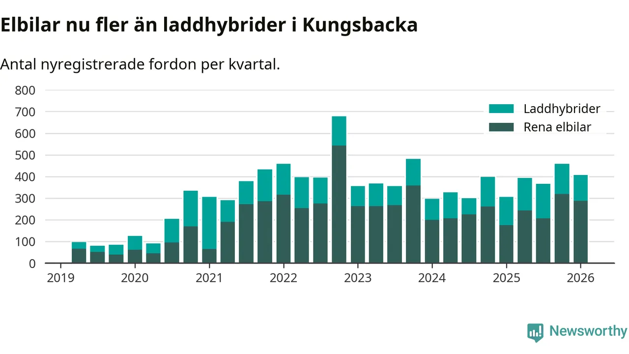 Under första kvartalet 2026 var 69 procent av alla nyregistrerade personbilar i Kungsbacka laddbara (sammanlagt registrerades 592 nya bilar). Merparten av de laddbara bilarna var rena elbilar (48 procent av alla).