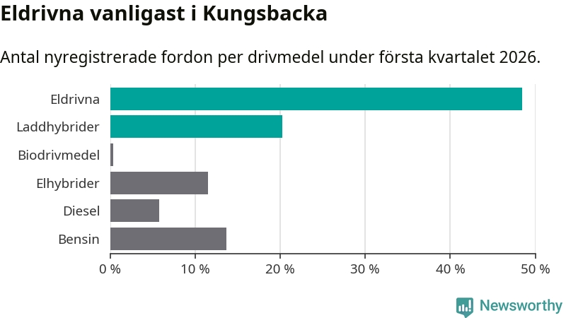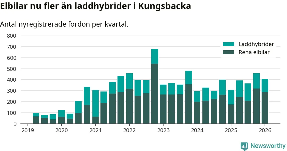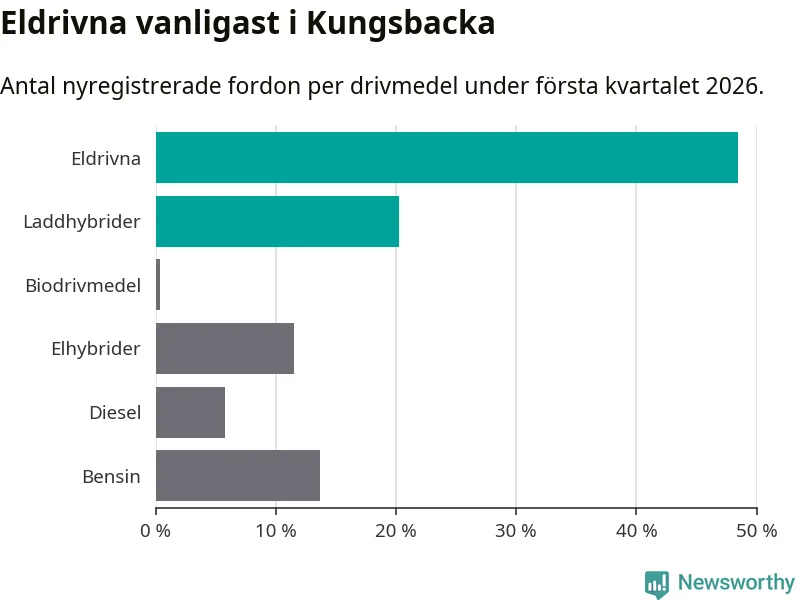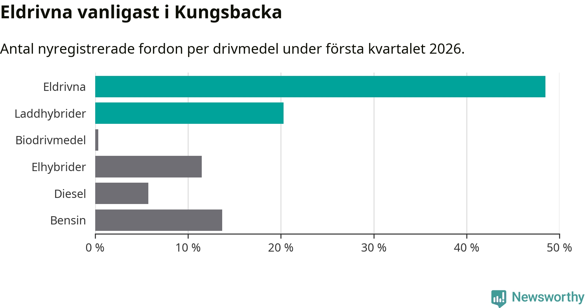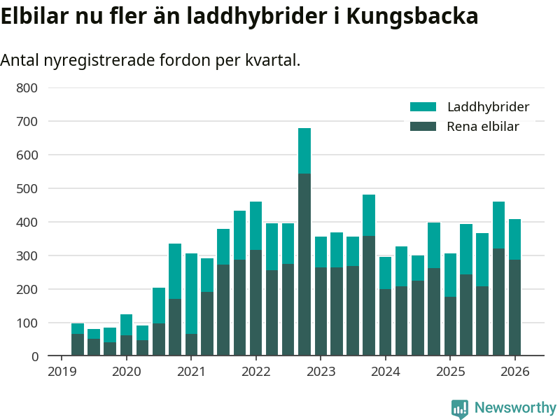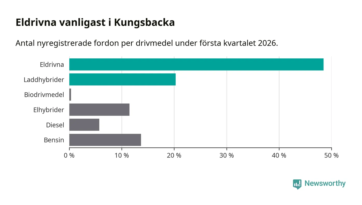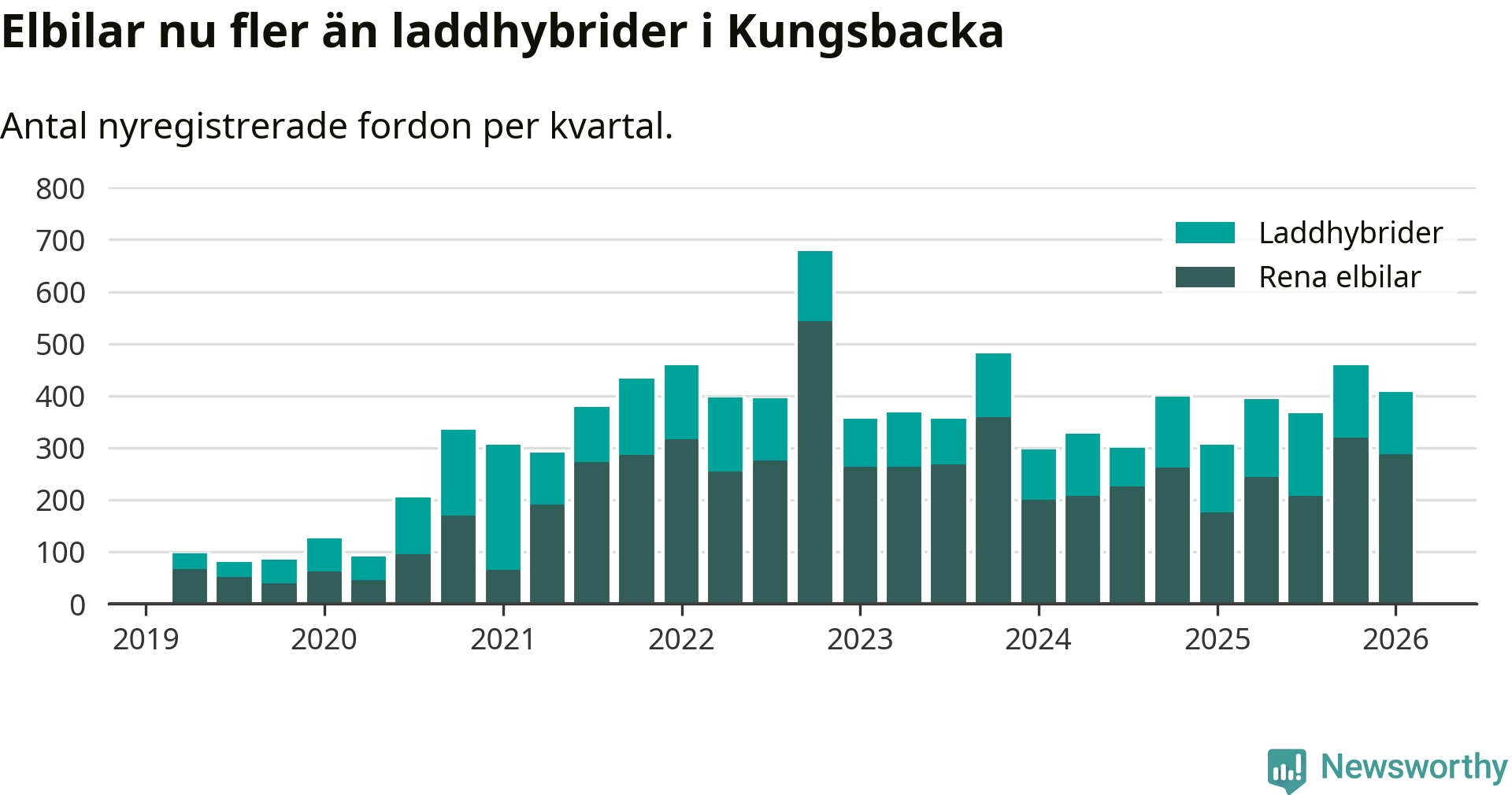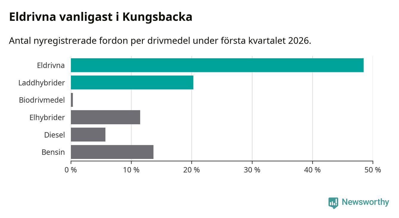 Under första kvartalet 2026 var 69 procent av alla nyregistrerade personbilar i Kungsbacka laddbara (sammanlagt registrerades 592 nya bilar). Merparten av de laddbara bilarna var rena elbilar (48 procent av alla).