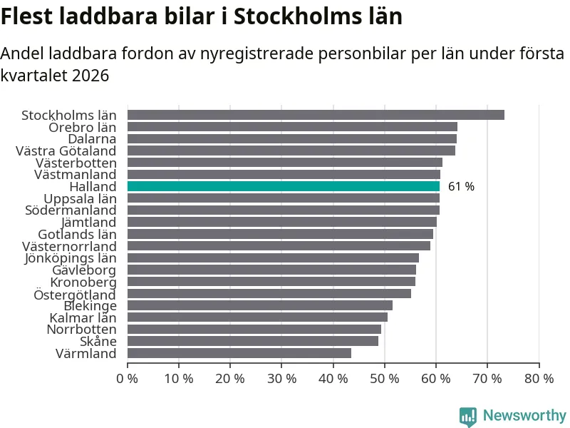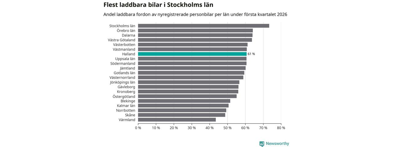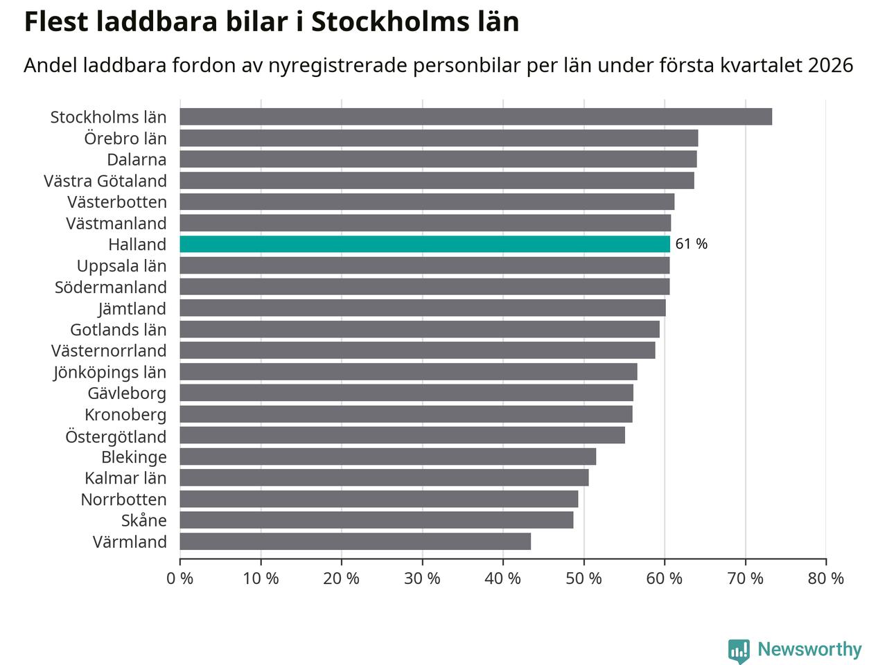 I hela landet var 63 procent av alla nya bilar laddbara under första kvartalet. Det är något färre än föregående kvartal (−1,4 procentenheter). I Hallands län var 61 procent av de nya bilarna laddbara, vilket är något färre än föregående kvartal (−1,2 procentenheter).