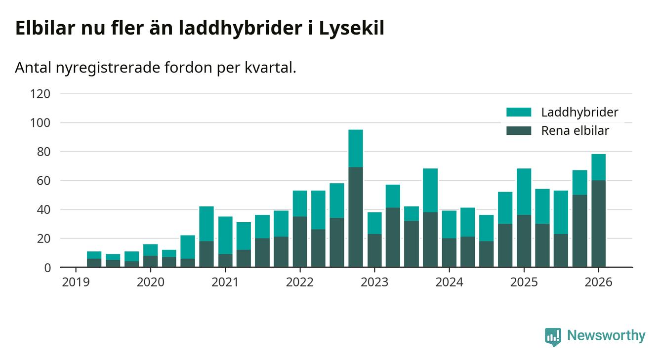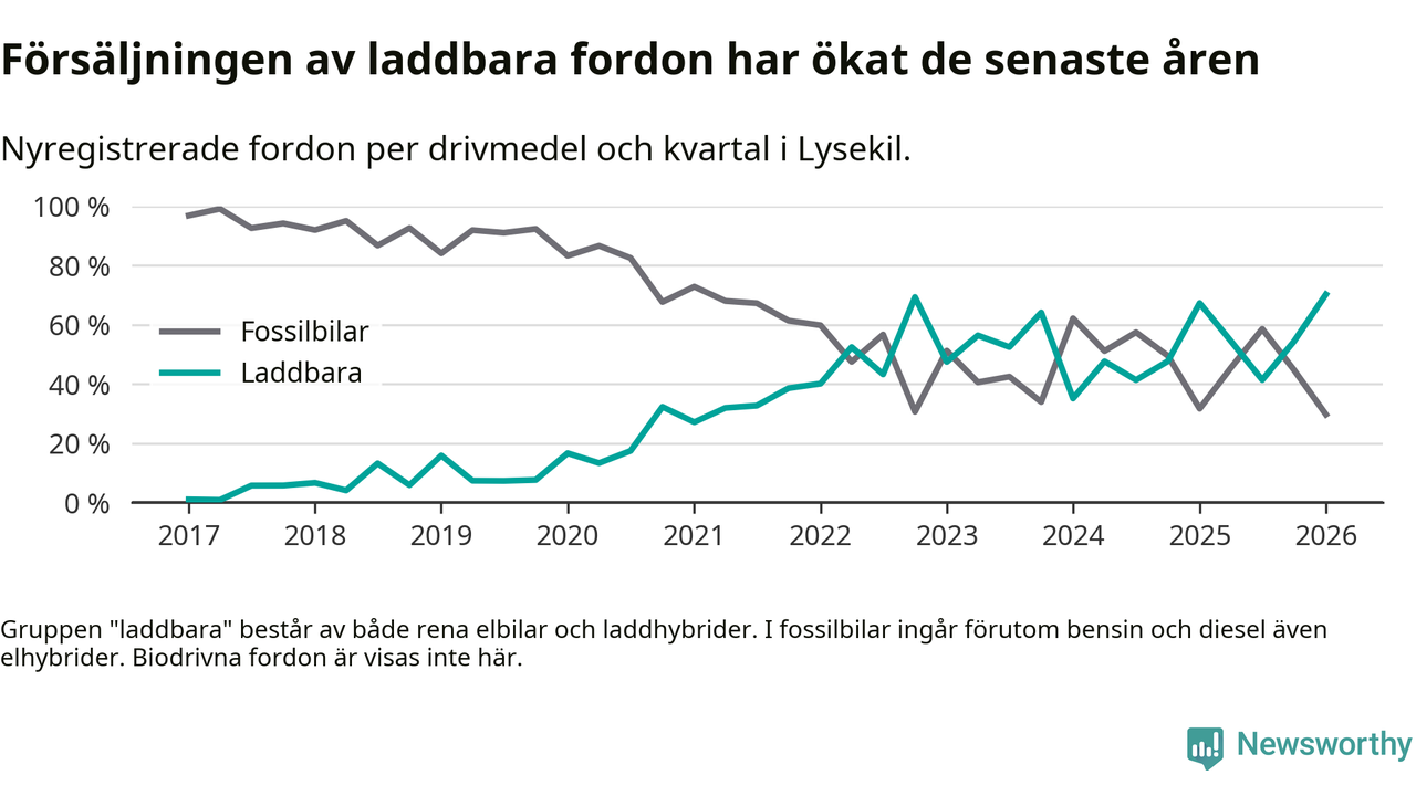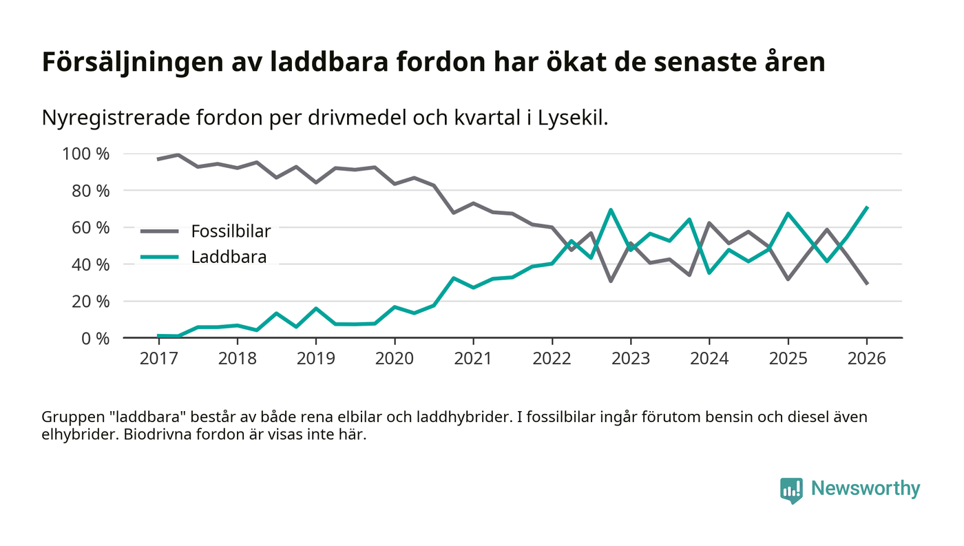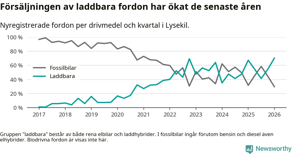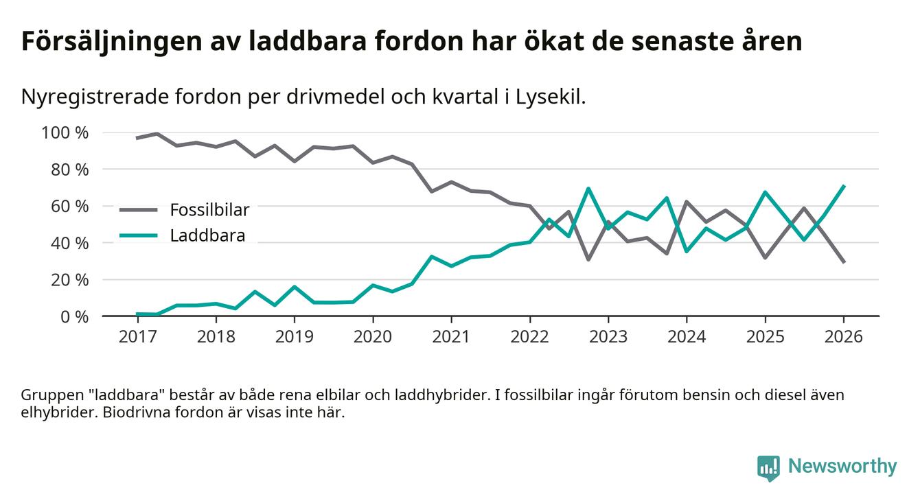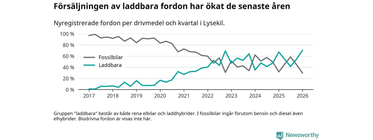 Under första kvartalet 2026 var 70 procent av alla nyregistrerade personbilar i Lysekil laddbara (sammanlagt registrerades 111 nya bilar). Merparten av de laddbara bilarna var rena elbilar (54 procent av alla).