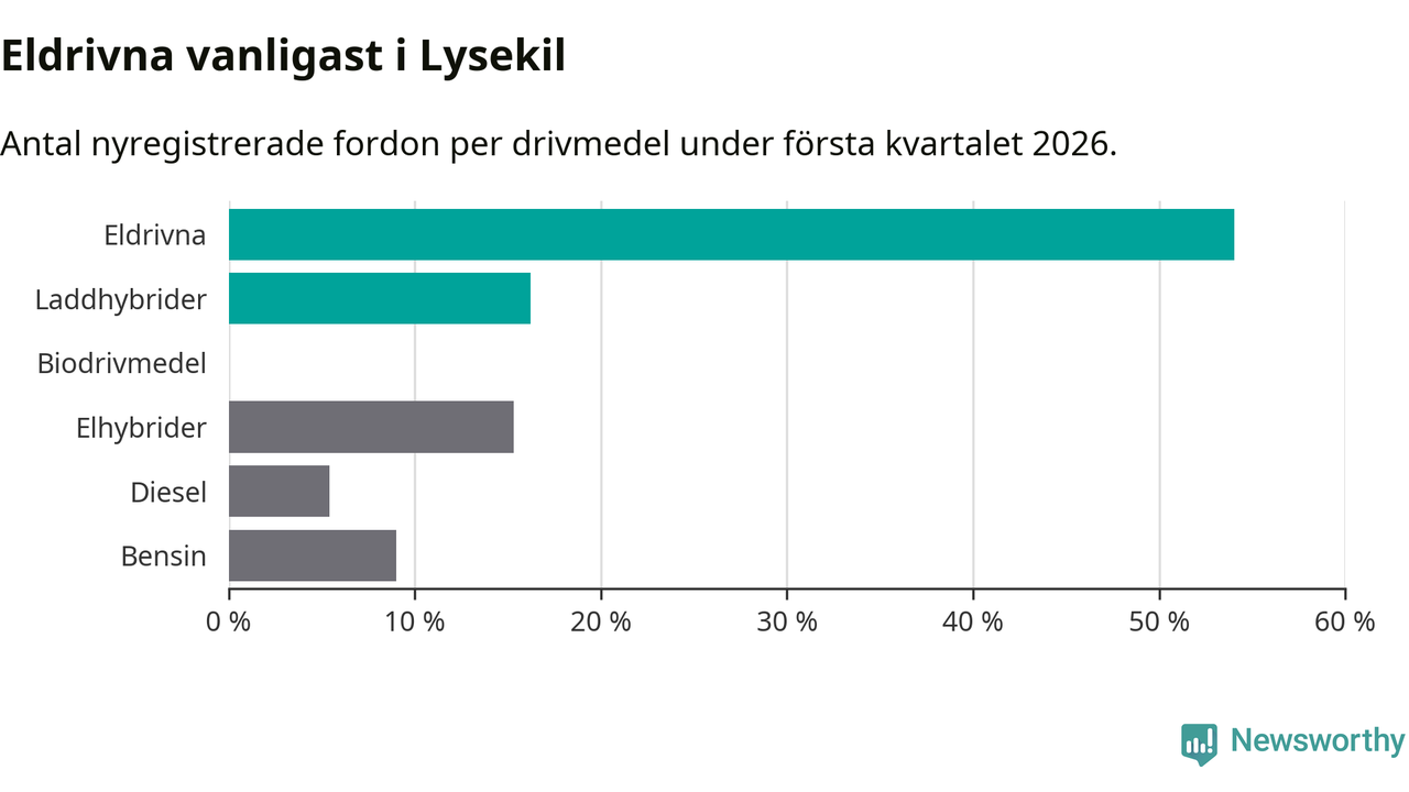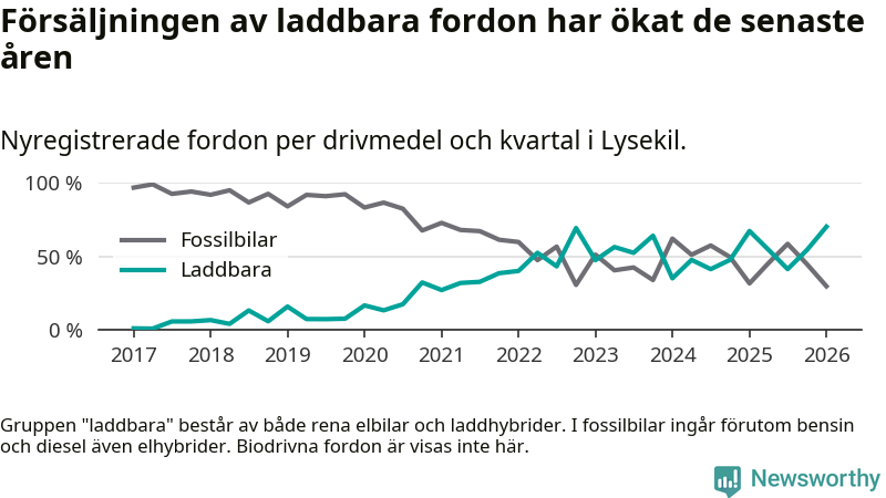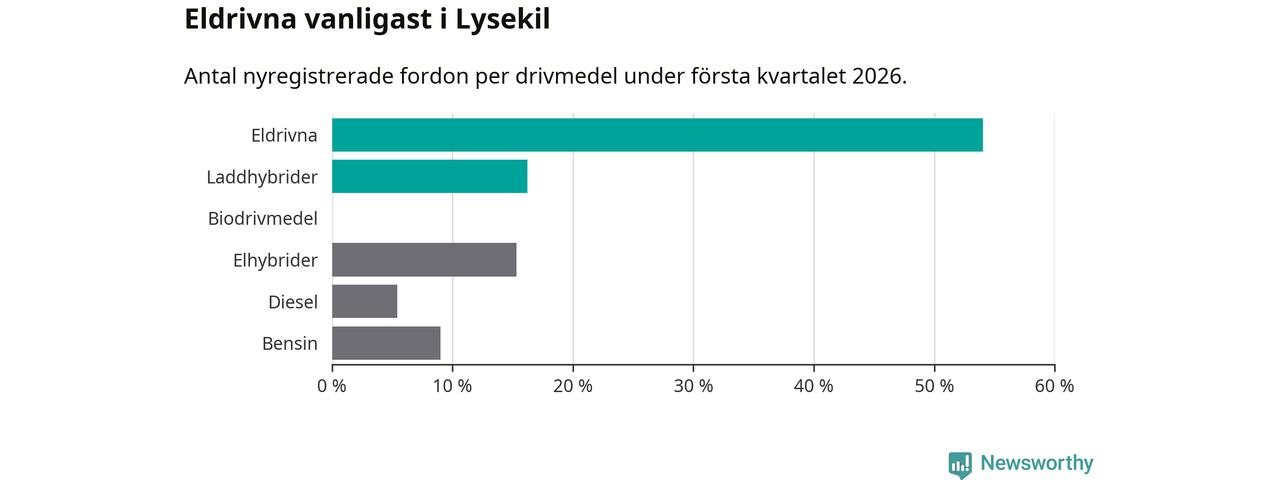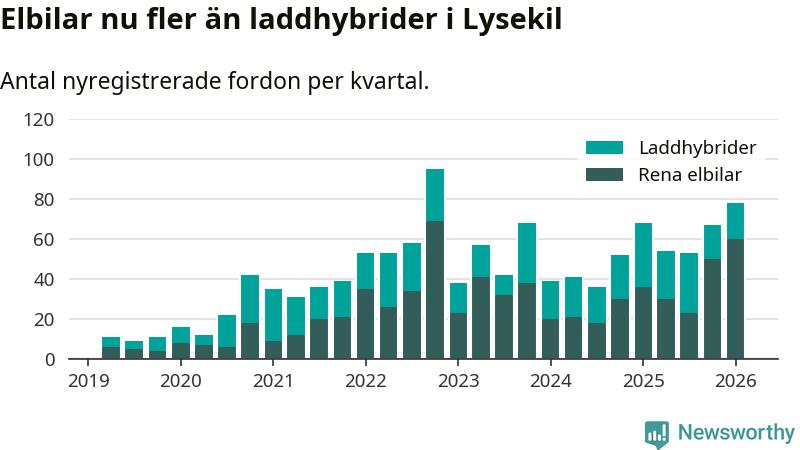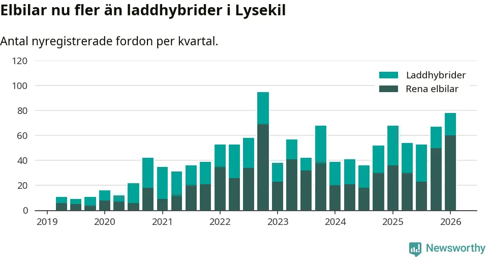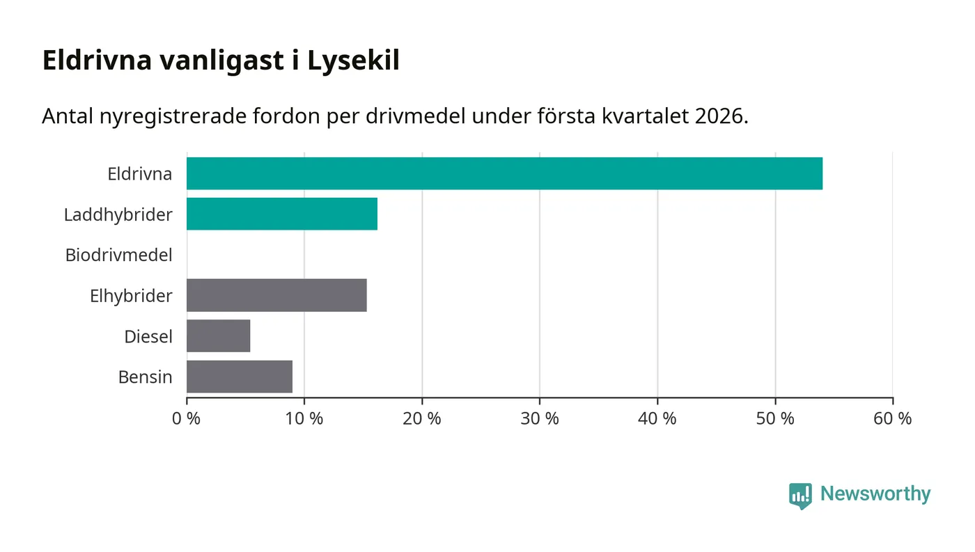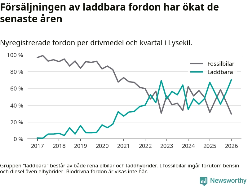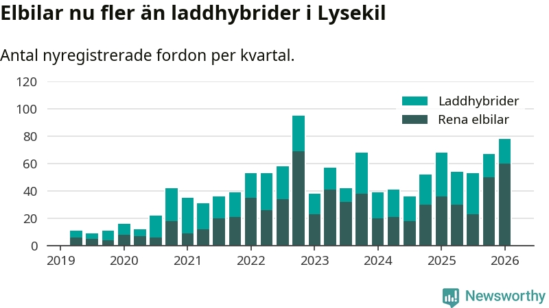 Under första kvartalet 2026 var 70 procent av alla nyregistrerade personbilar i Lysekil laddbara (sammanlagt registrerades 111 nya bilar). Merparten av de laddbara bilarna var rena elbilar (54 procent av alla).